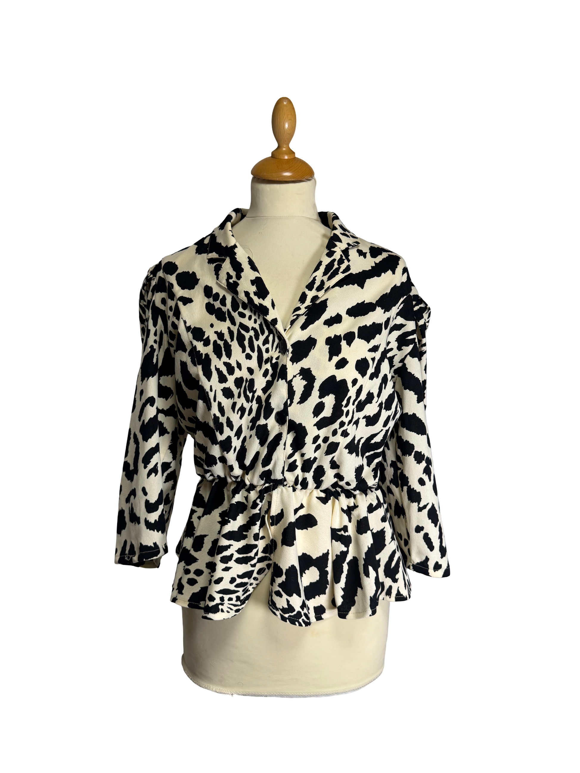 Blouse à motifs des années 80, taille marquée, fermeture par deux boutons, beige et noir, manches mi longue.