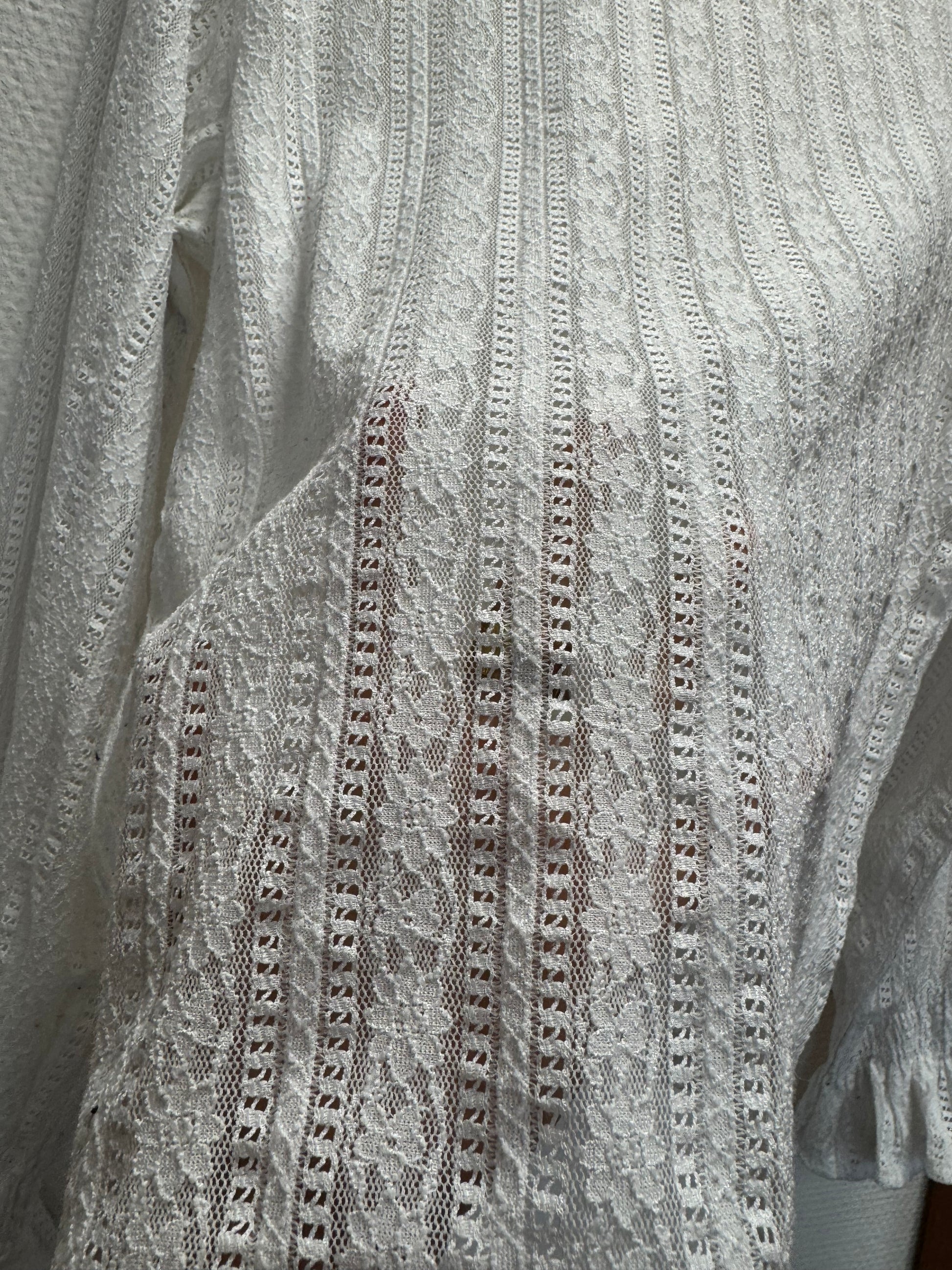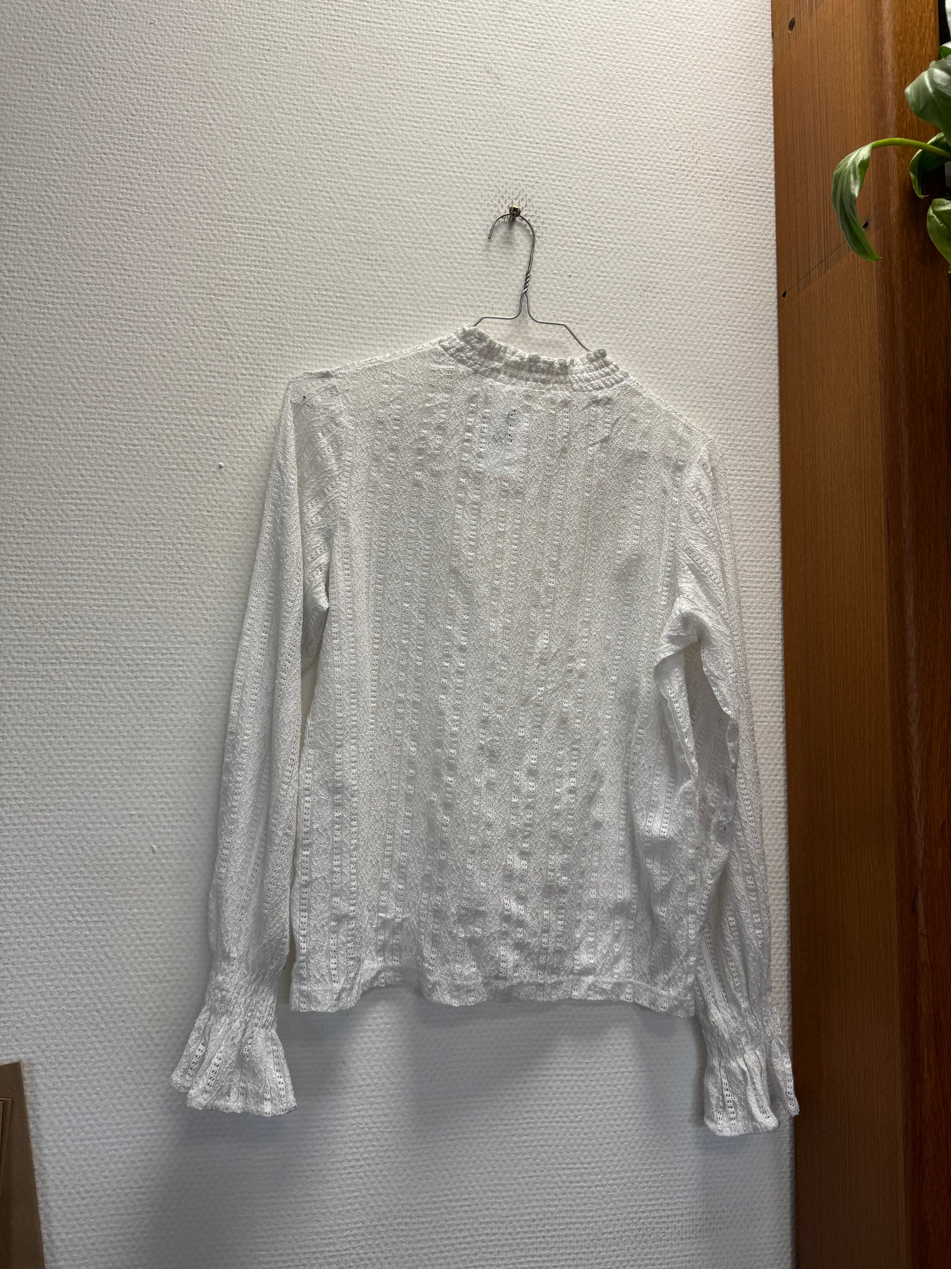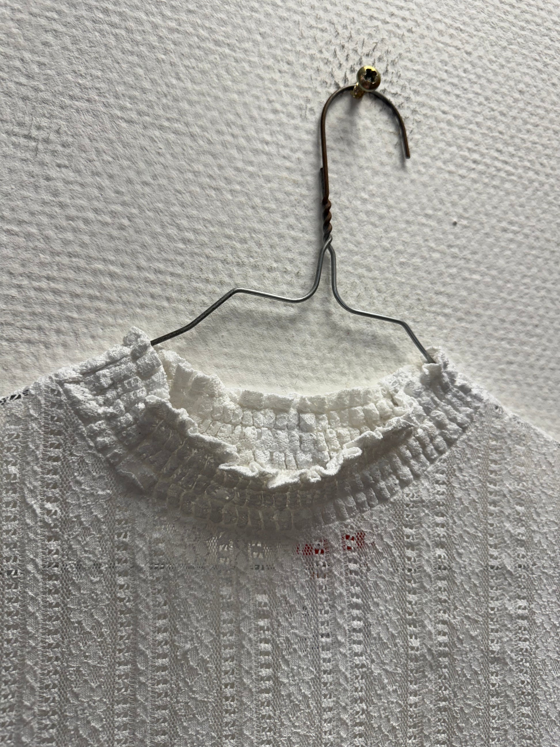 Blouse à manche longue, dentelle blanche ajourée, col haut, légèrement transparente.