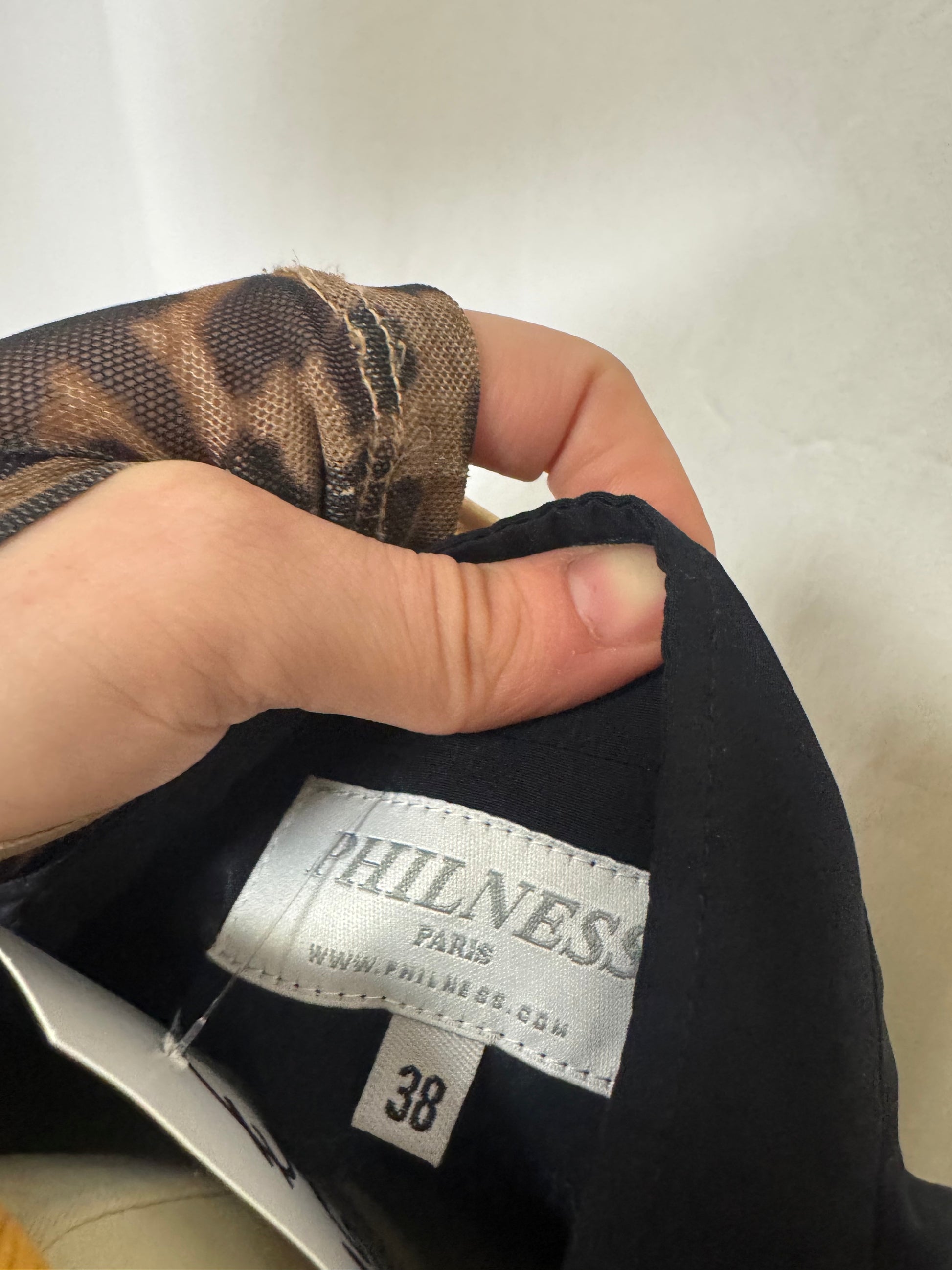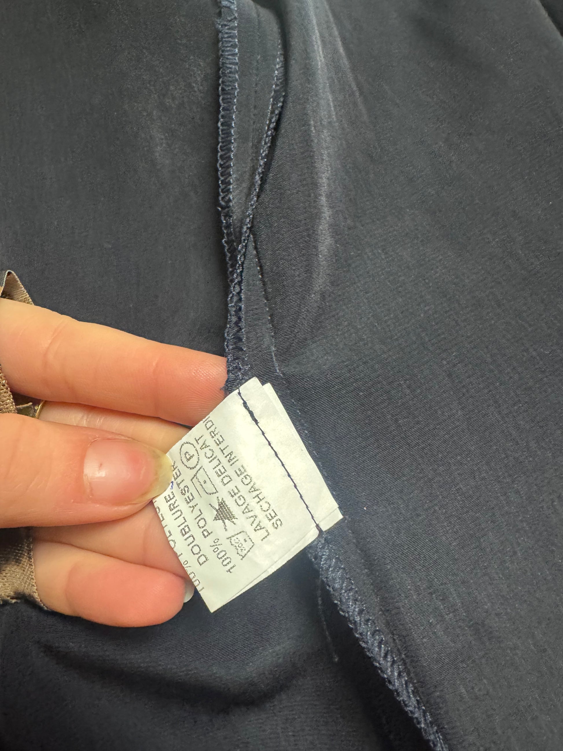 Blouse longue, fermeture par un lien au centre, manches longues, épaulettes.
