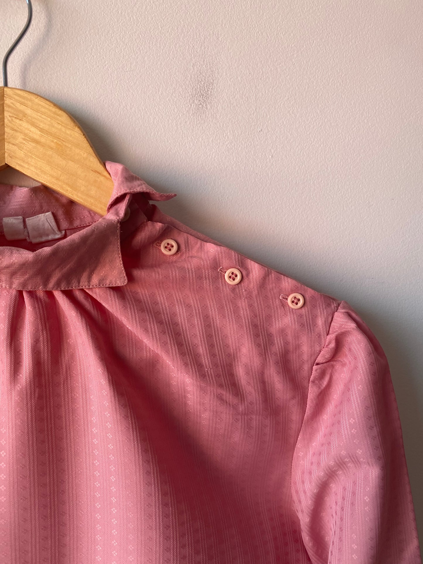 Blouse à motif rose des années 70, motif géométrique, quatre boutons sur l'épaule, légèrement plissé sur le haut des manches, col haut.