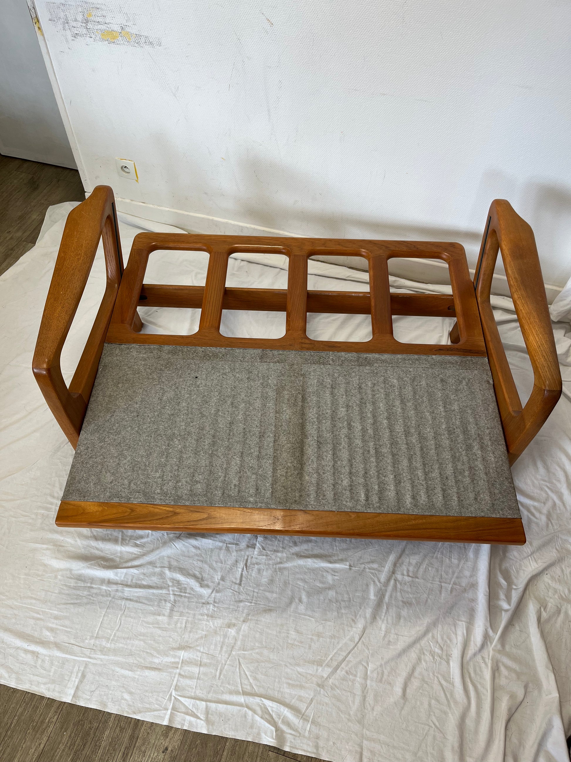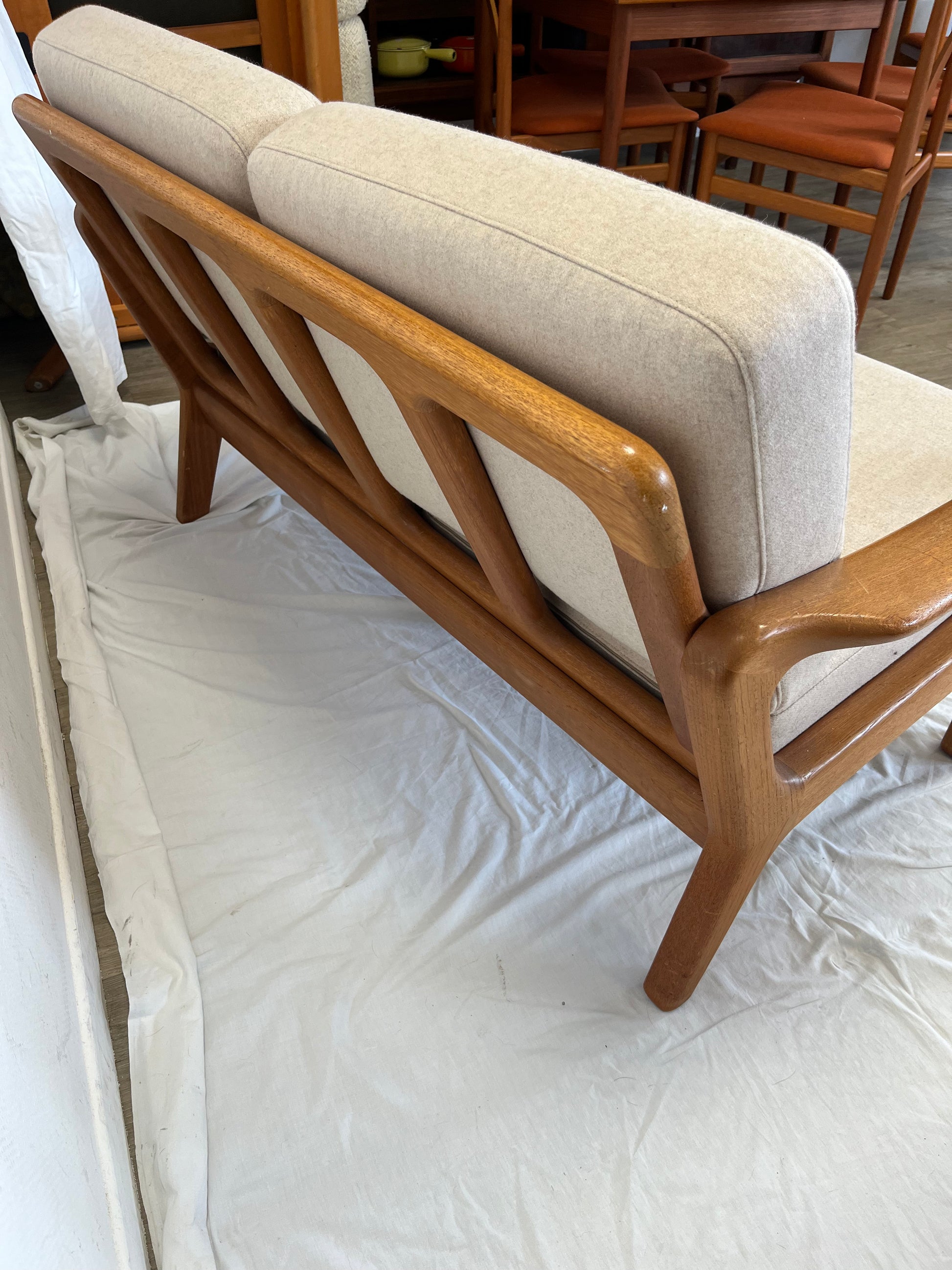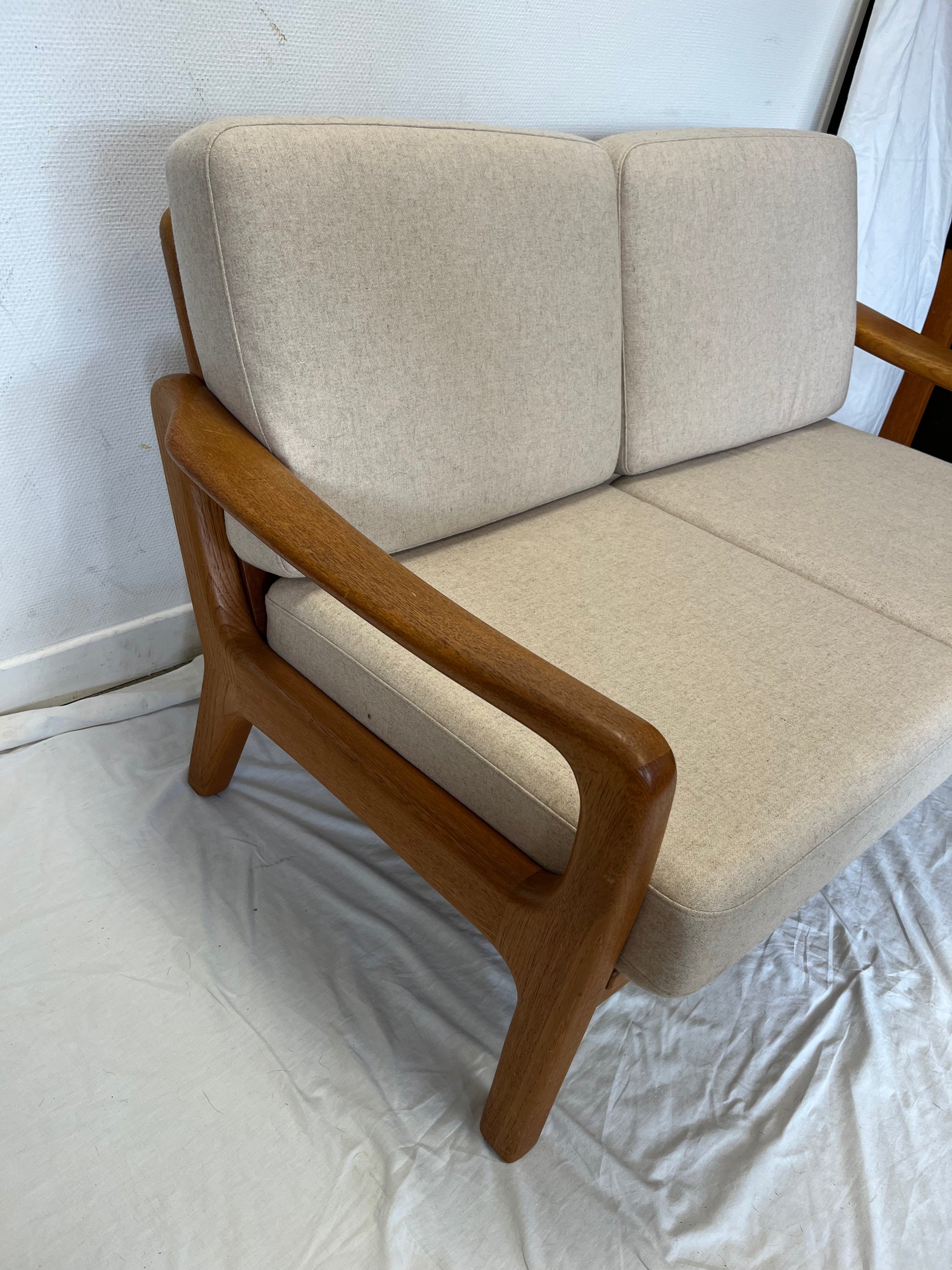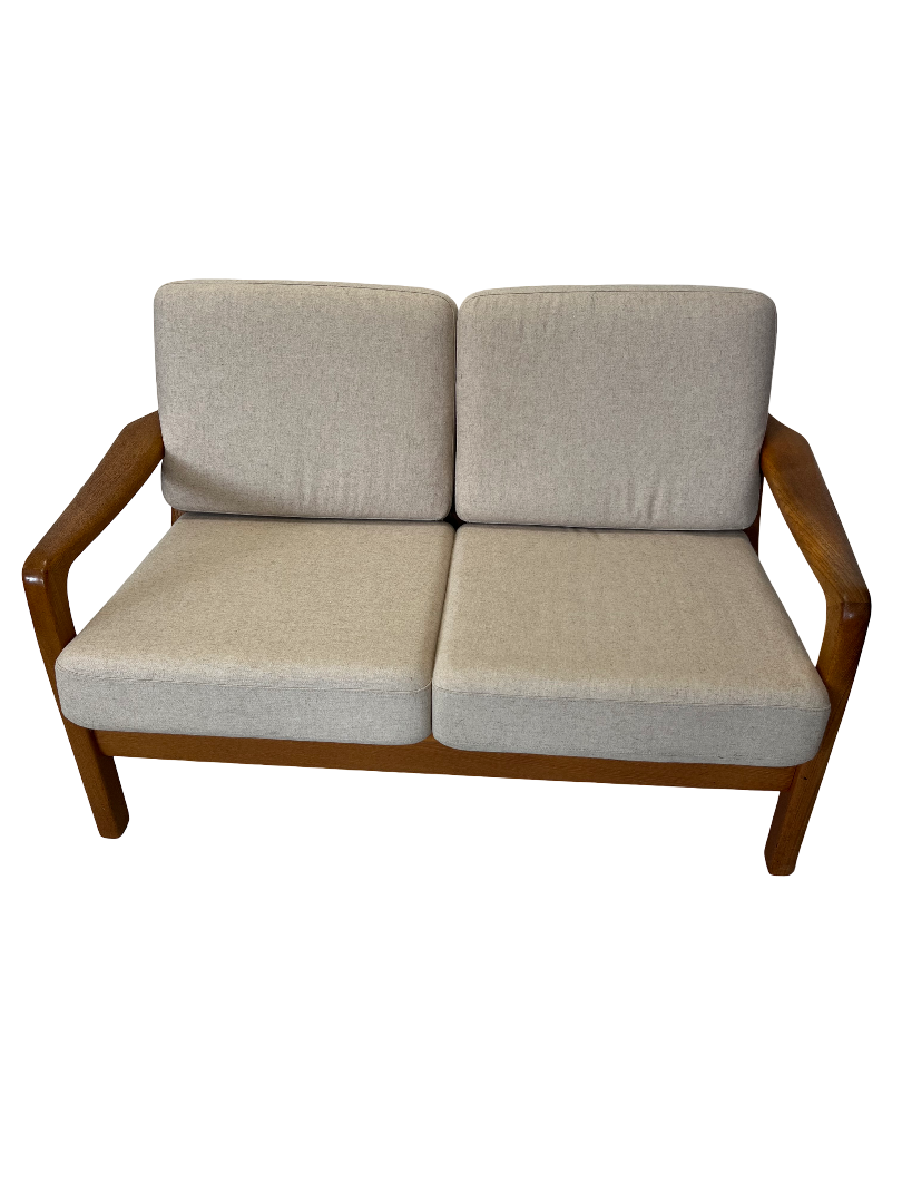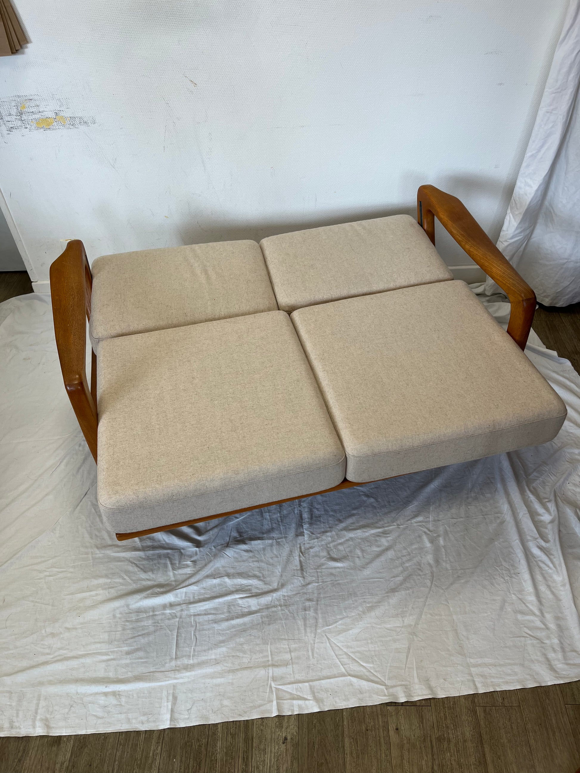 Sofa deux places convertible scandinave en teck massif années 70’s. Design de Juhl Kristiansen (signé voir photo)