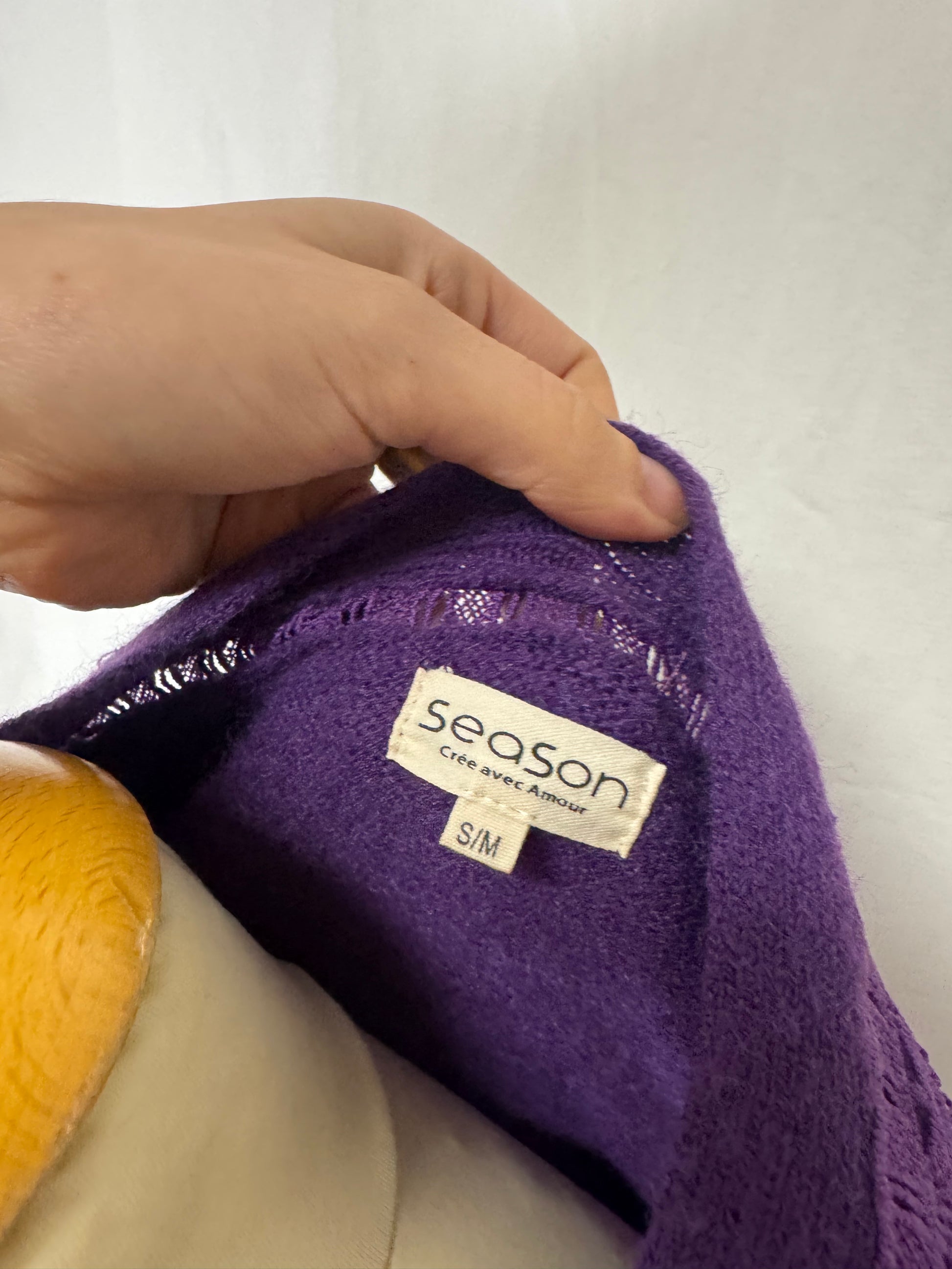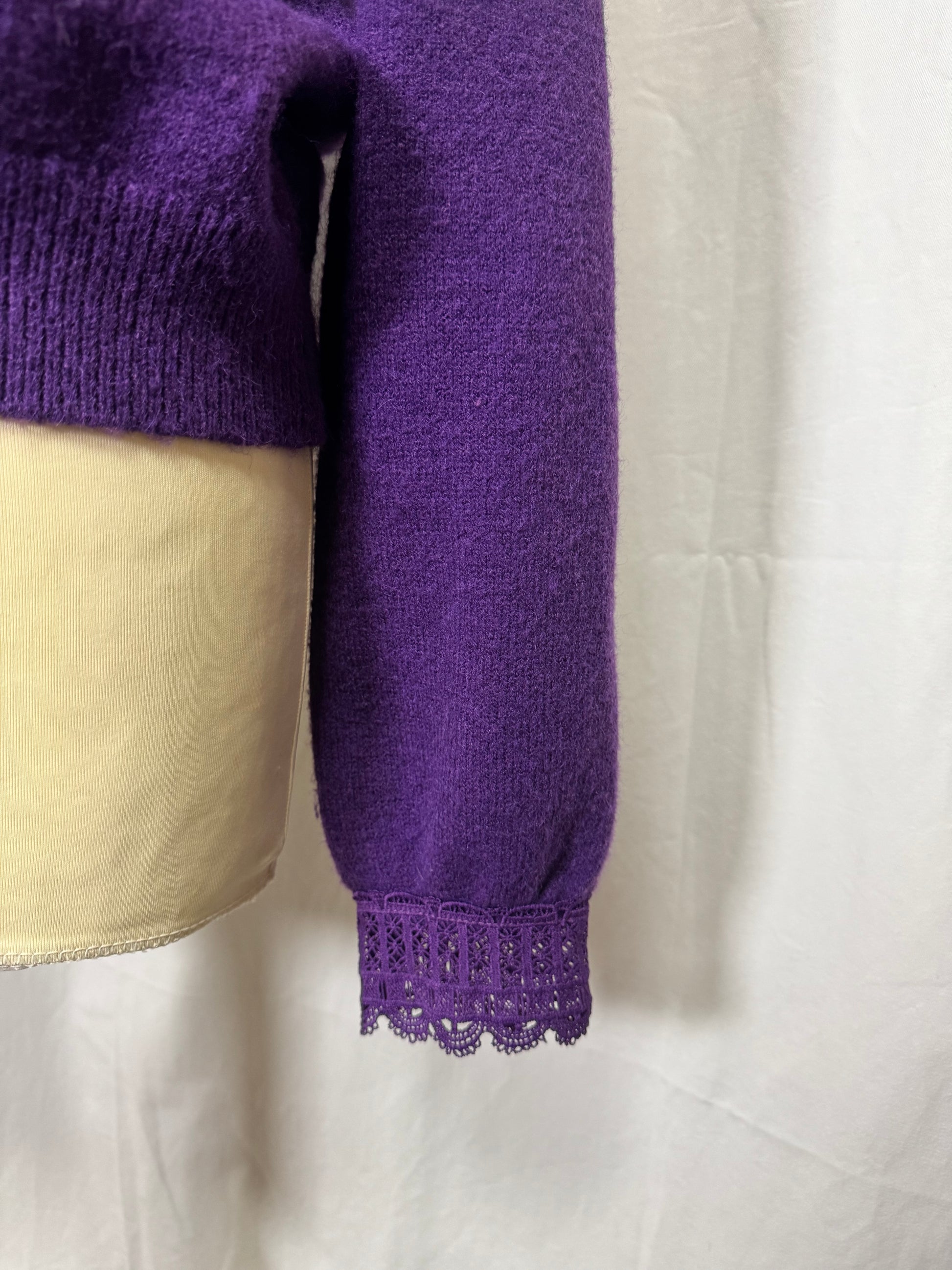 Gilet violet col v, dentelle sur les bouts des manches et au centre.