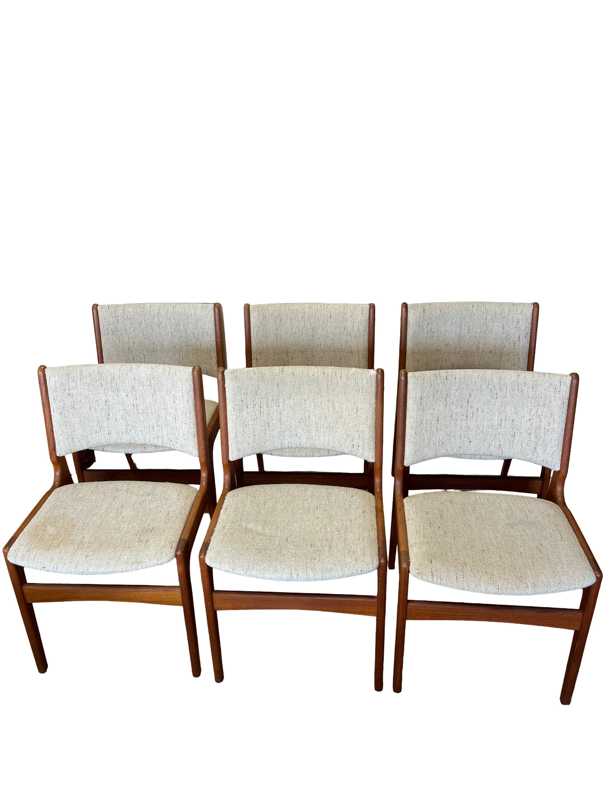 Je vous propose ces 6 chaises scandinaves en teck massif Design d’Erik Buch modèle n89 datant de 1960. Avec leur structure en bois et leur assise en tissu beige, elles apportent une touche rétro et élégante à votre salle à manger !
