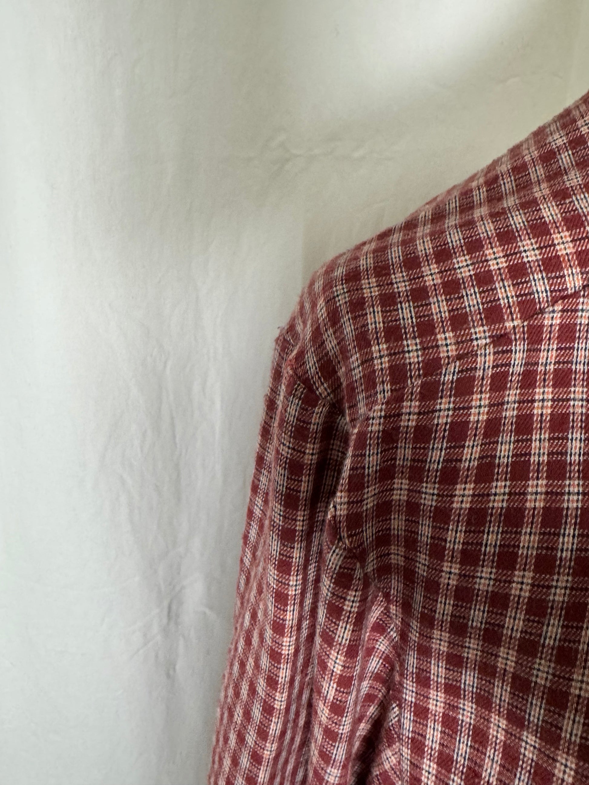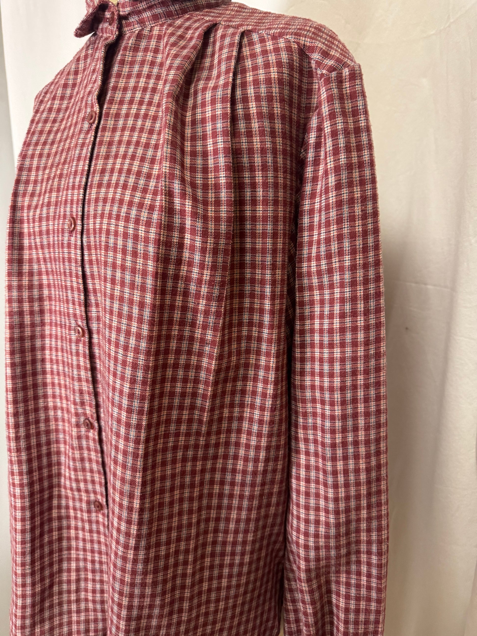 Chemise à carreaux, petit col Claudine, tons rouge foncé, plissée sur le haut.