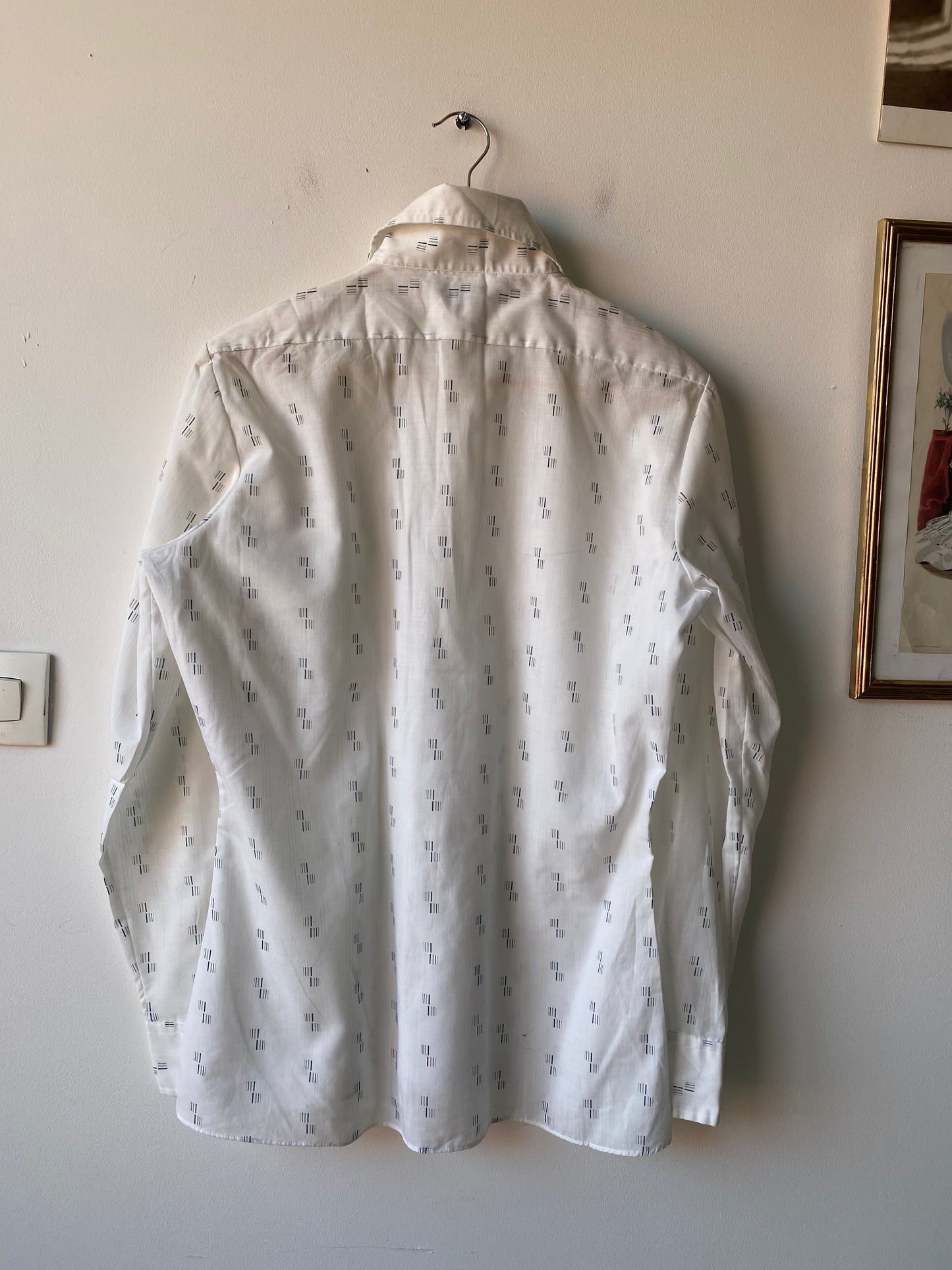 Chemise blanche transparente des années 70, motif de trait géométrique bleu/gris, une petite poche, grand col pelle à tarte.