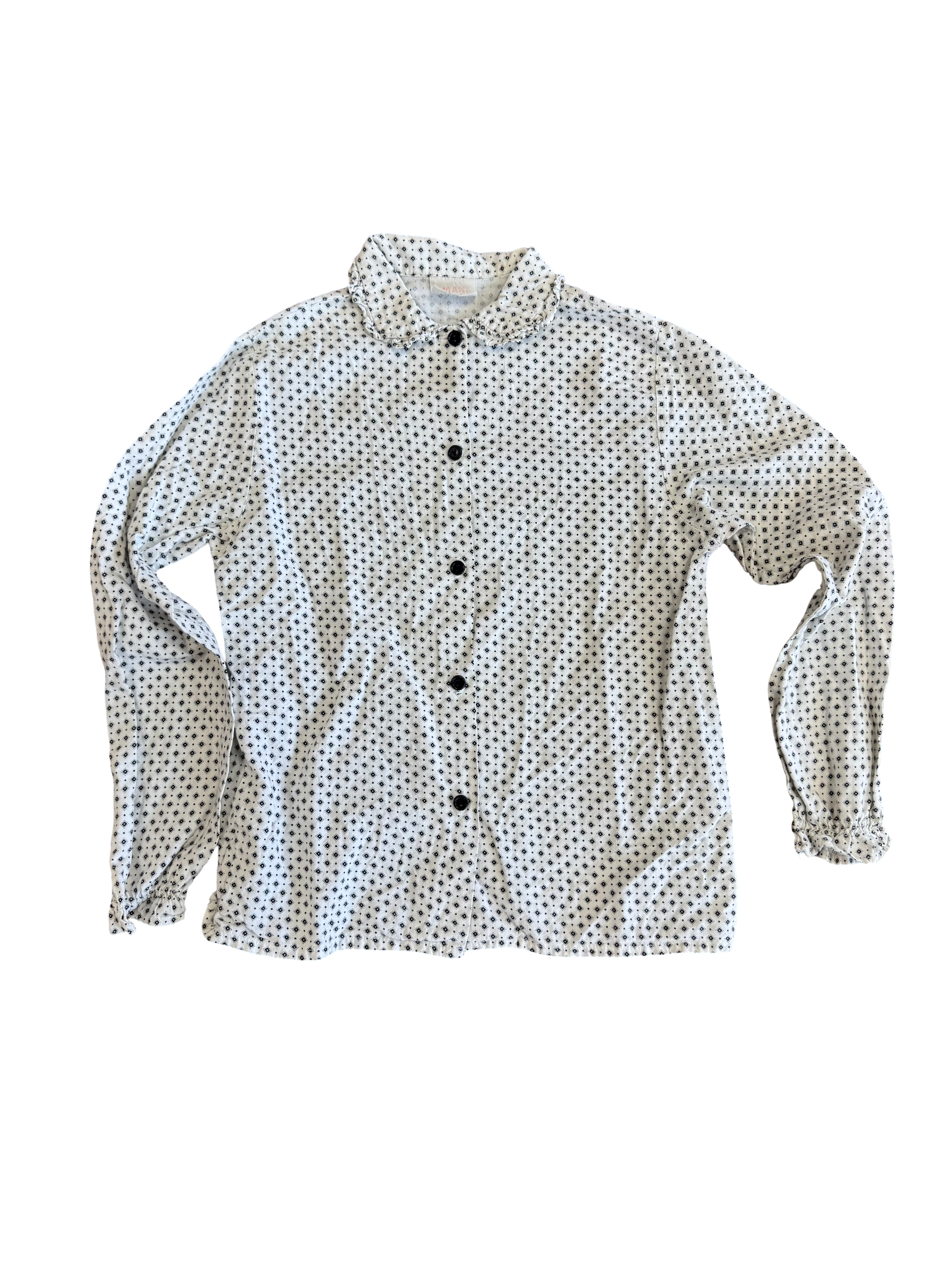 Chemise à manches longues, petit col avec froufrou, motifs géométrique noir sur fond blanc, élastique sur les bouts de manches.