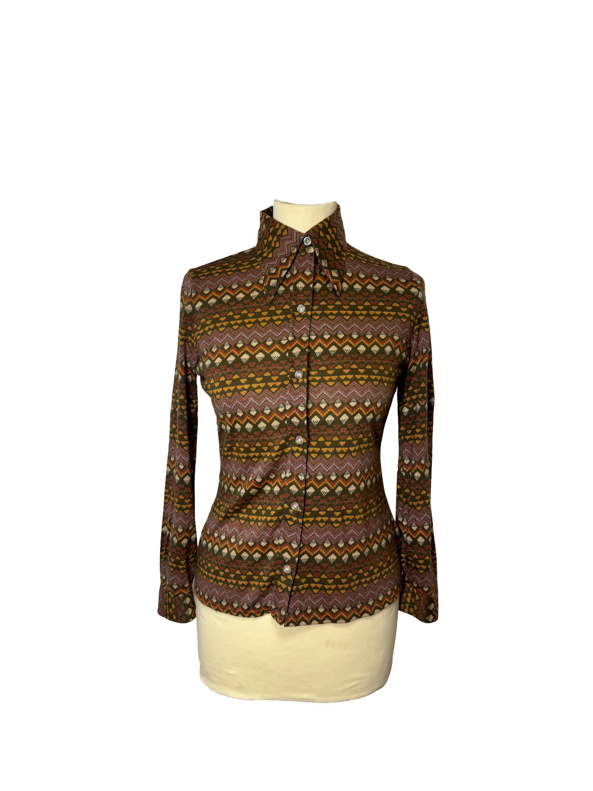 Chemise à motifs des années 70, imprimé géométrique multicolore sur fond marron, col pointue pelle à tarte.