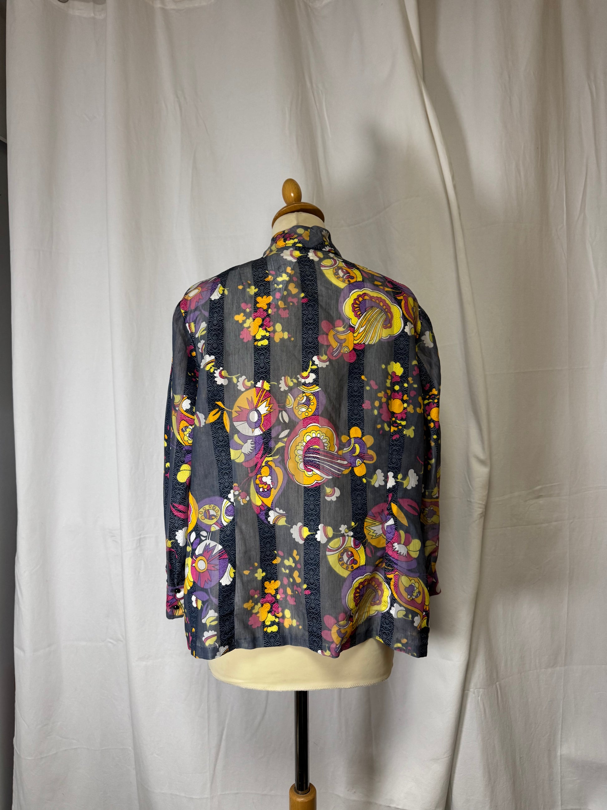 Chemise à motifs des années 70, grise, transparente par endroit, motifs floraux, col lavallière.
