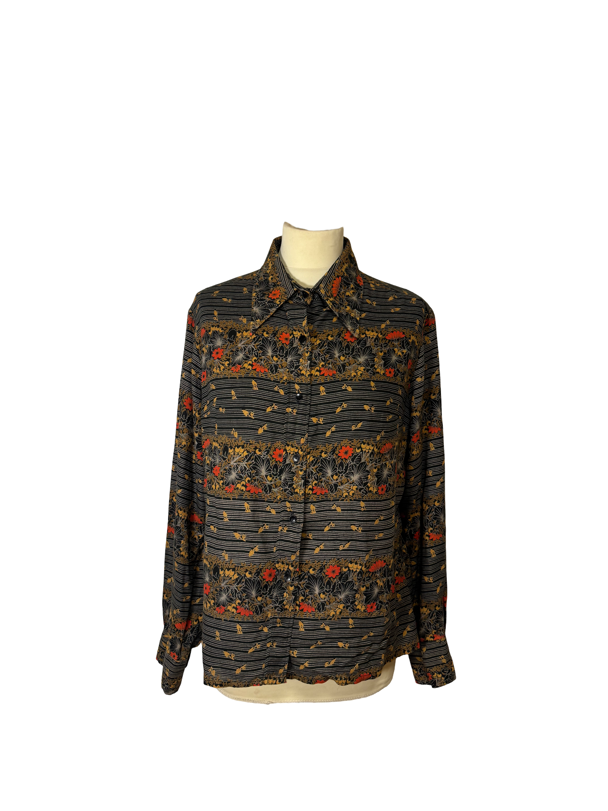 Chemise des années 70, motifs floraux et géométrique, tons marron et noir, col pointue / pelle à tarte.