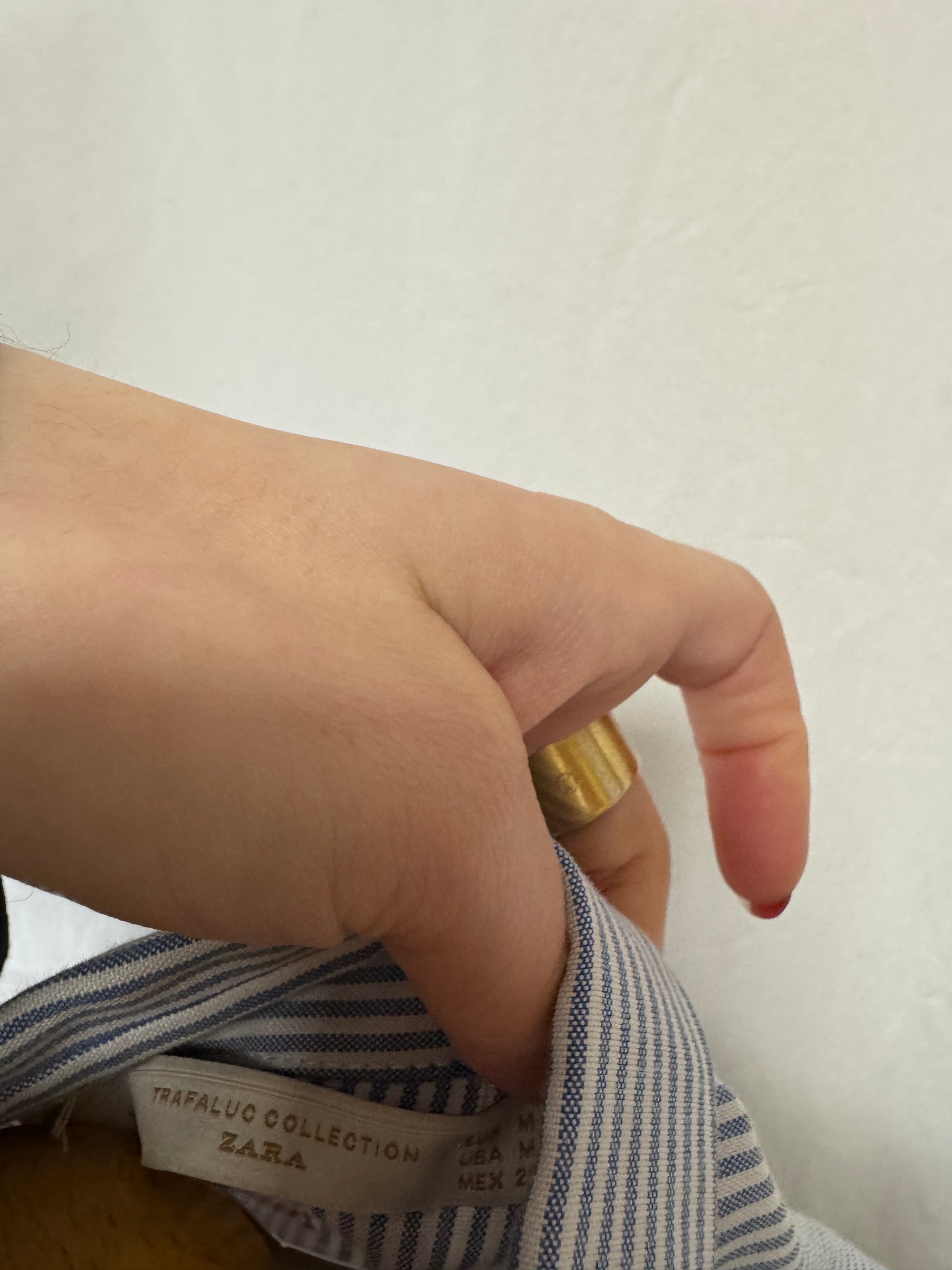 Chemise à rayures bleu clair et blanches, une grande poche sur l'avant.