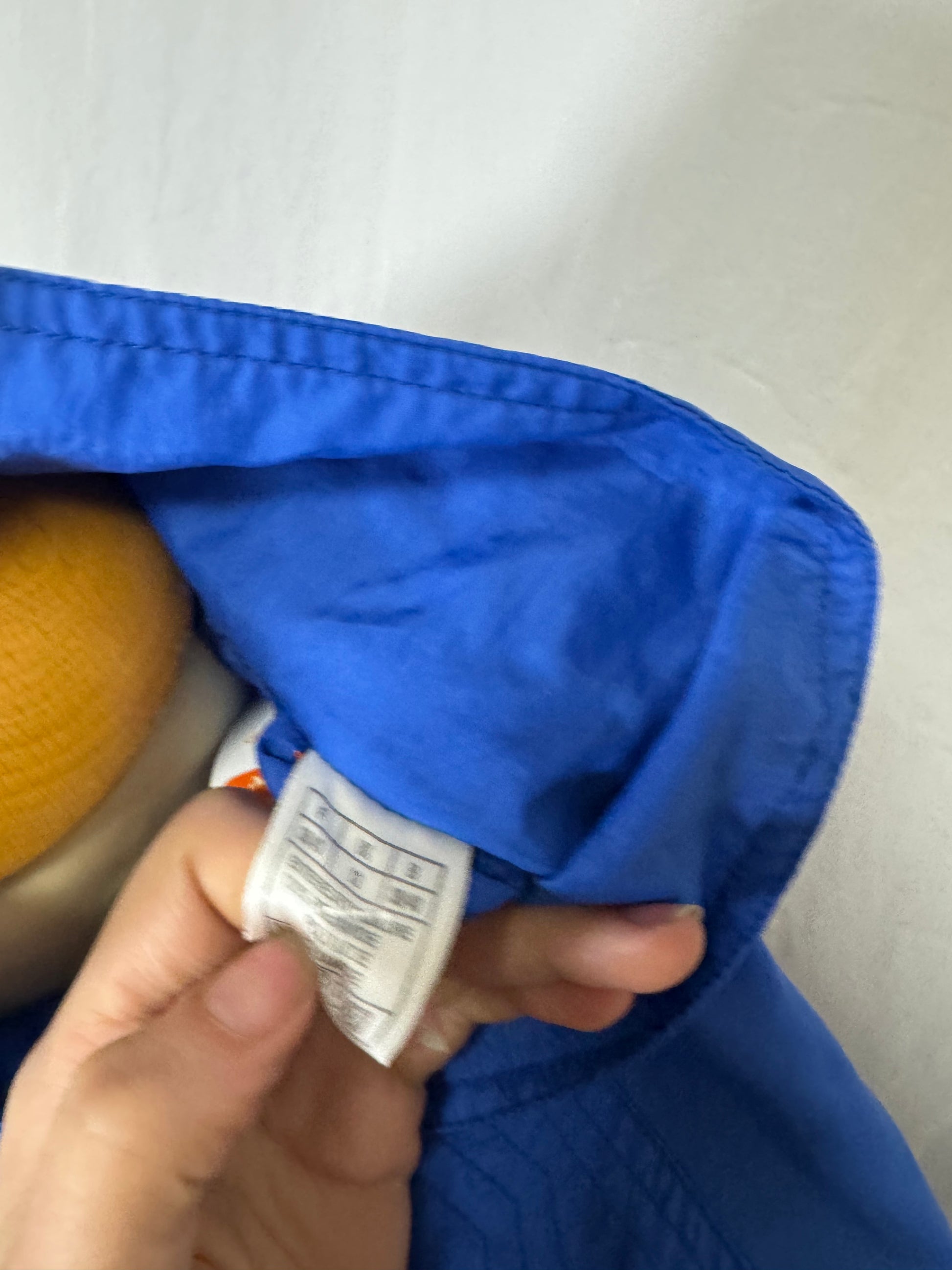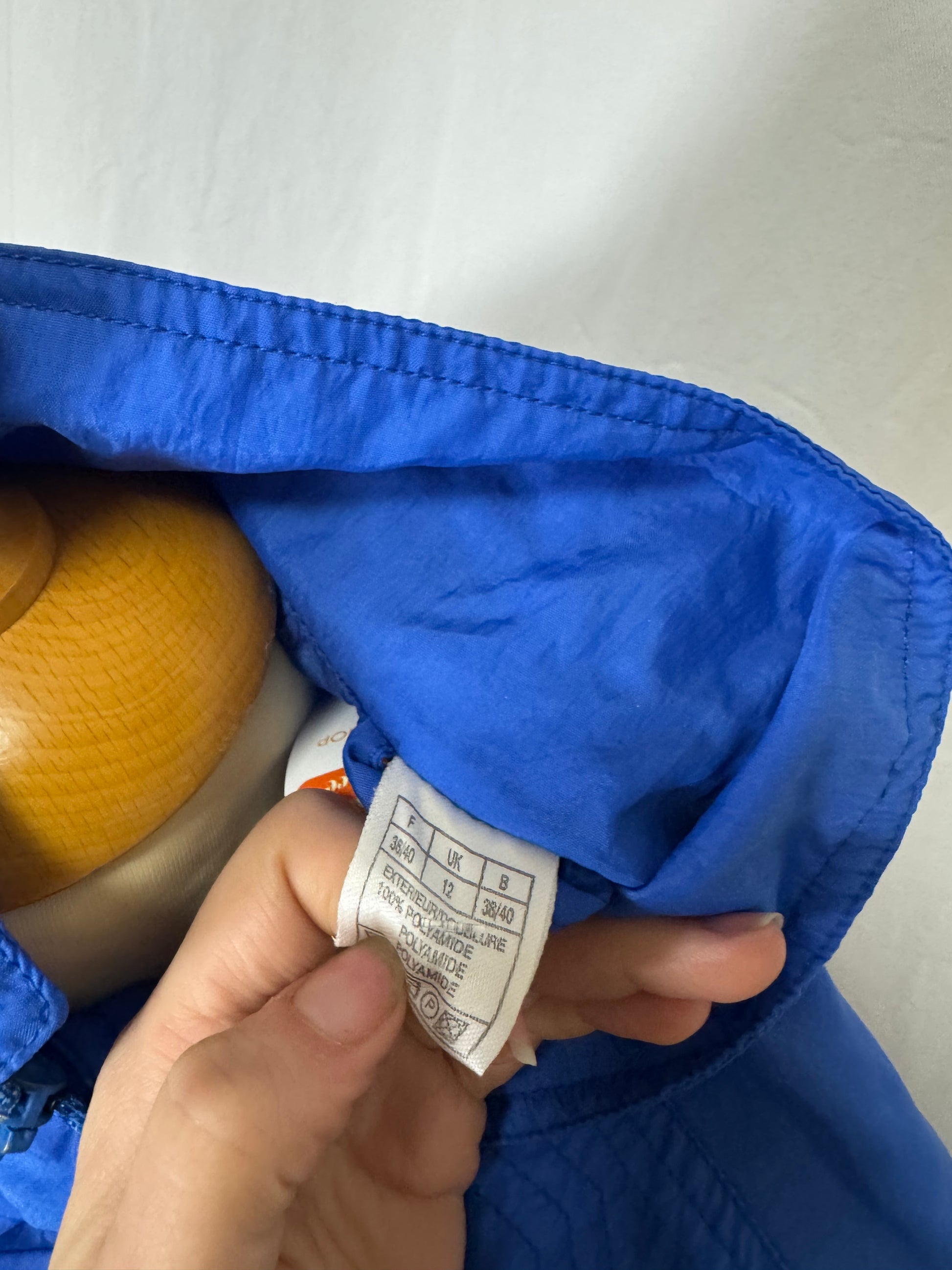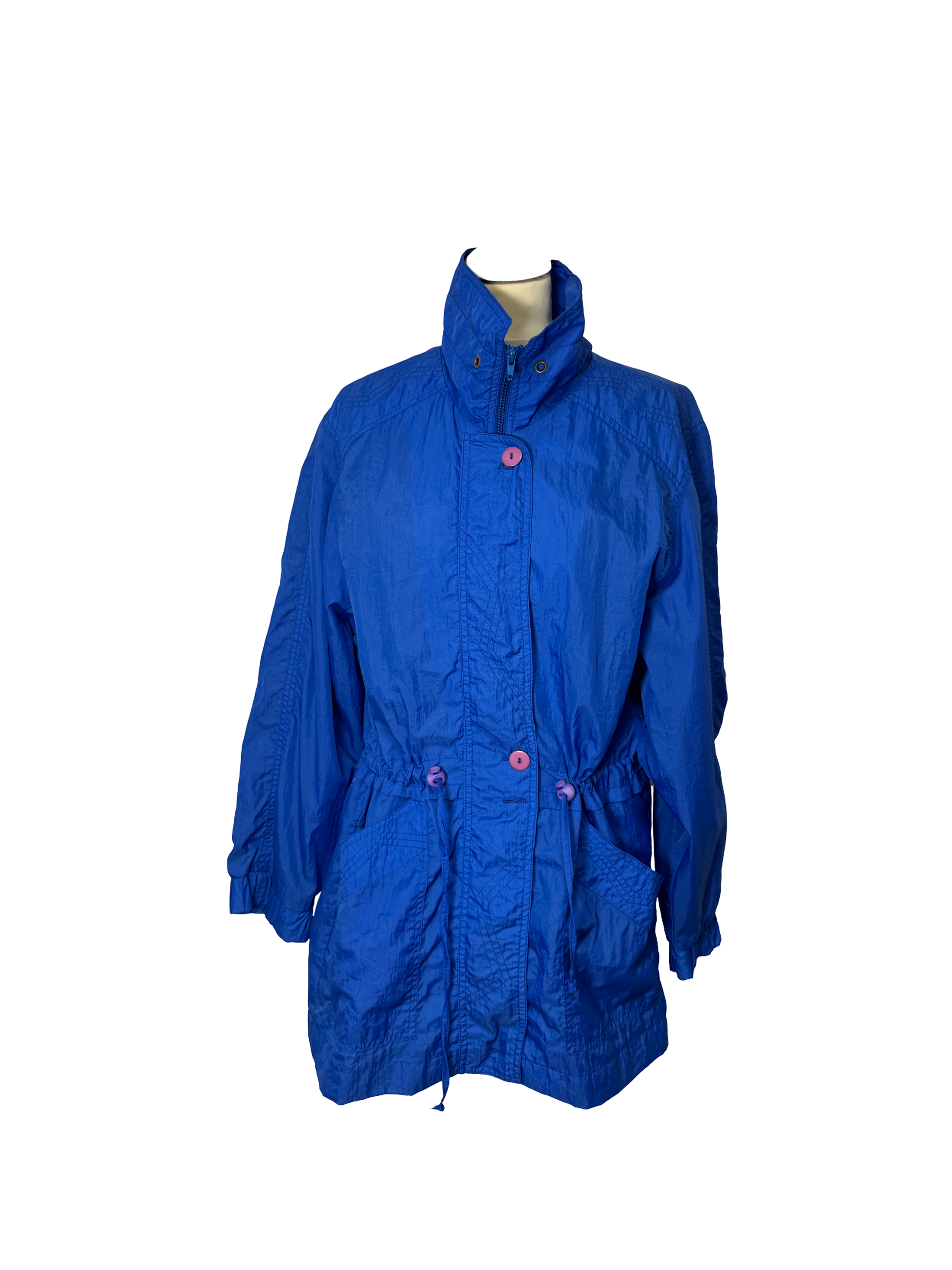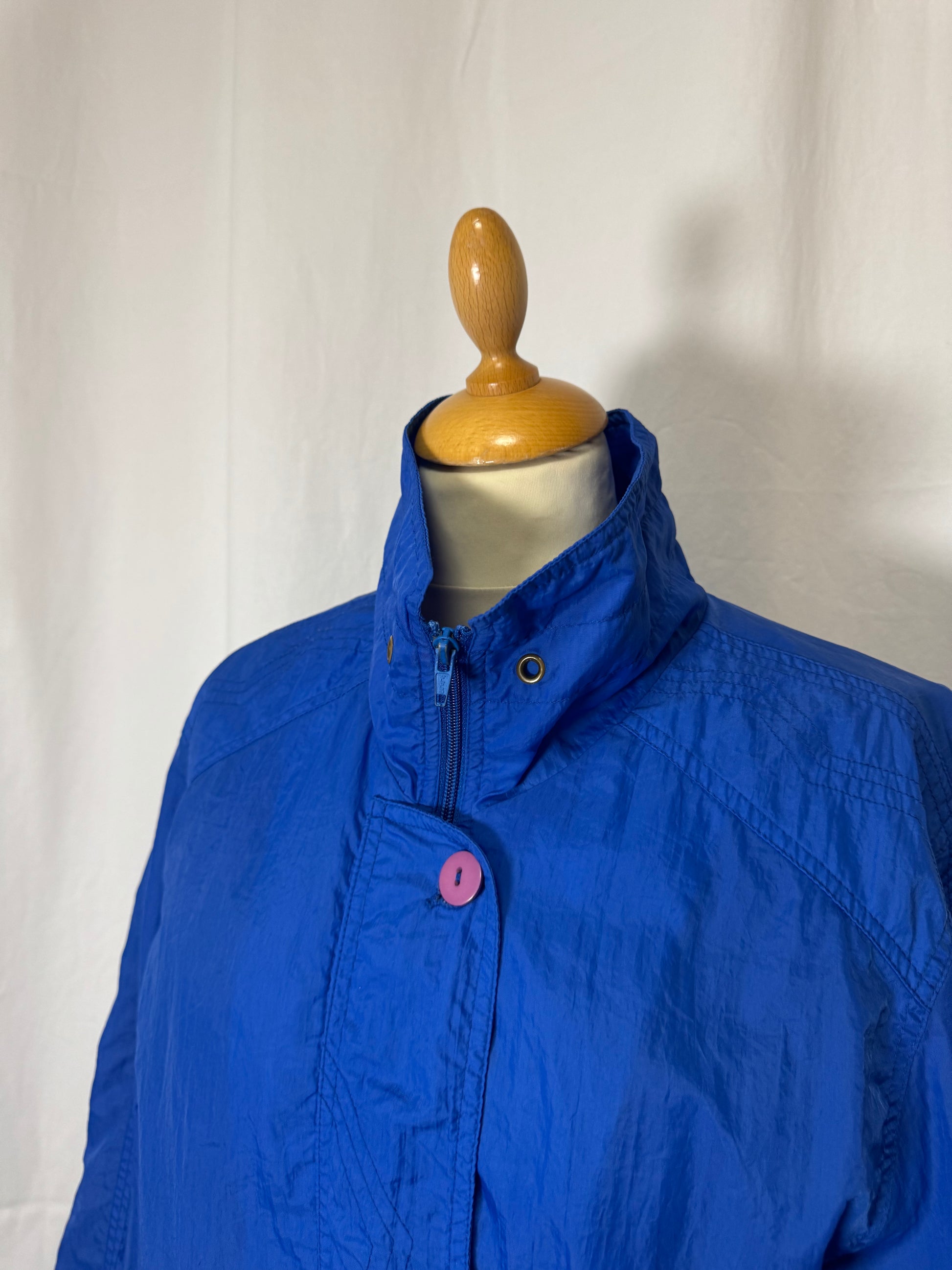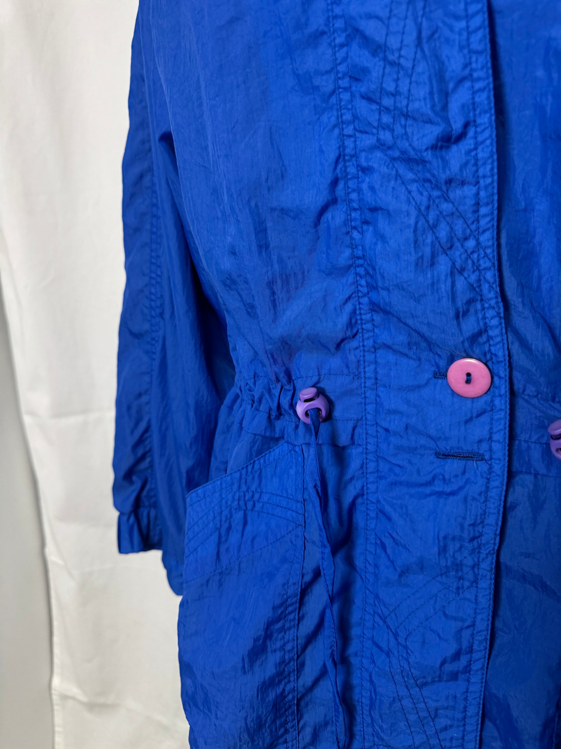 Blouson mi long bleu électrique, année 80, col haut, fermeture par boutons et fermeture éclair, deux poches, cordons de serrage au niveau de la taille.