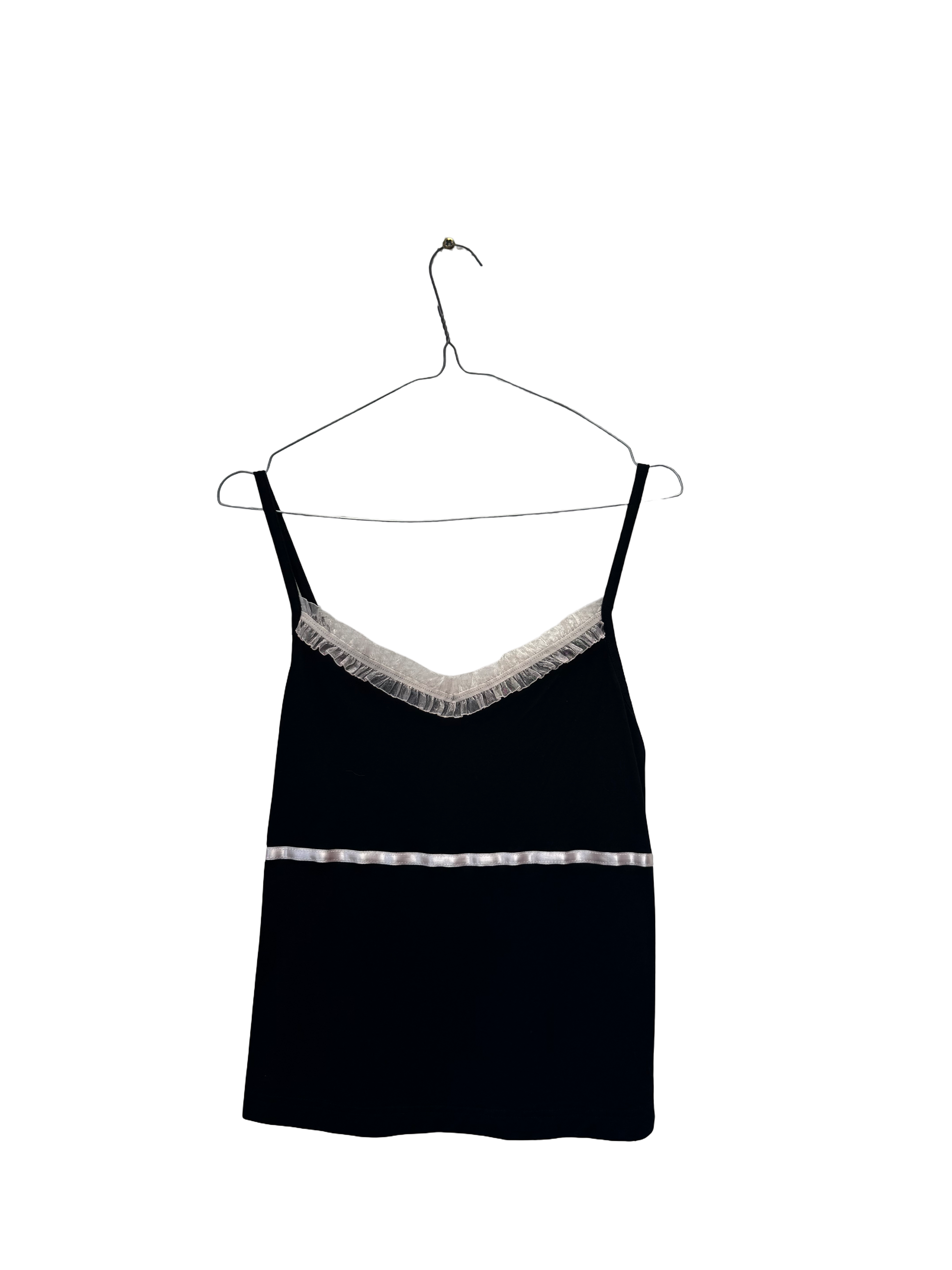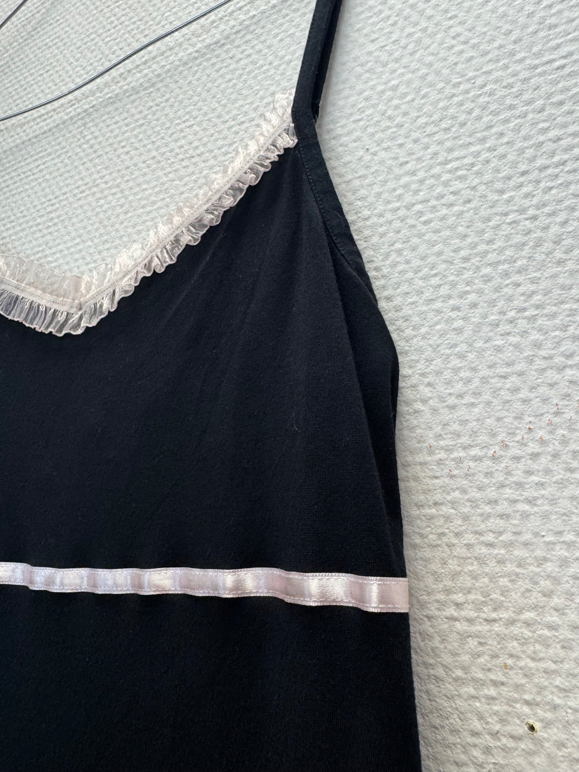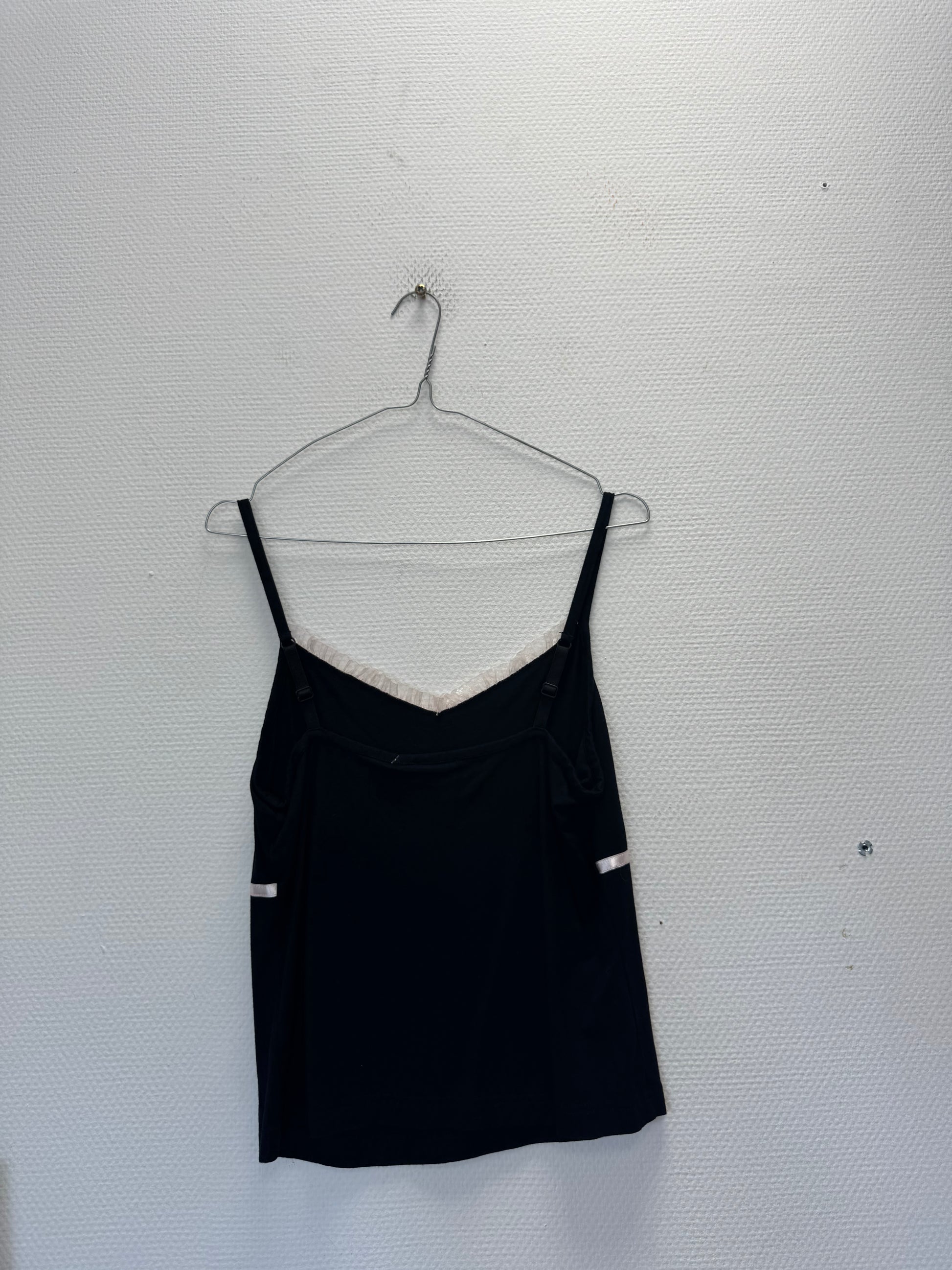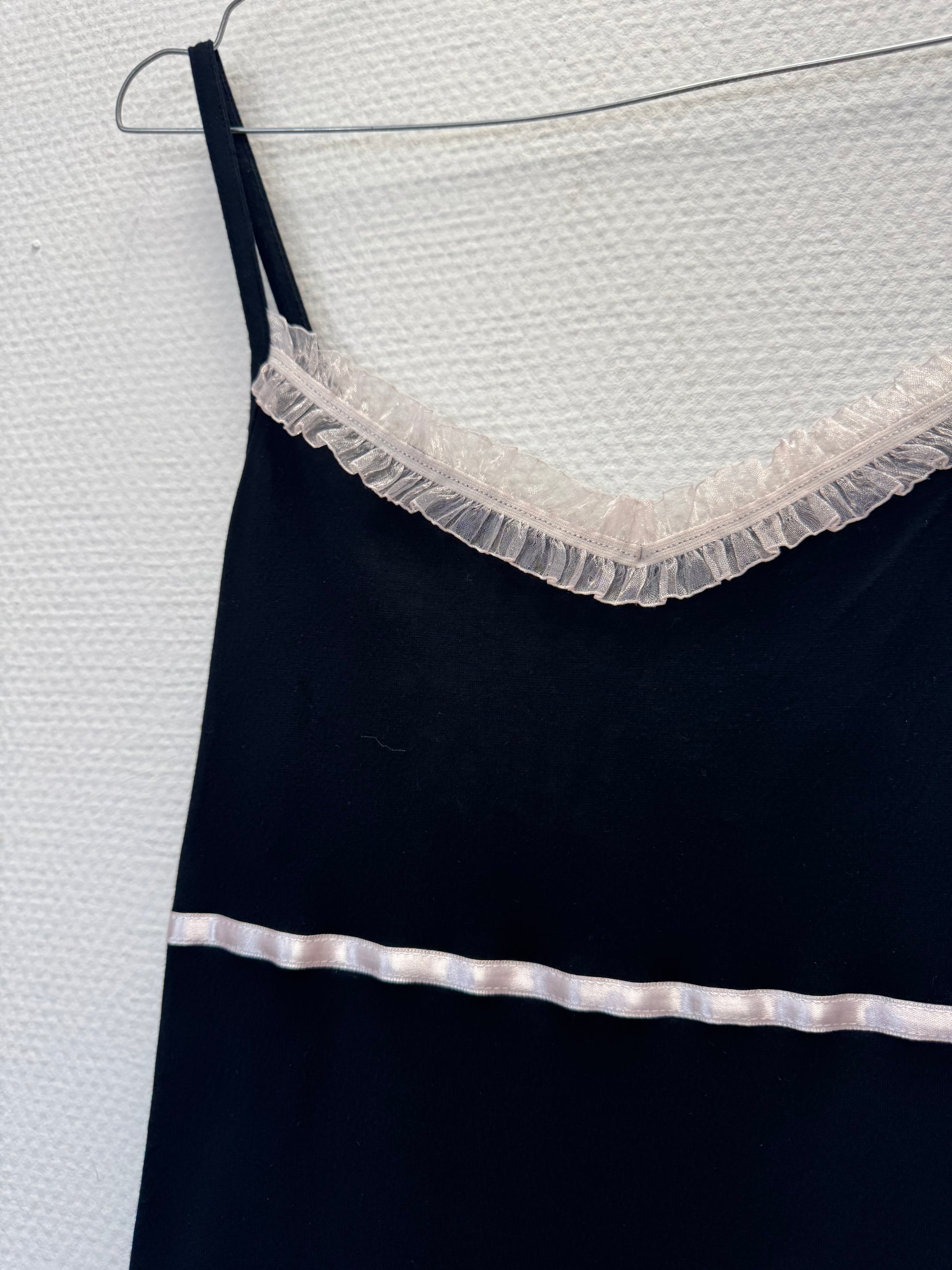 Débardeur noir, froufrou rose pâle sur le décolleté, et bande rose pâle satiné sur l'avant.