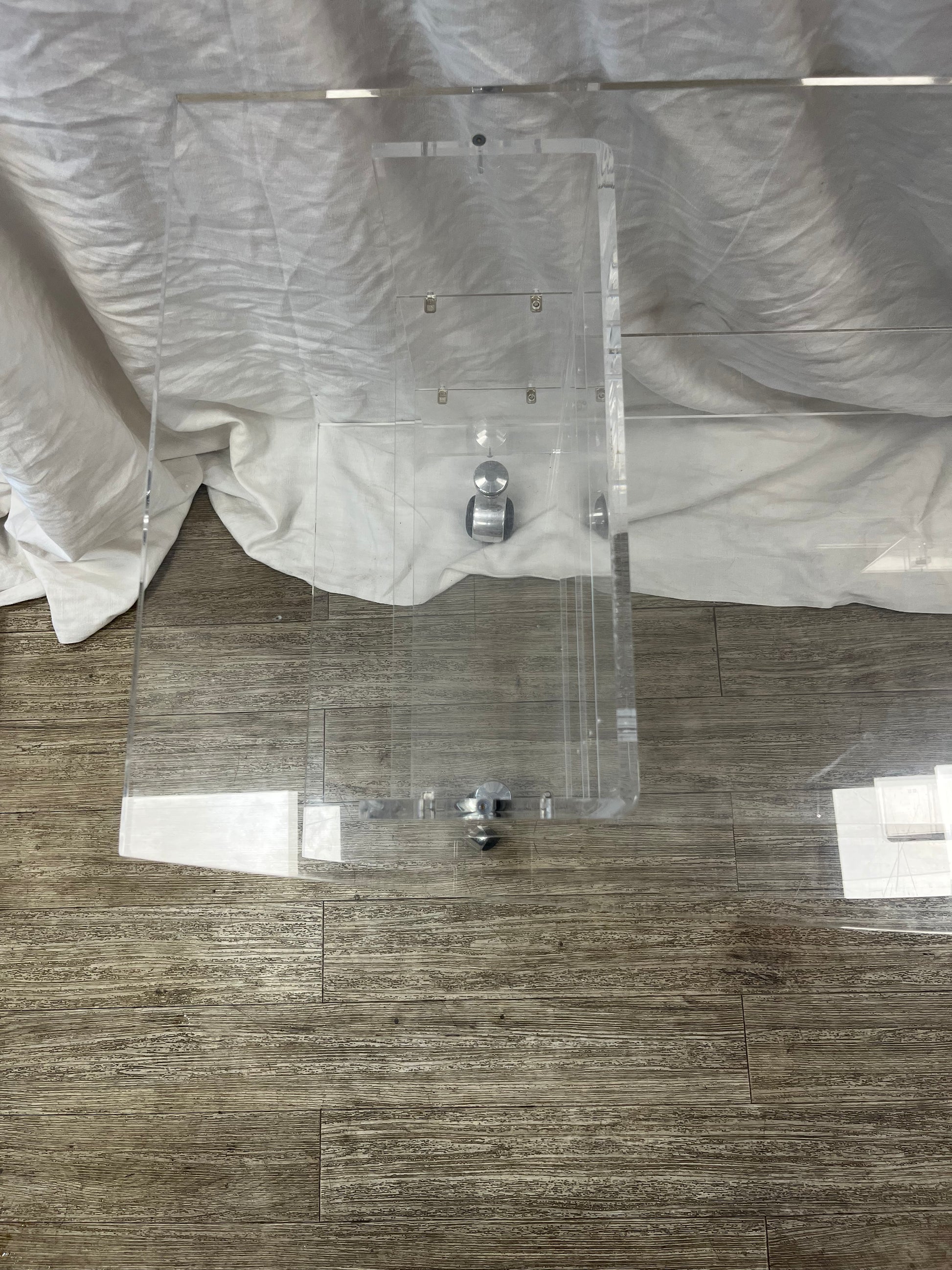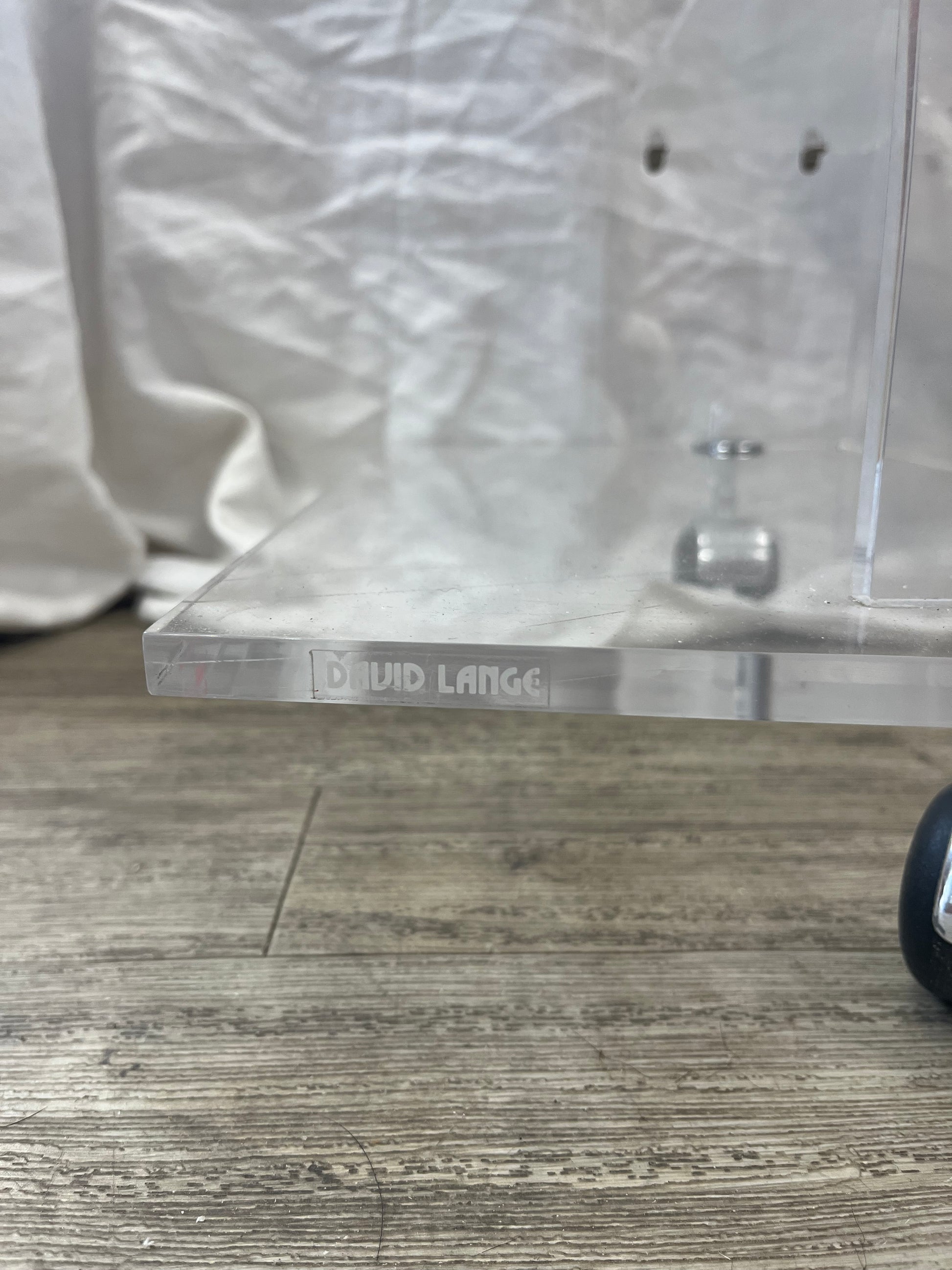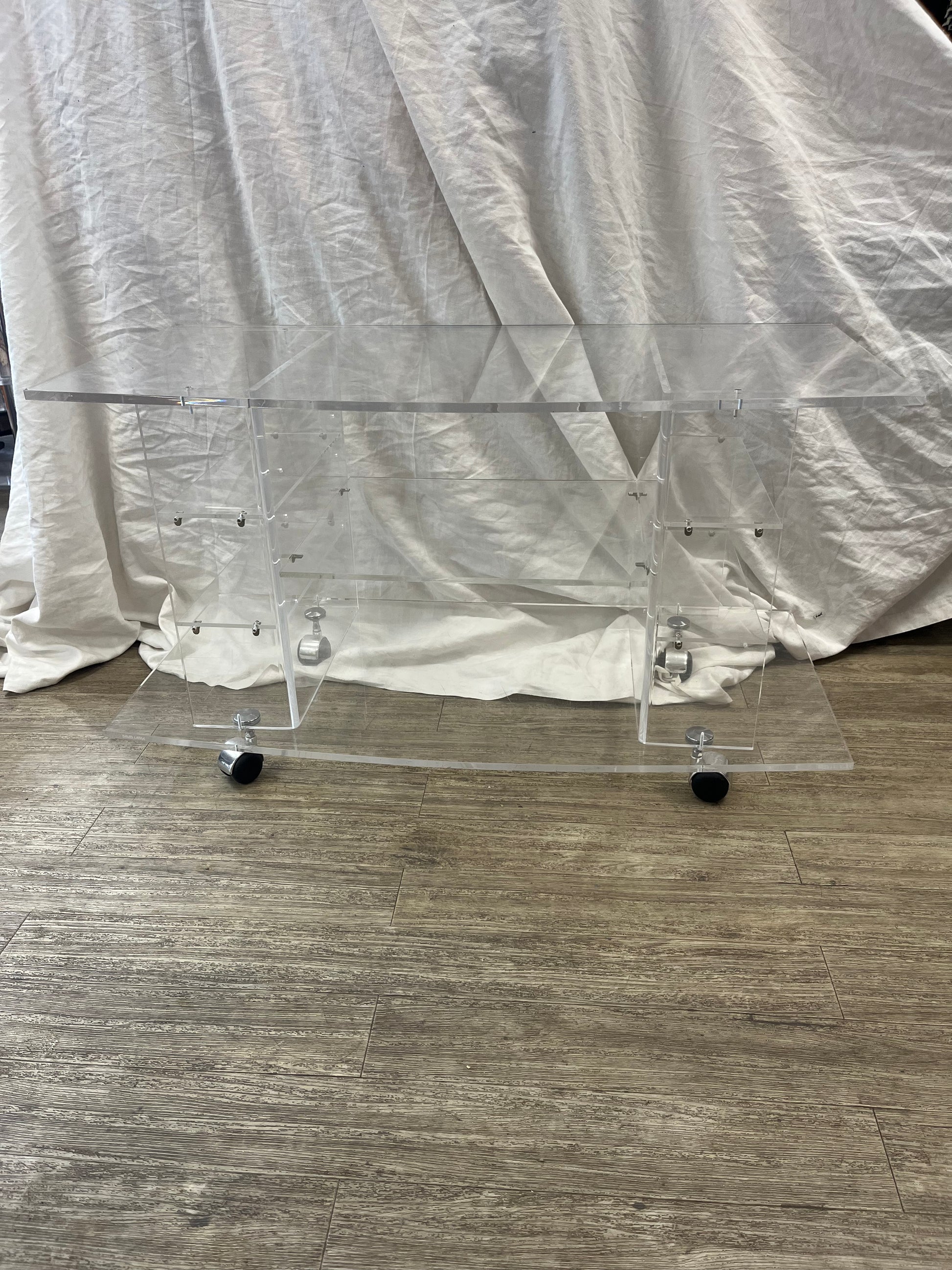Desserte en plexiglas transparent, sur roulettes, plusieurs étagères.