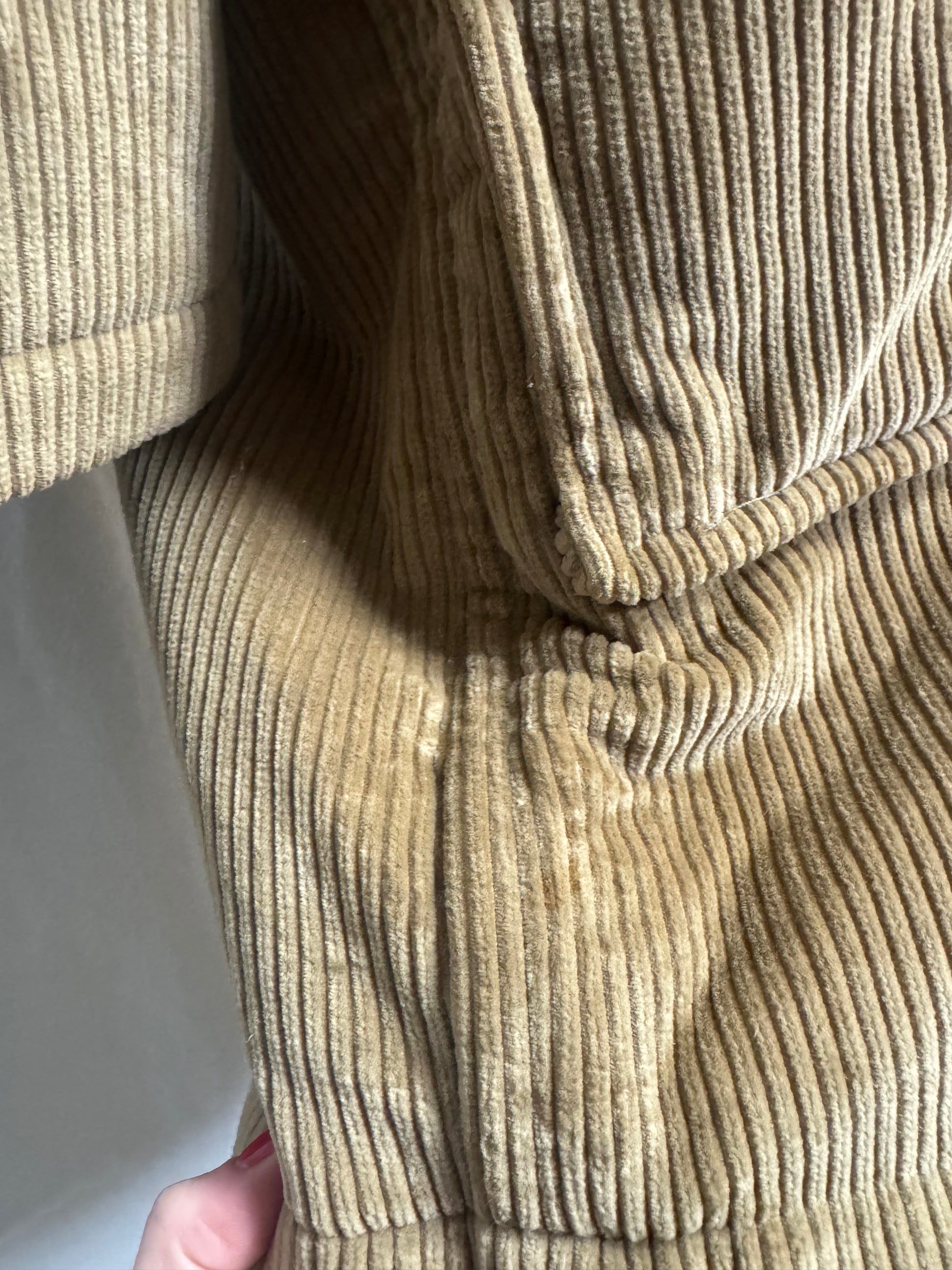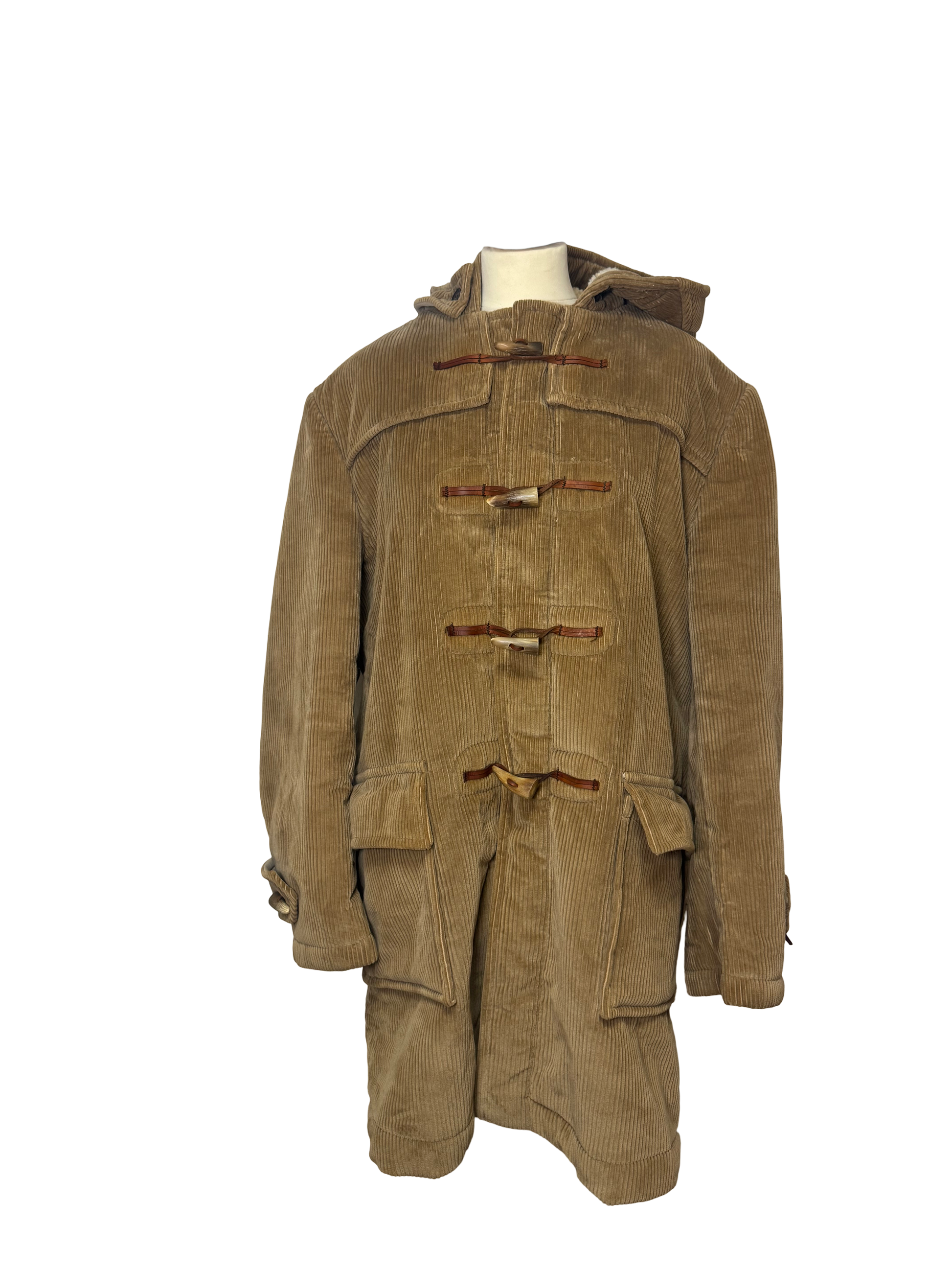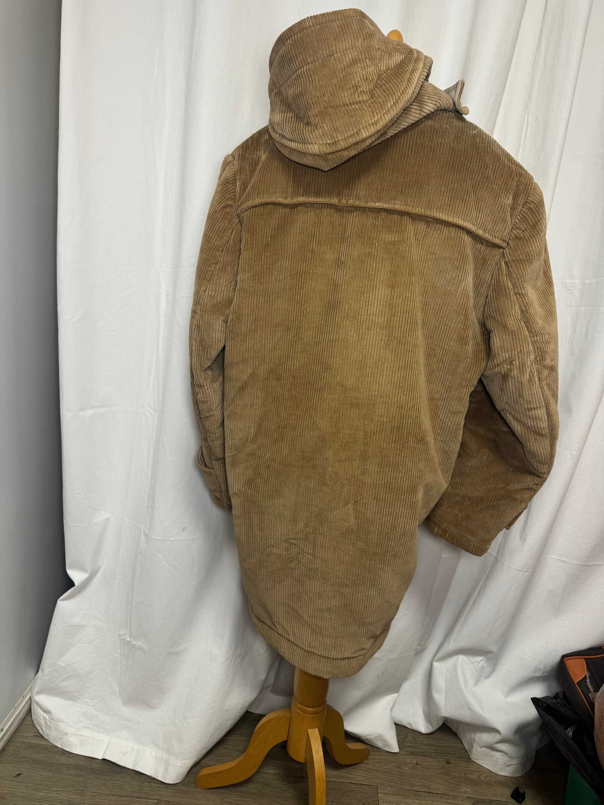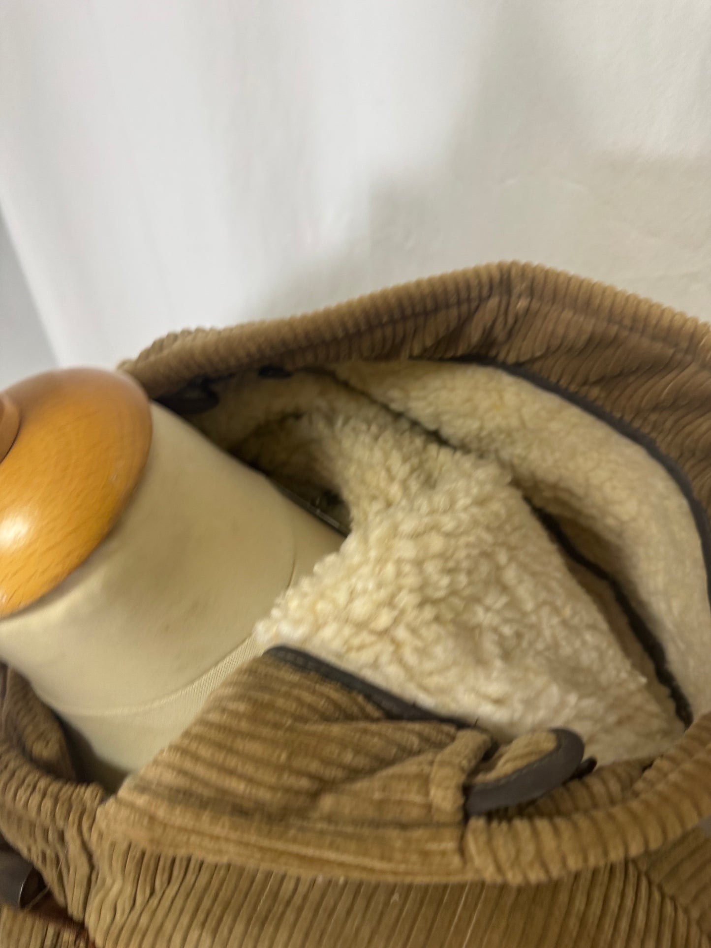 Duffle coat en velours côtelé beige, doublure en fausse fourrure, capuche, fermeture éclair et boutons, deux grandes poches.