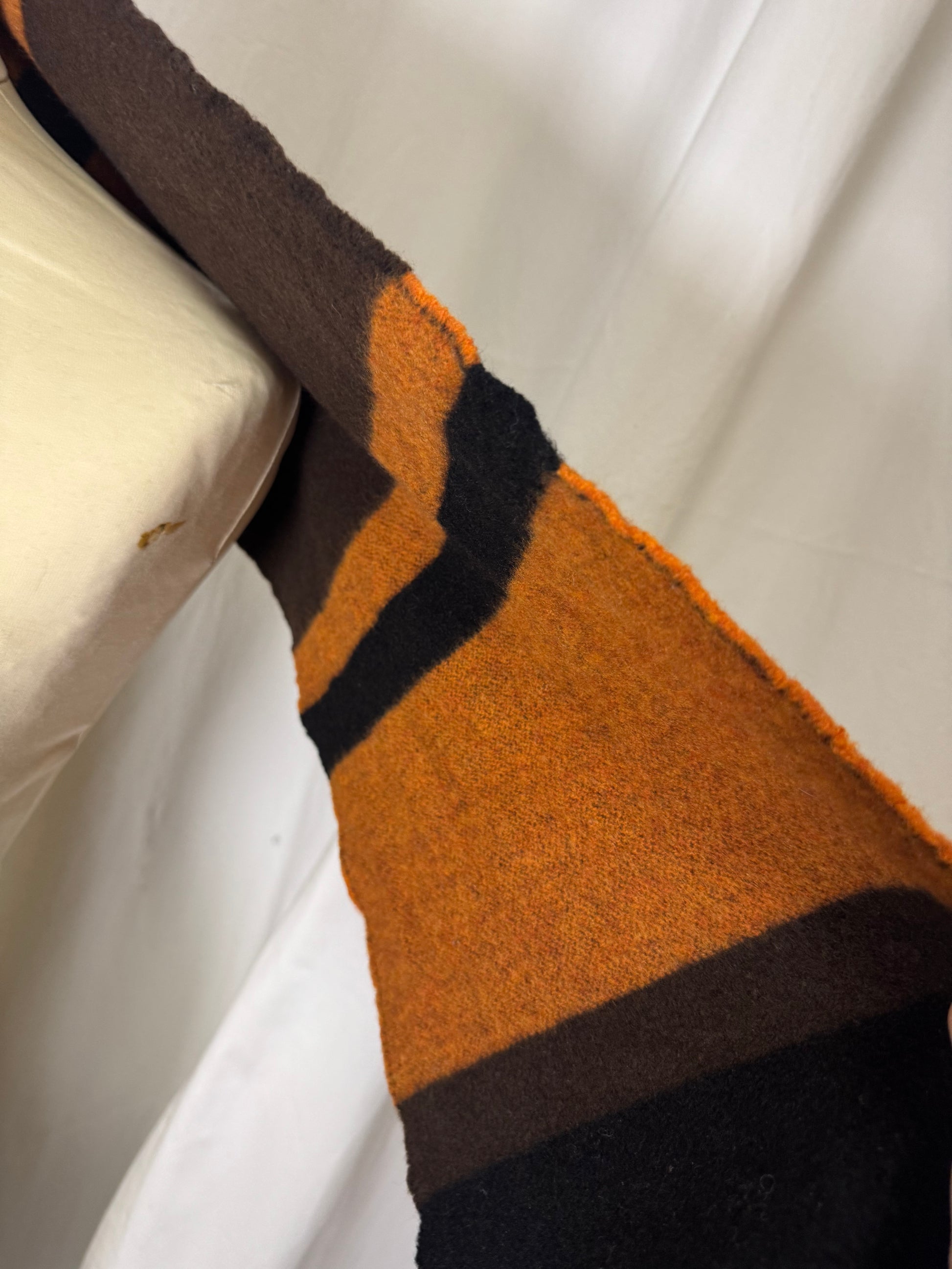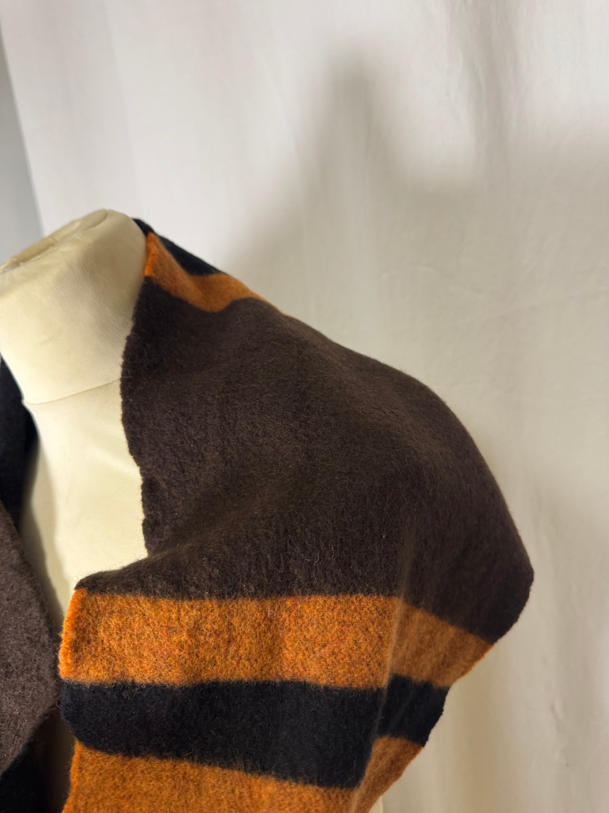 Écharpe à rayures, orange, marron et noir, frange.