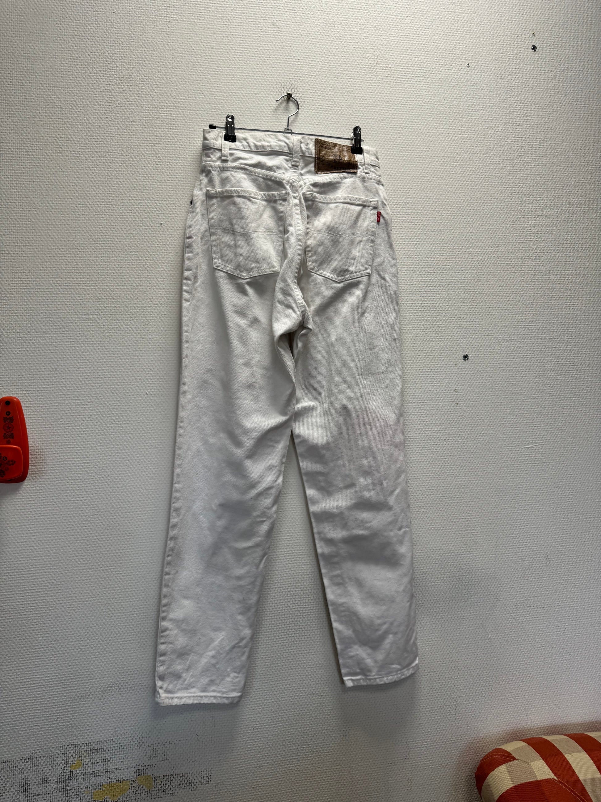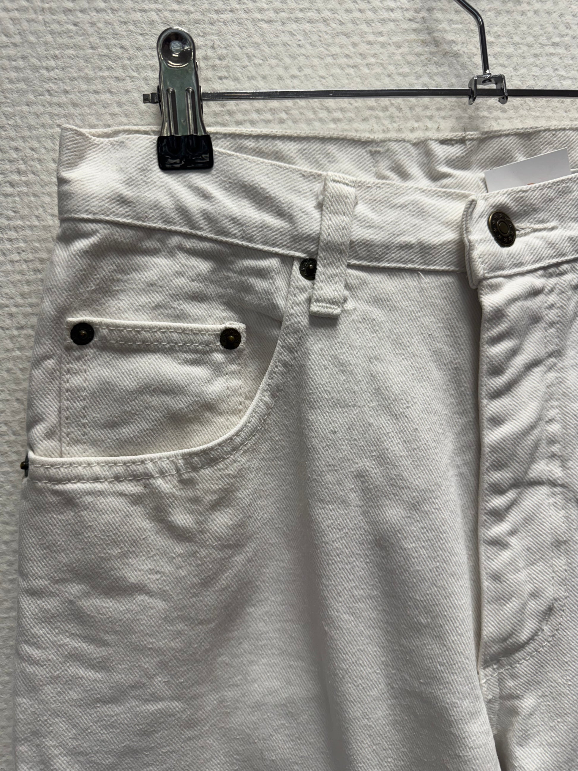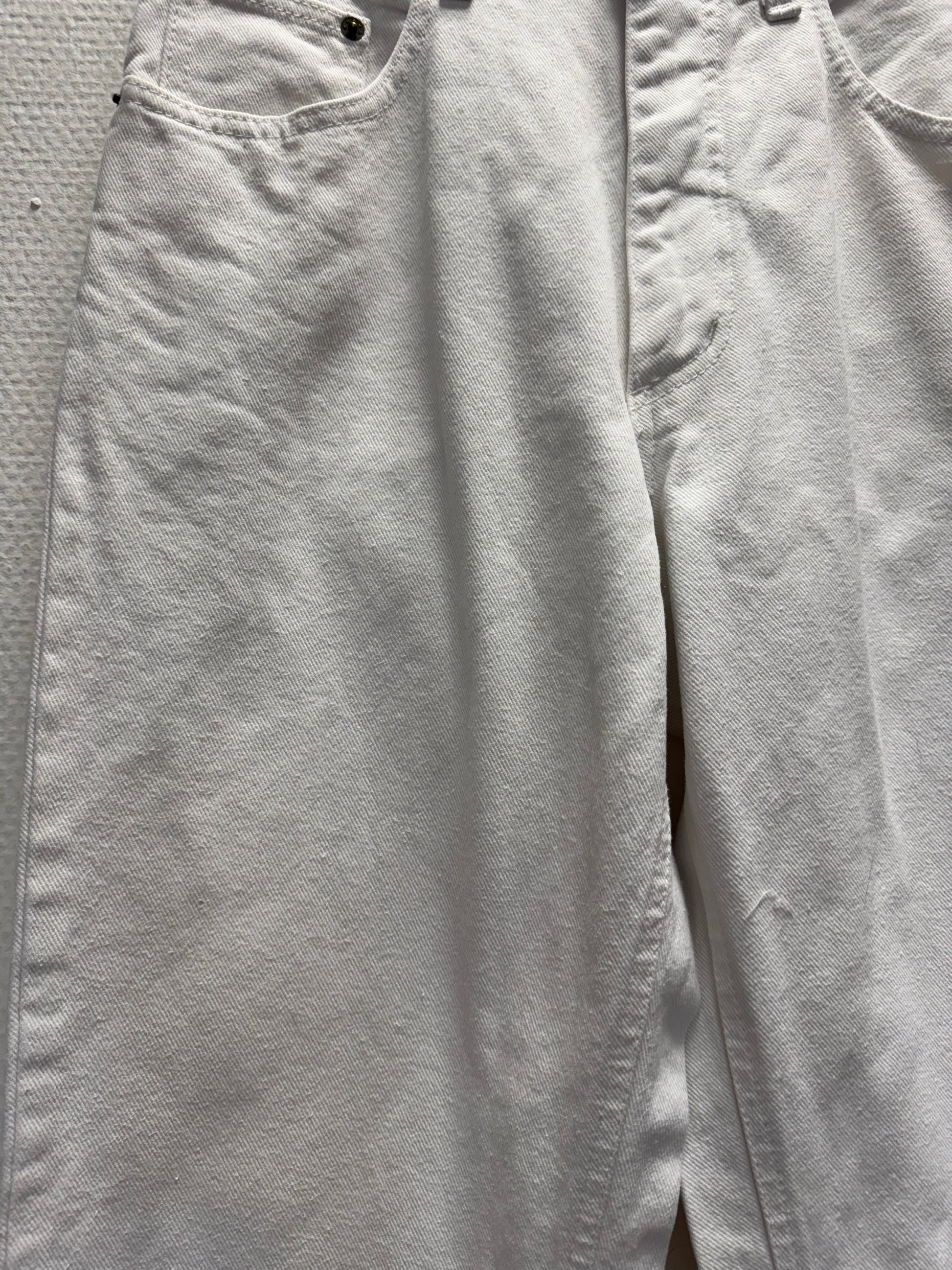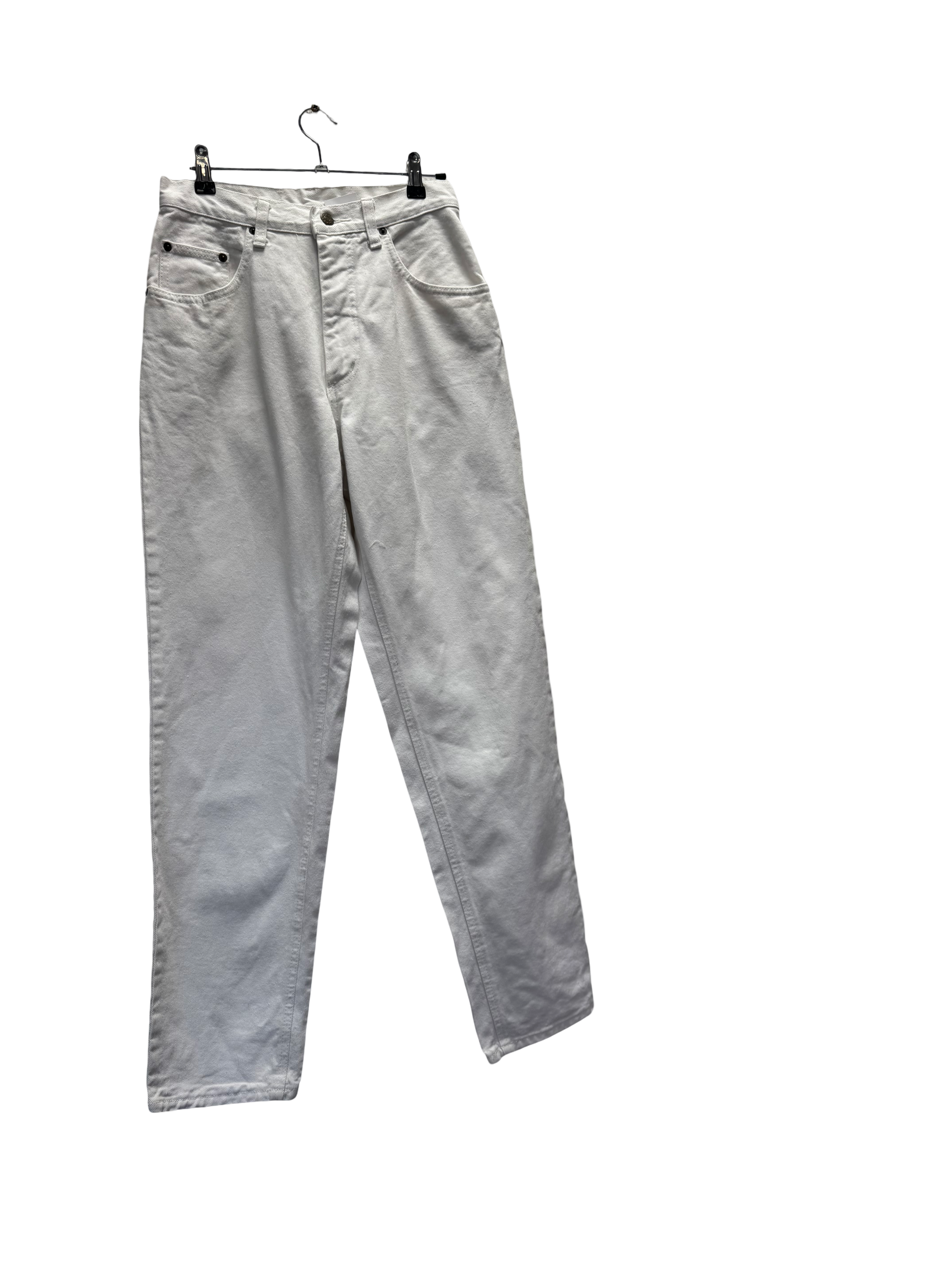 Jean à jambe large des années 80, taille haute, blanc, quatre poches, passant pour une ceinture.