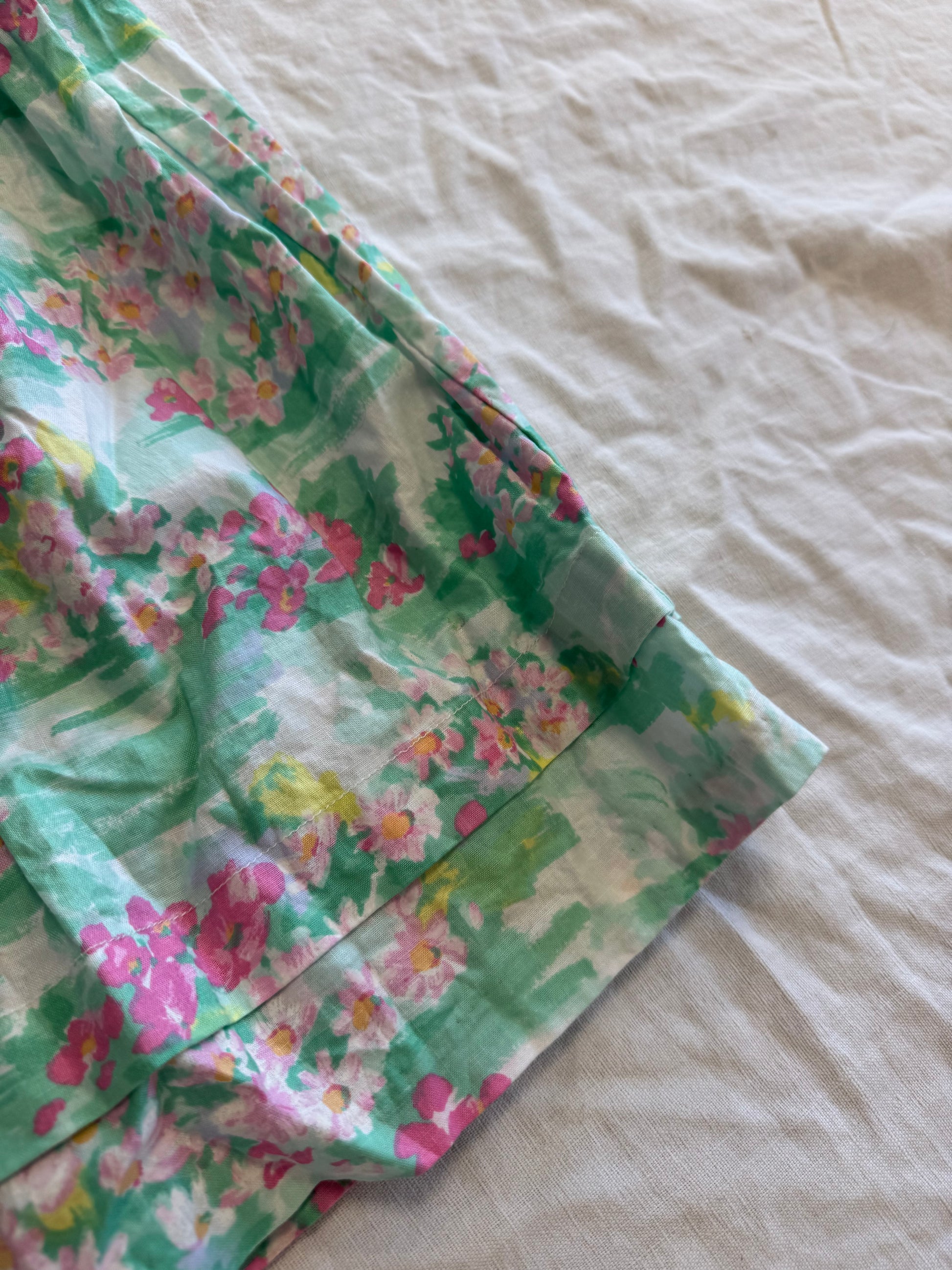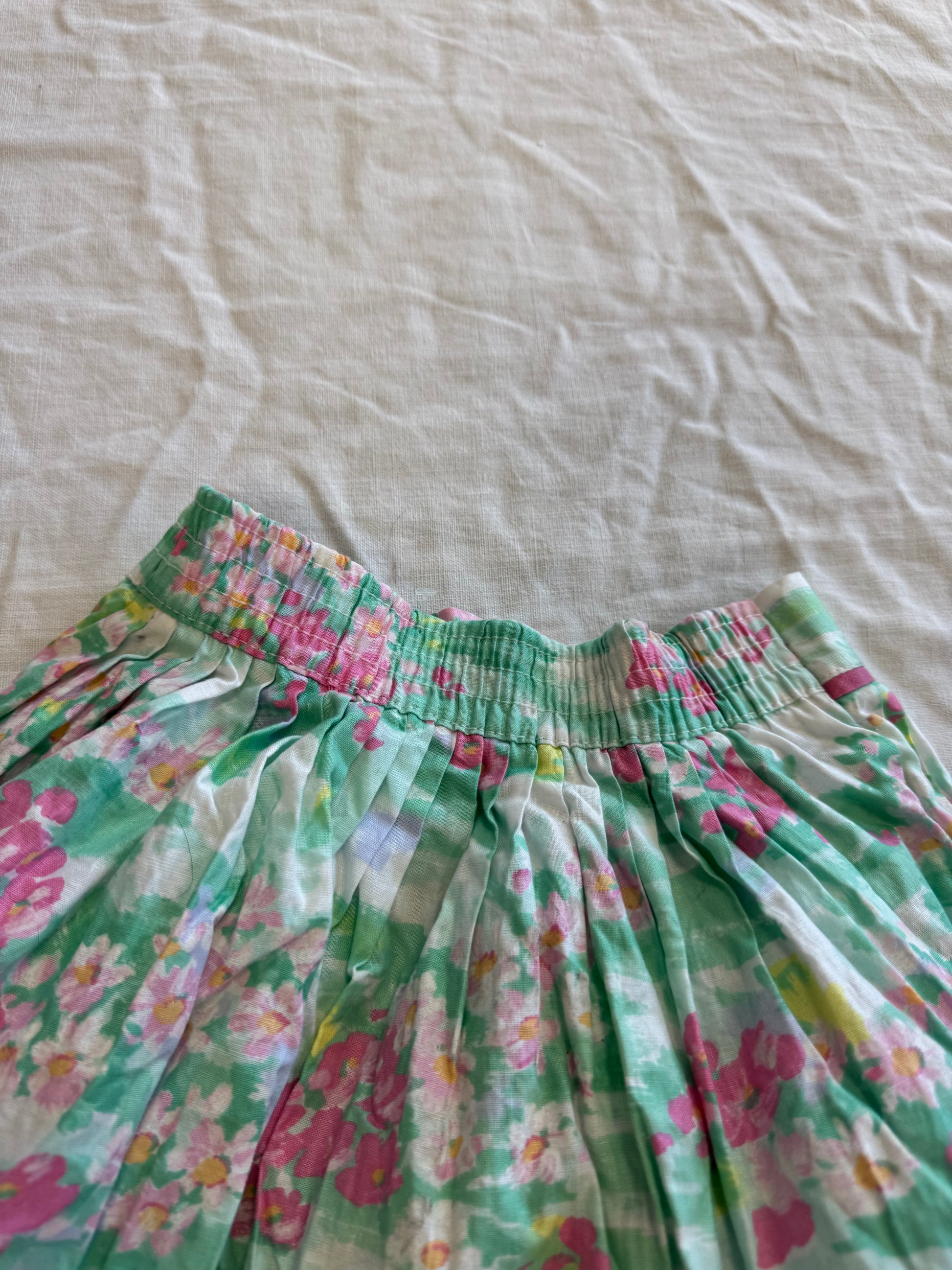 Jupe longue à fleurs dans les tons vert et rose, fermeture par un bouton.