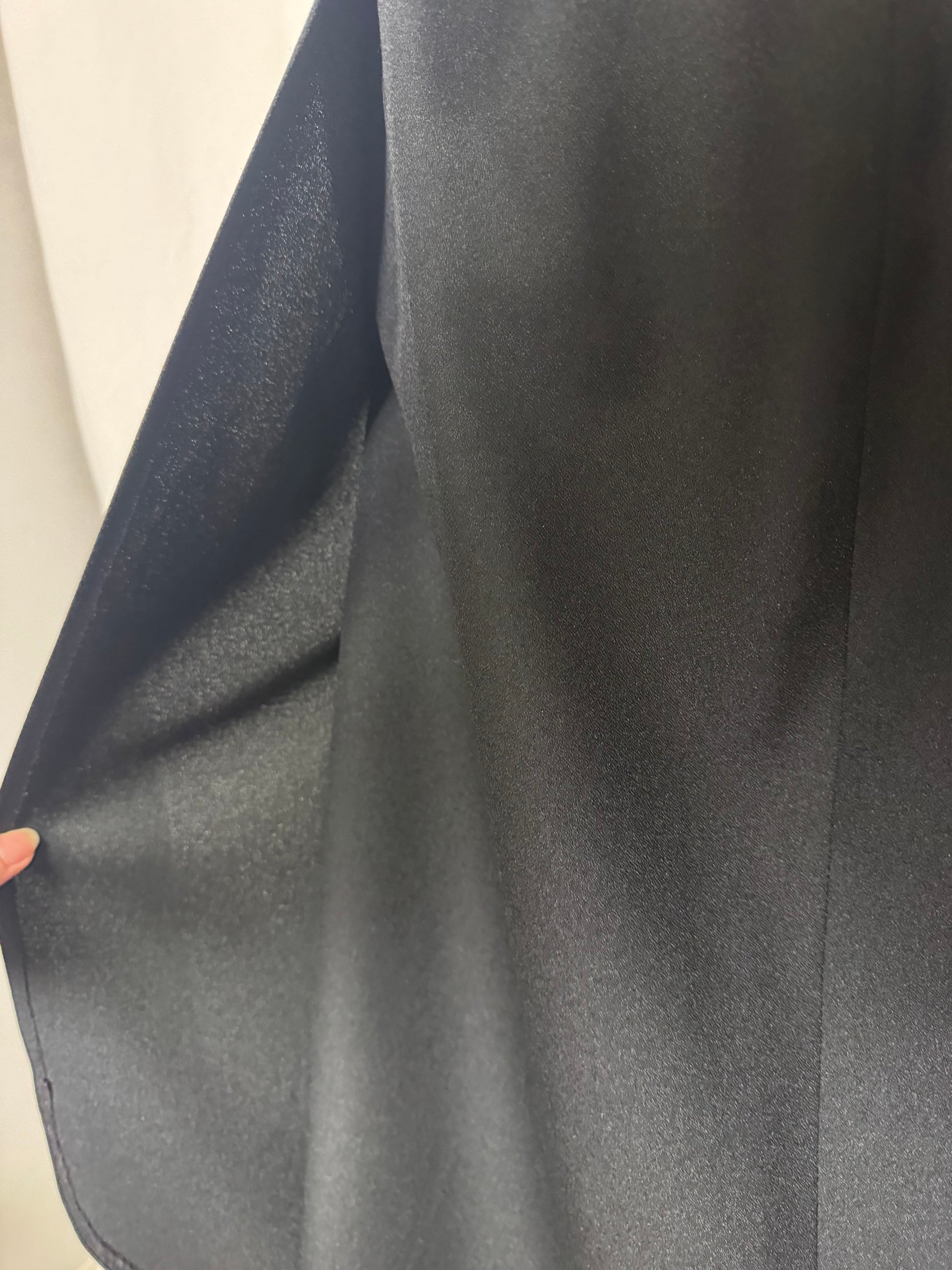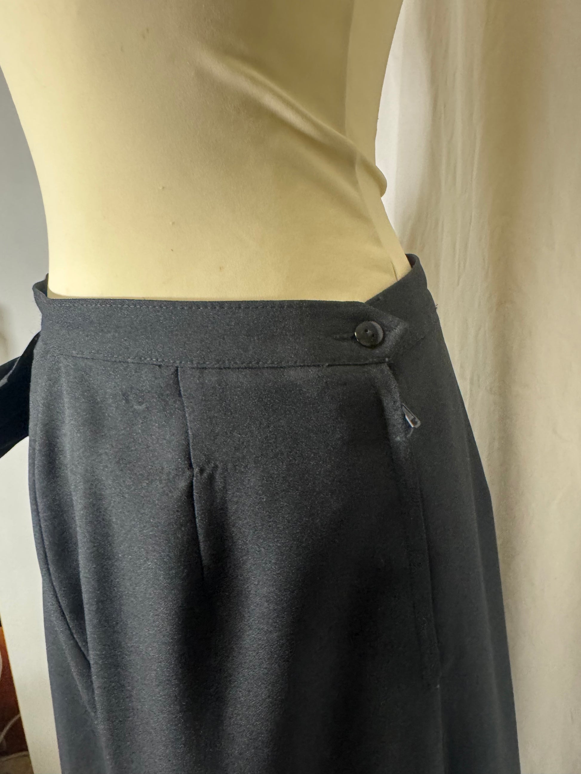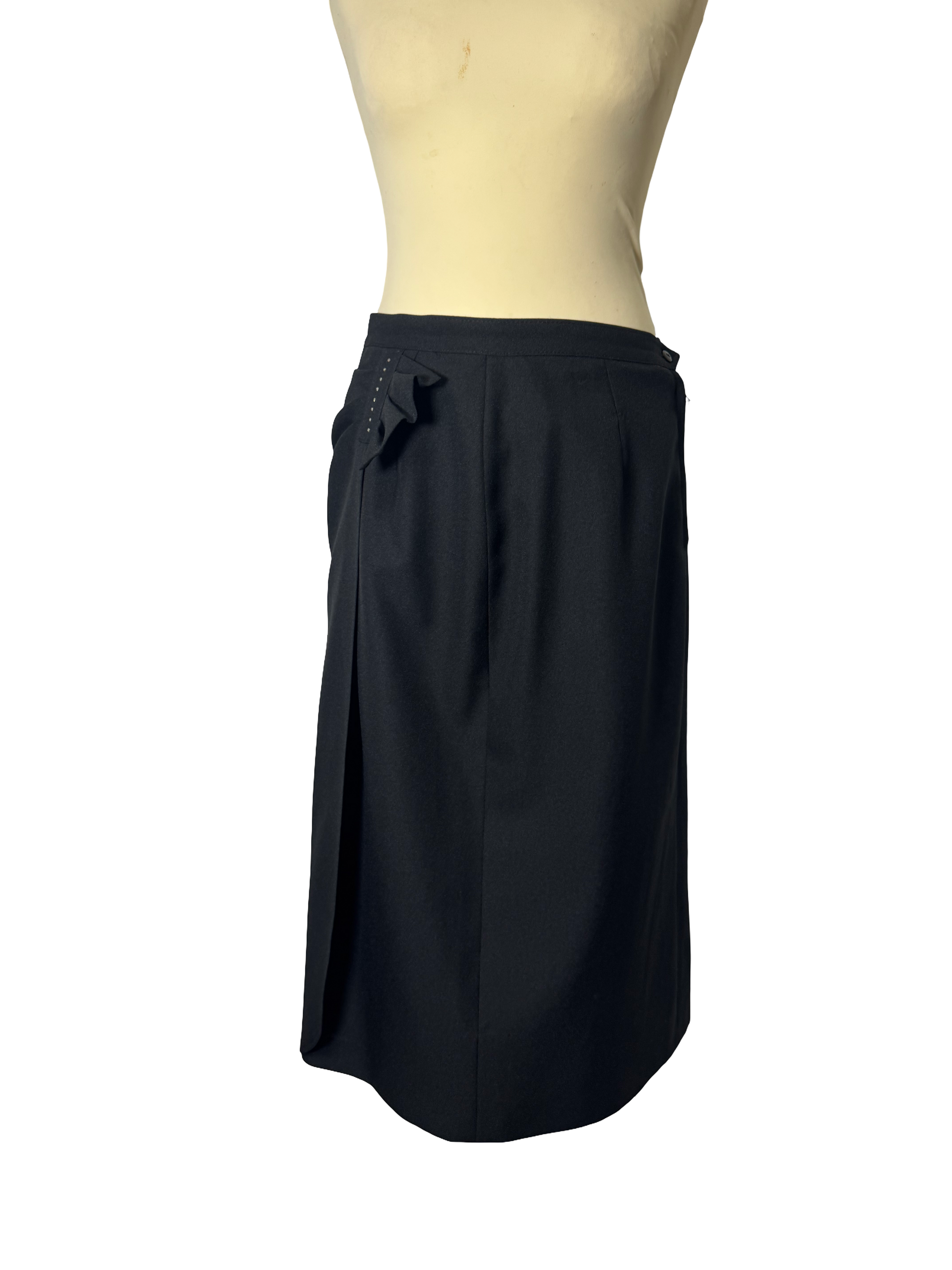 Jupe mi longue des années 80, noire, effet noeud sur l'avant droit avec des strass; fermeture éclair sur le côté.