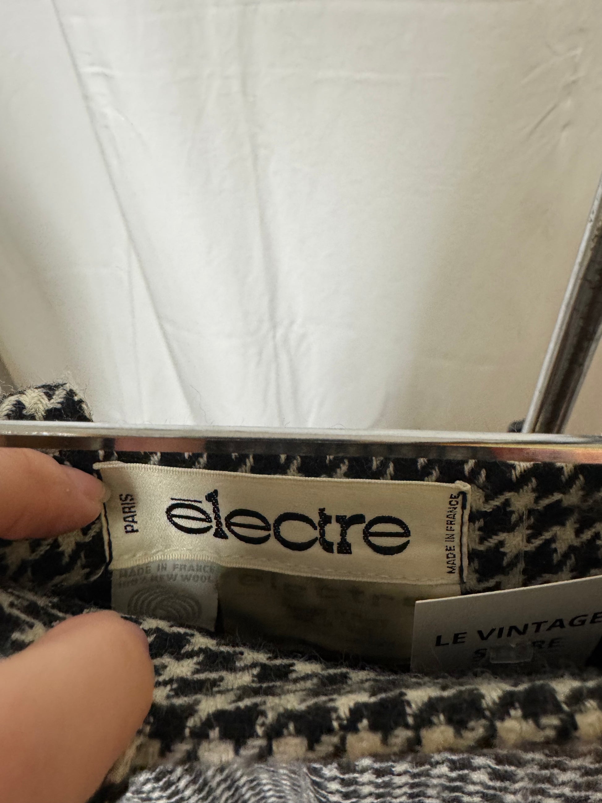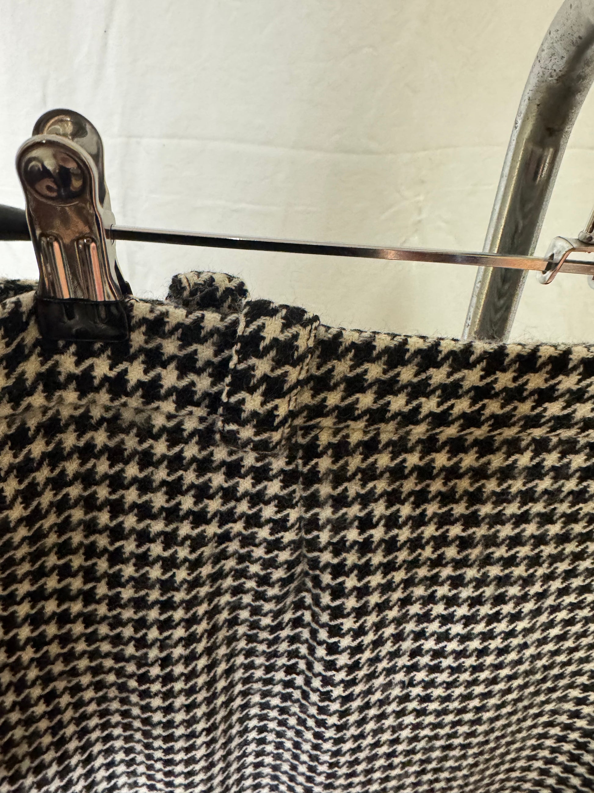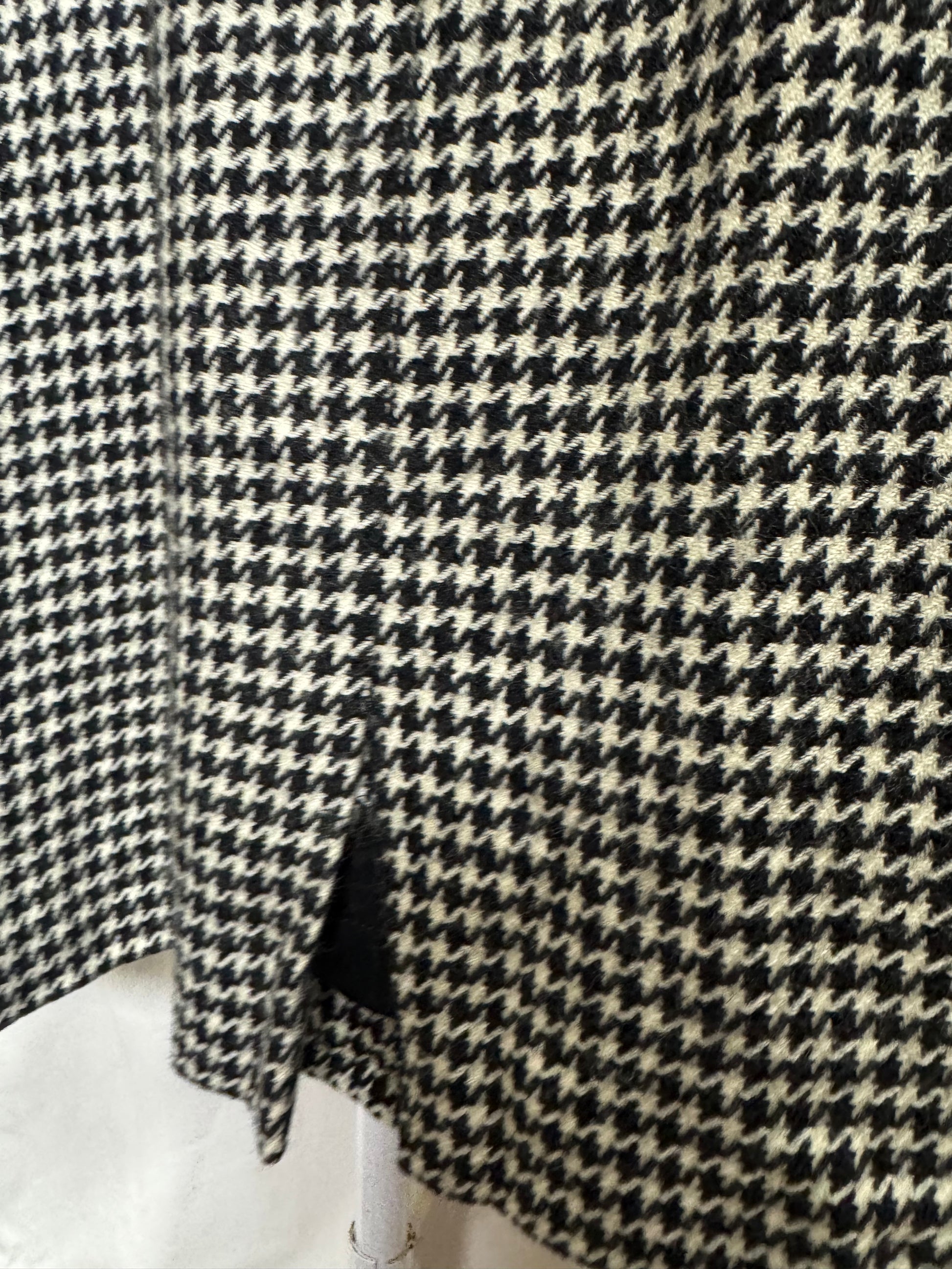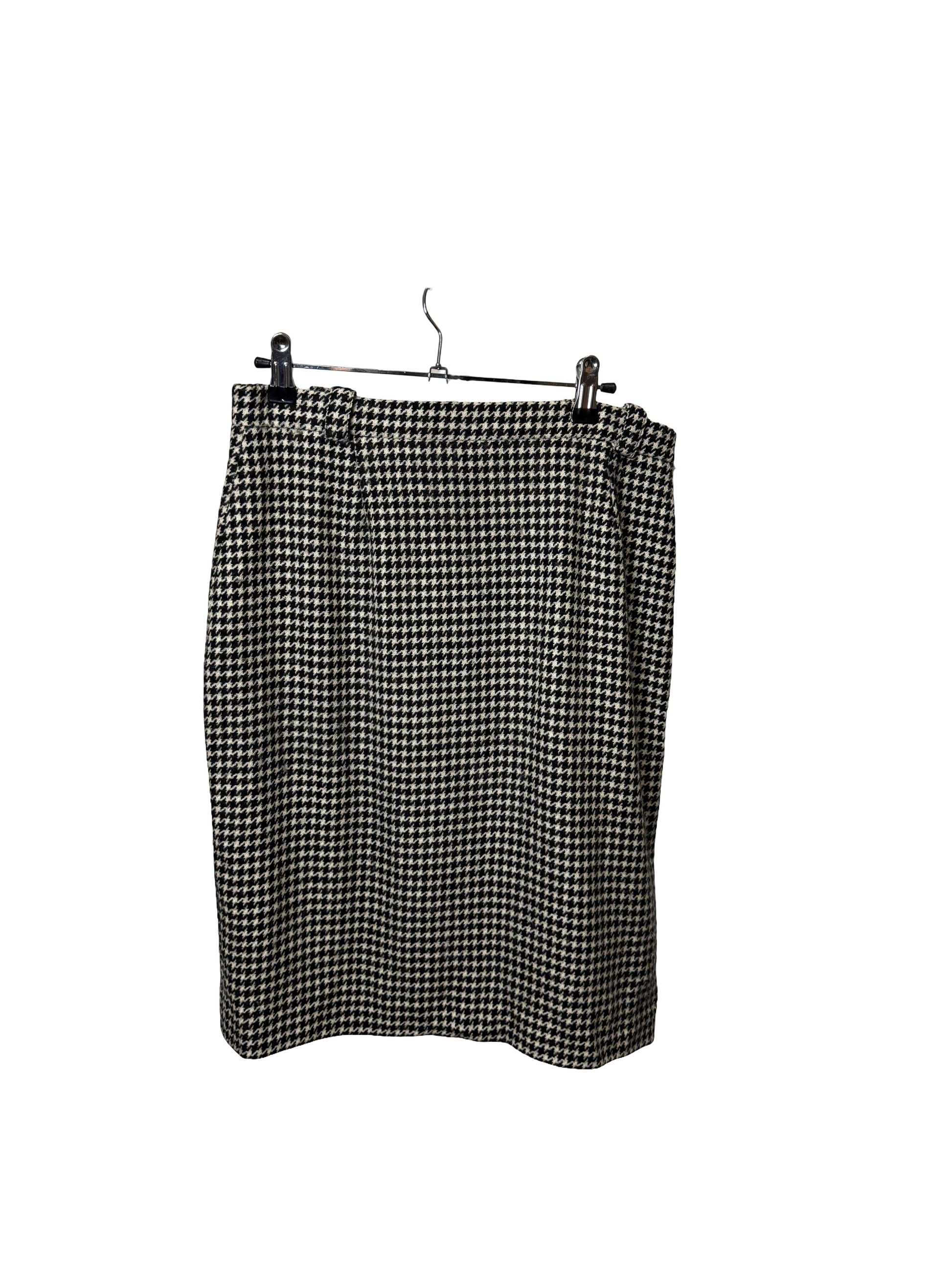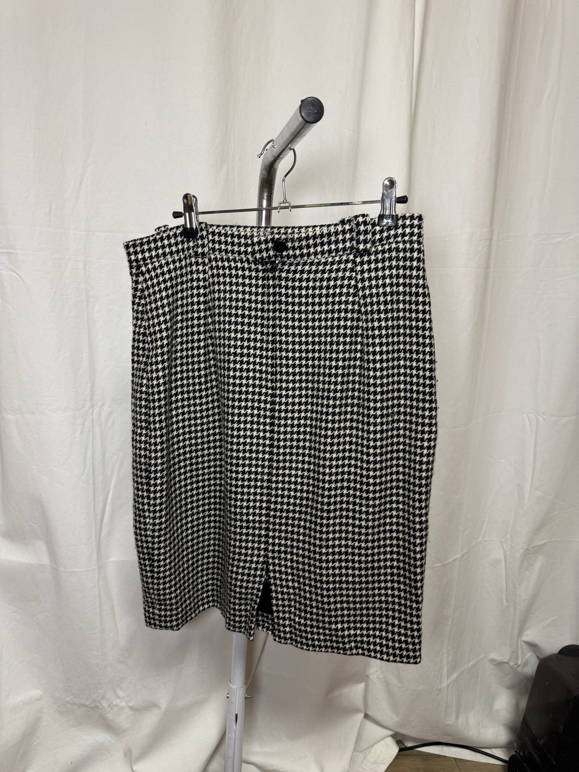 Jupe crayon, pied de poule noir et blanc, fermeture éclair dans le dos, passant pour une ceinture, petite fente dans le dos.