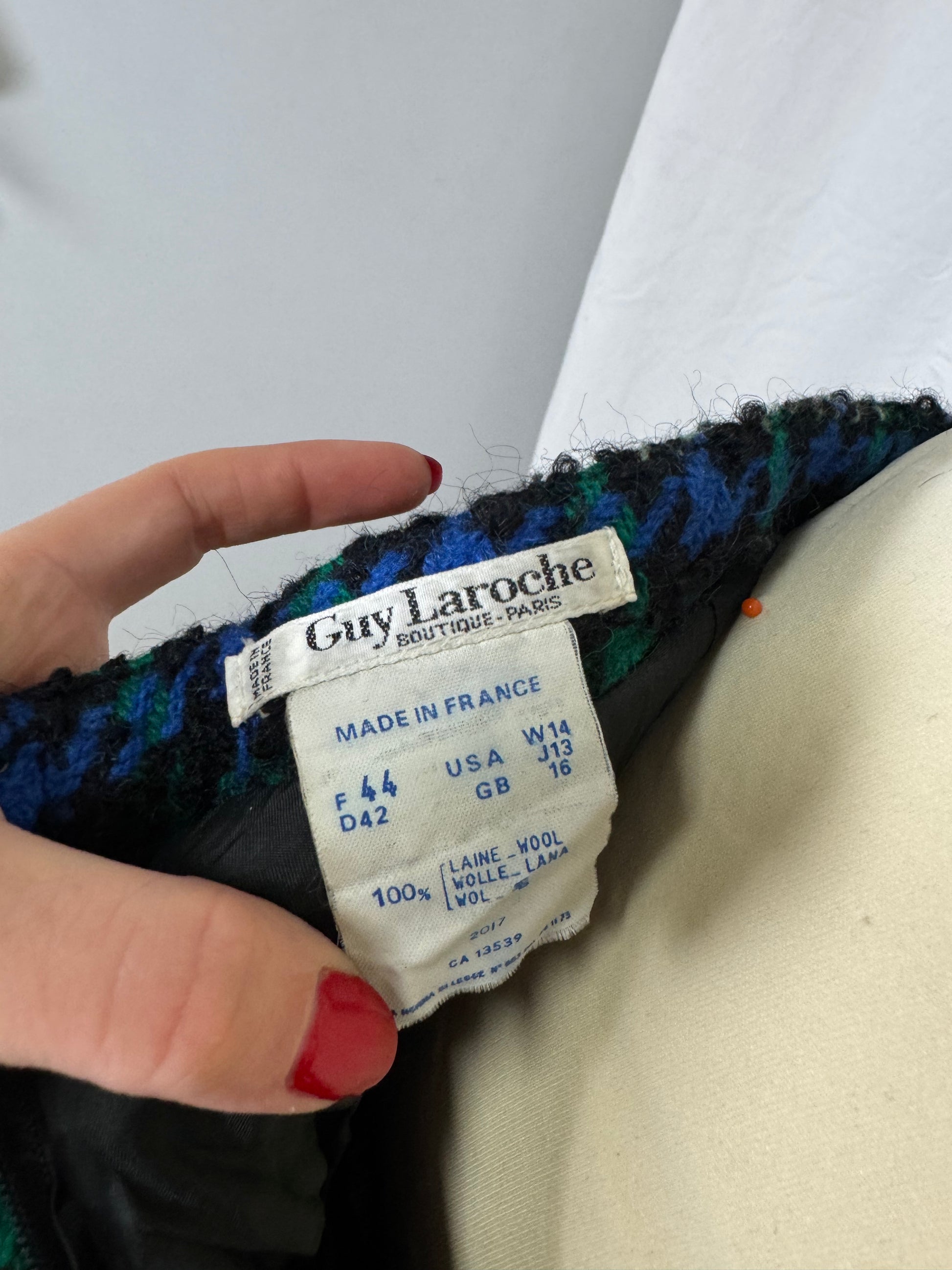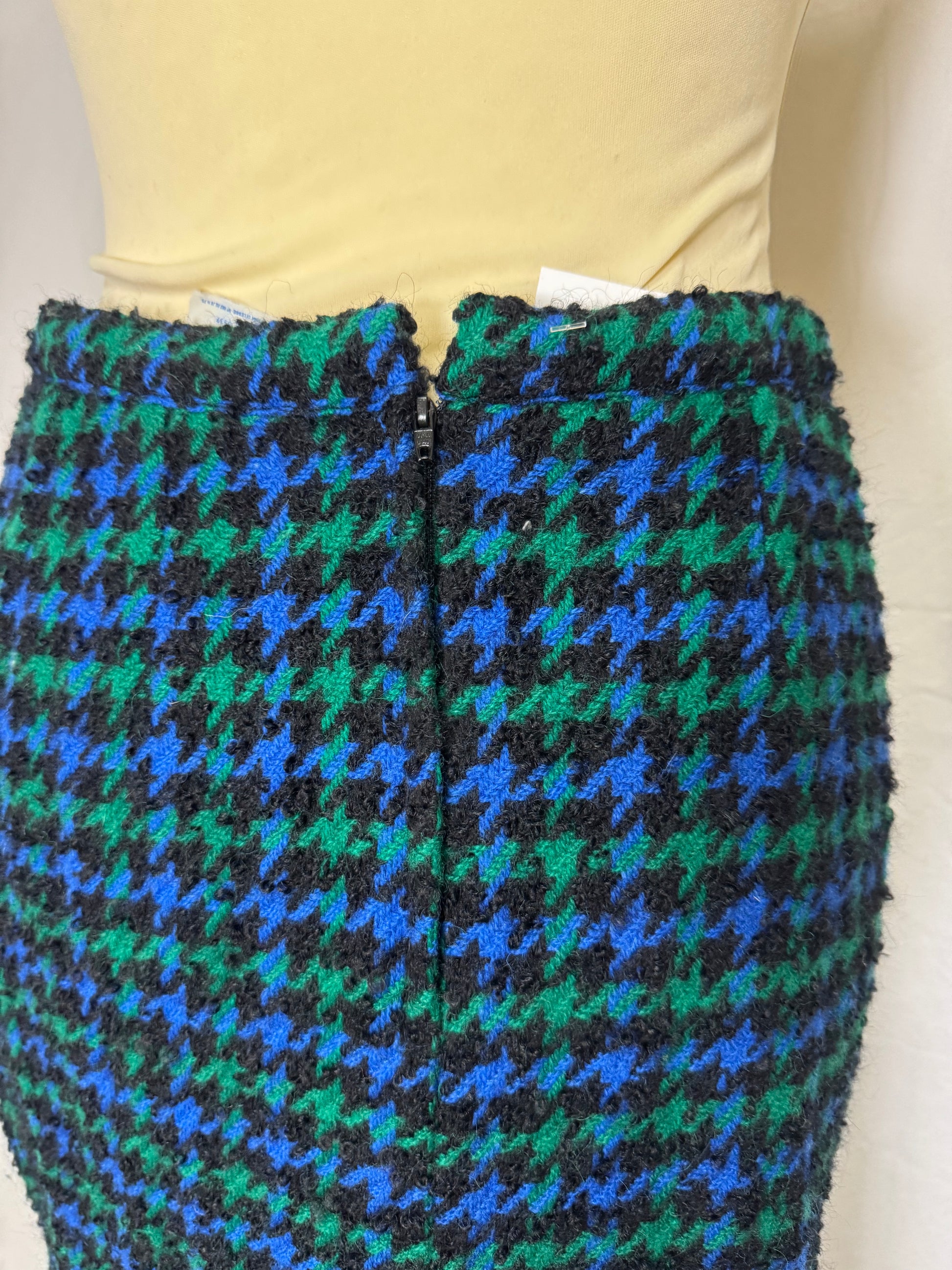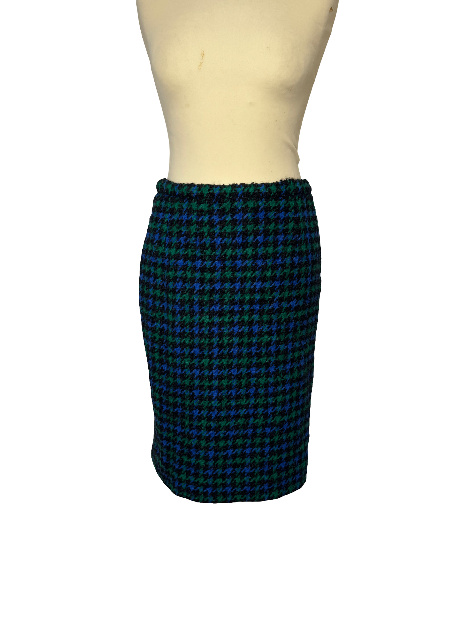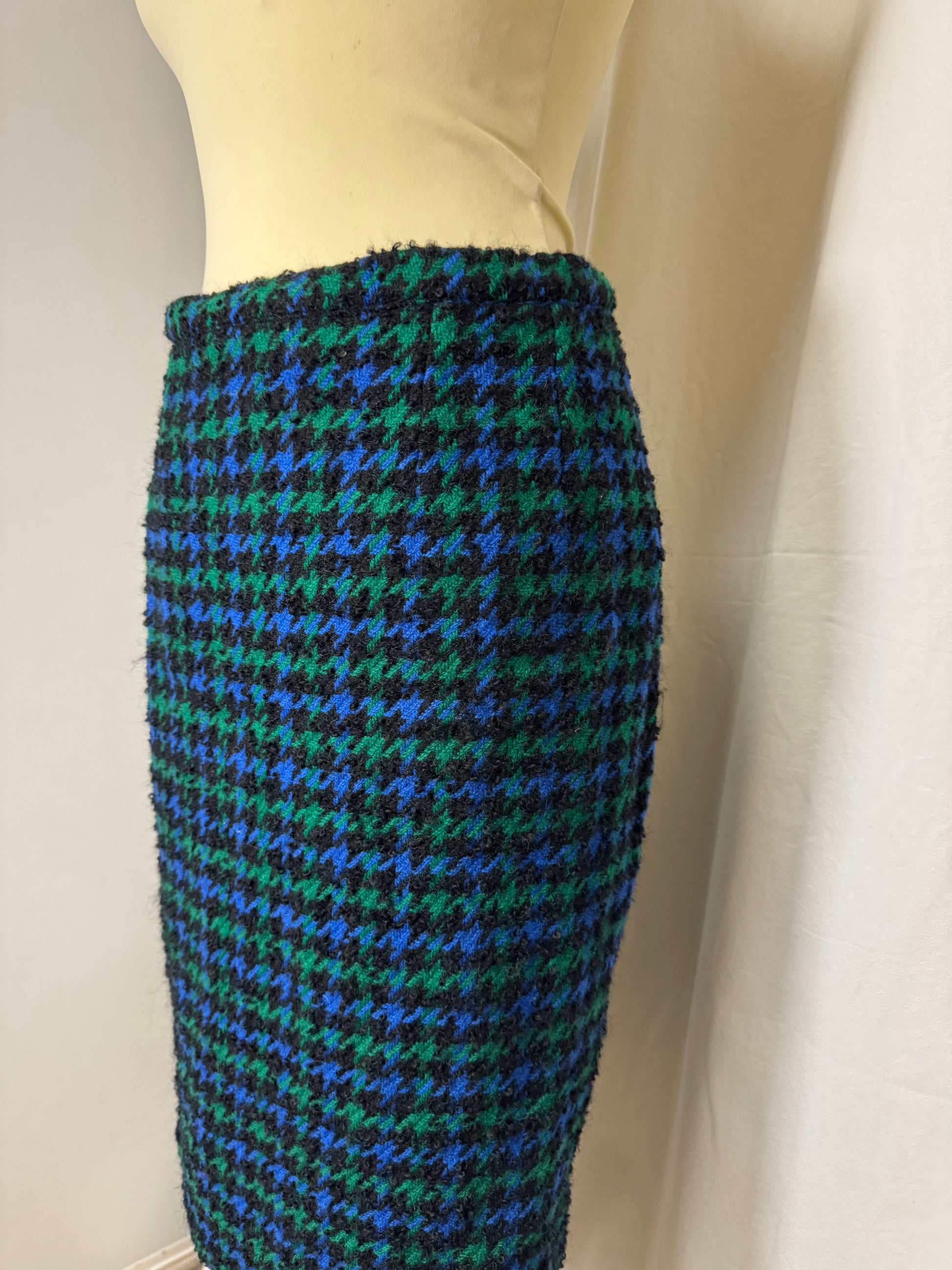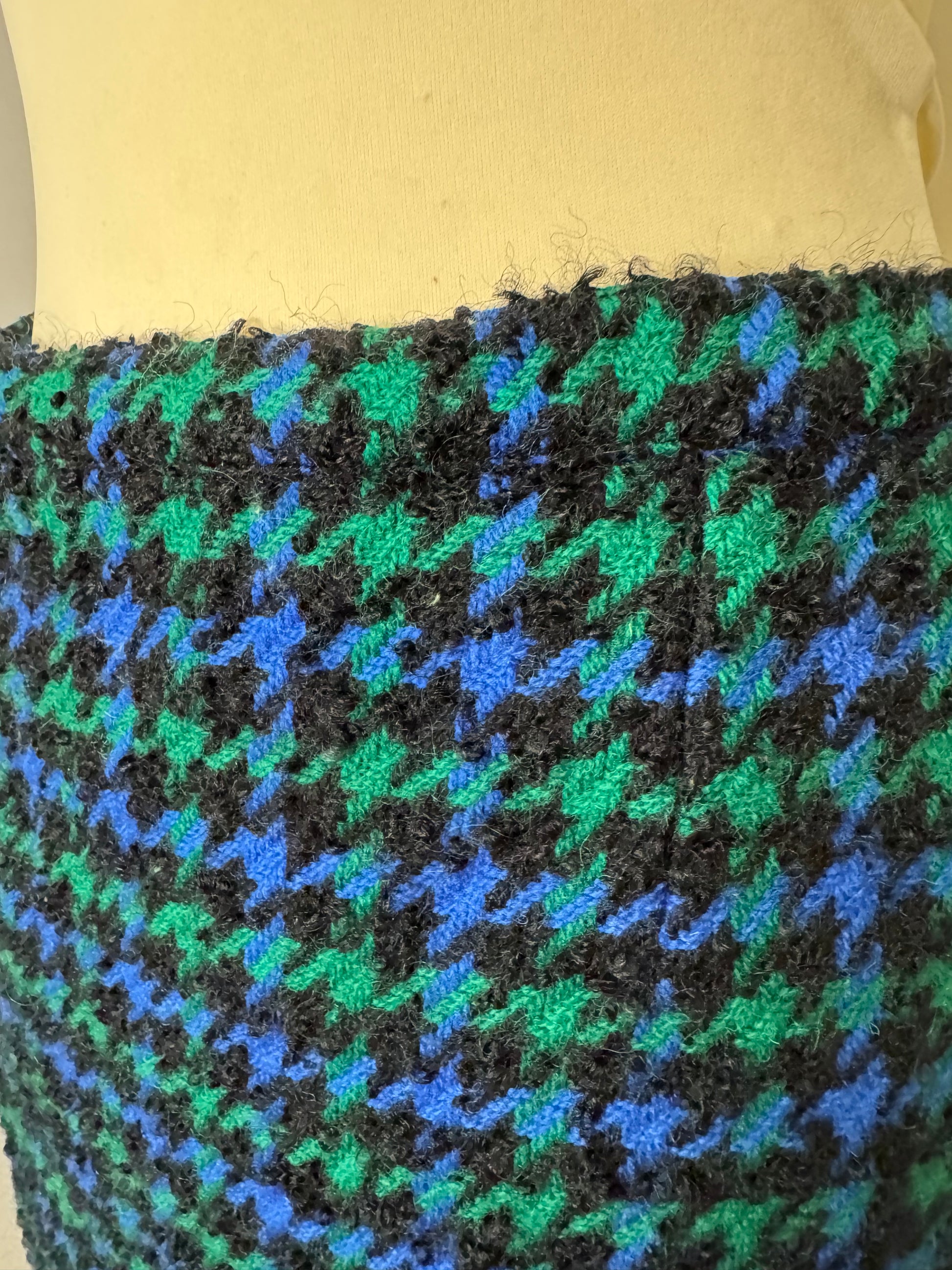 Jupe mi longue coupe crayon, pied de poule vert, bleu et noir, fermeture éclair dans le dos, une petite fente dans le dos.