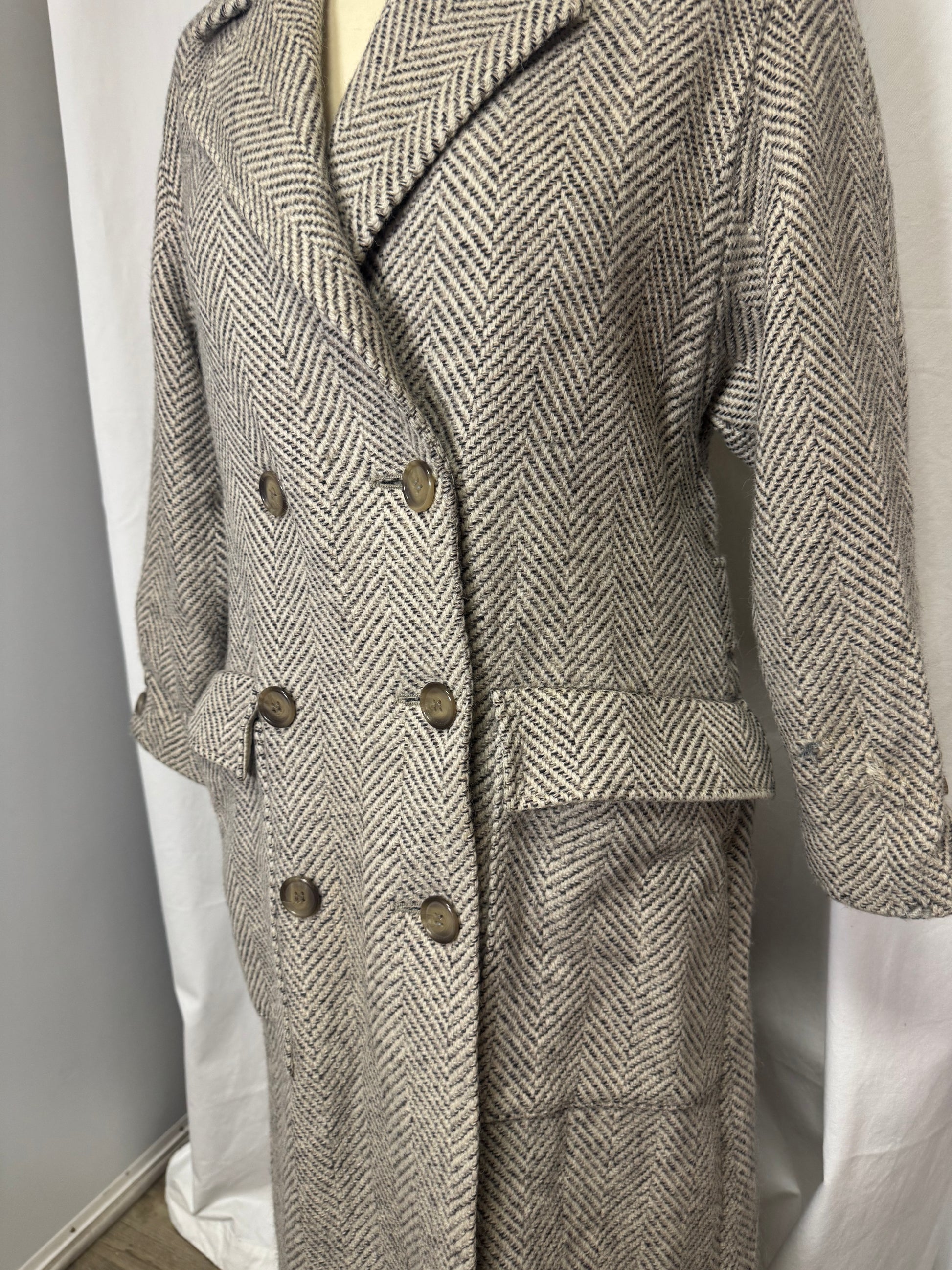Manteau mi long, chevron crème et noir, fermeture par trois boutons, deux grandes poches.