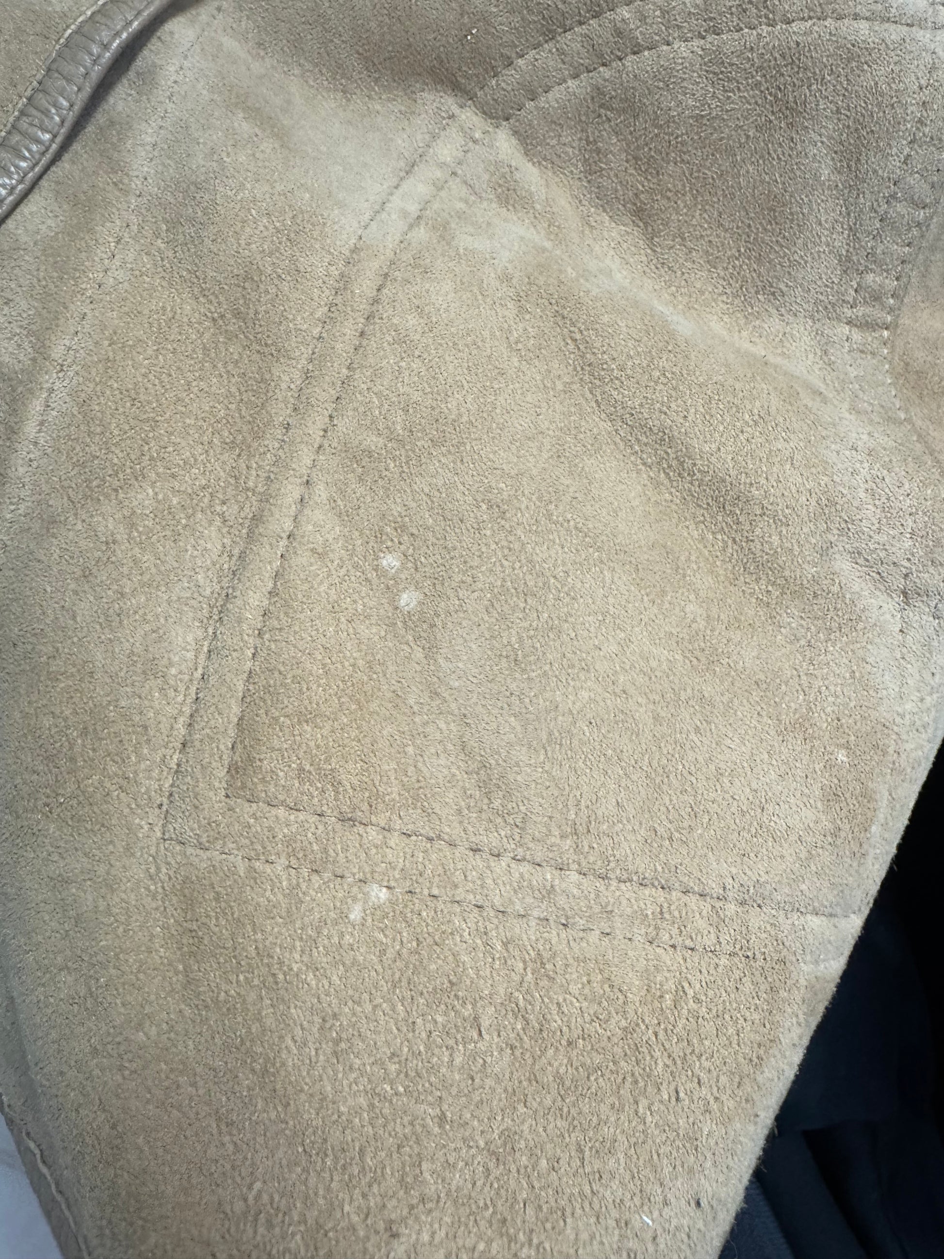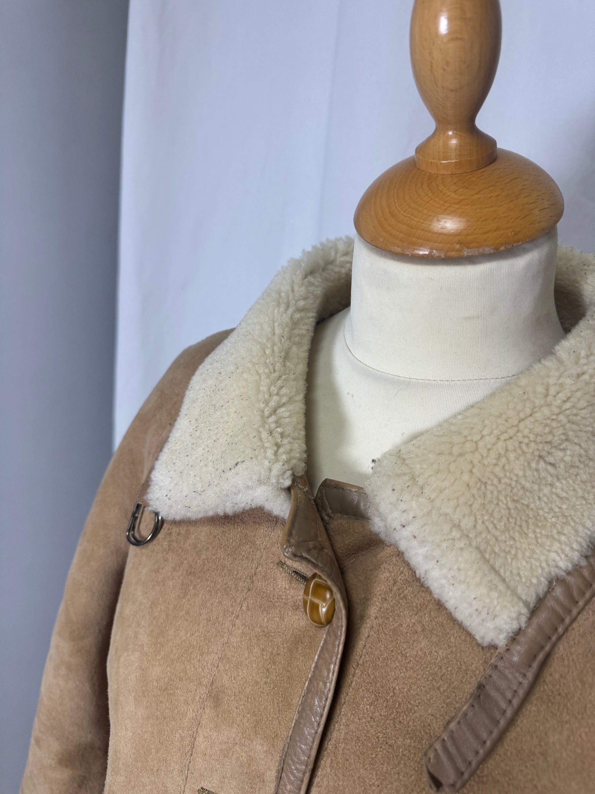 Manteau court en peau lainée, beige, deux poches, boutons,