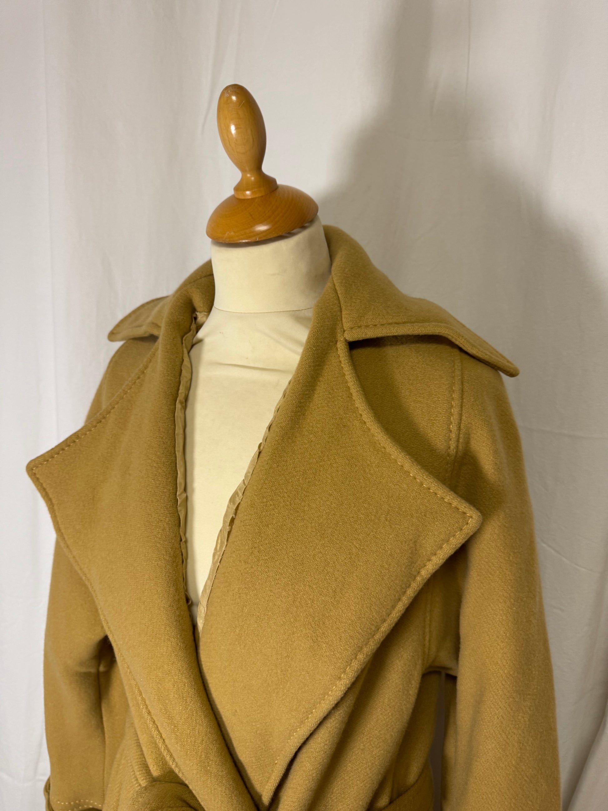 Manteau long beige, grand col, ceinturée, pas de fermeture, deux poches, fentes sur les côtés.