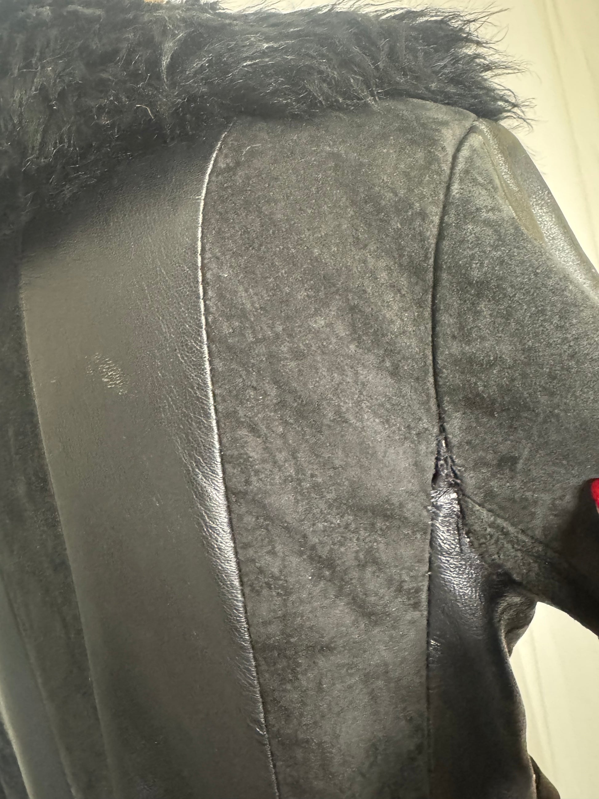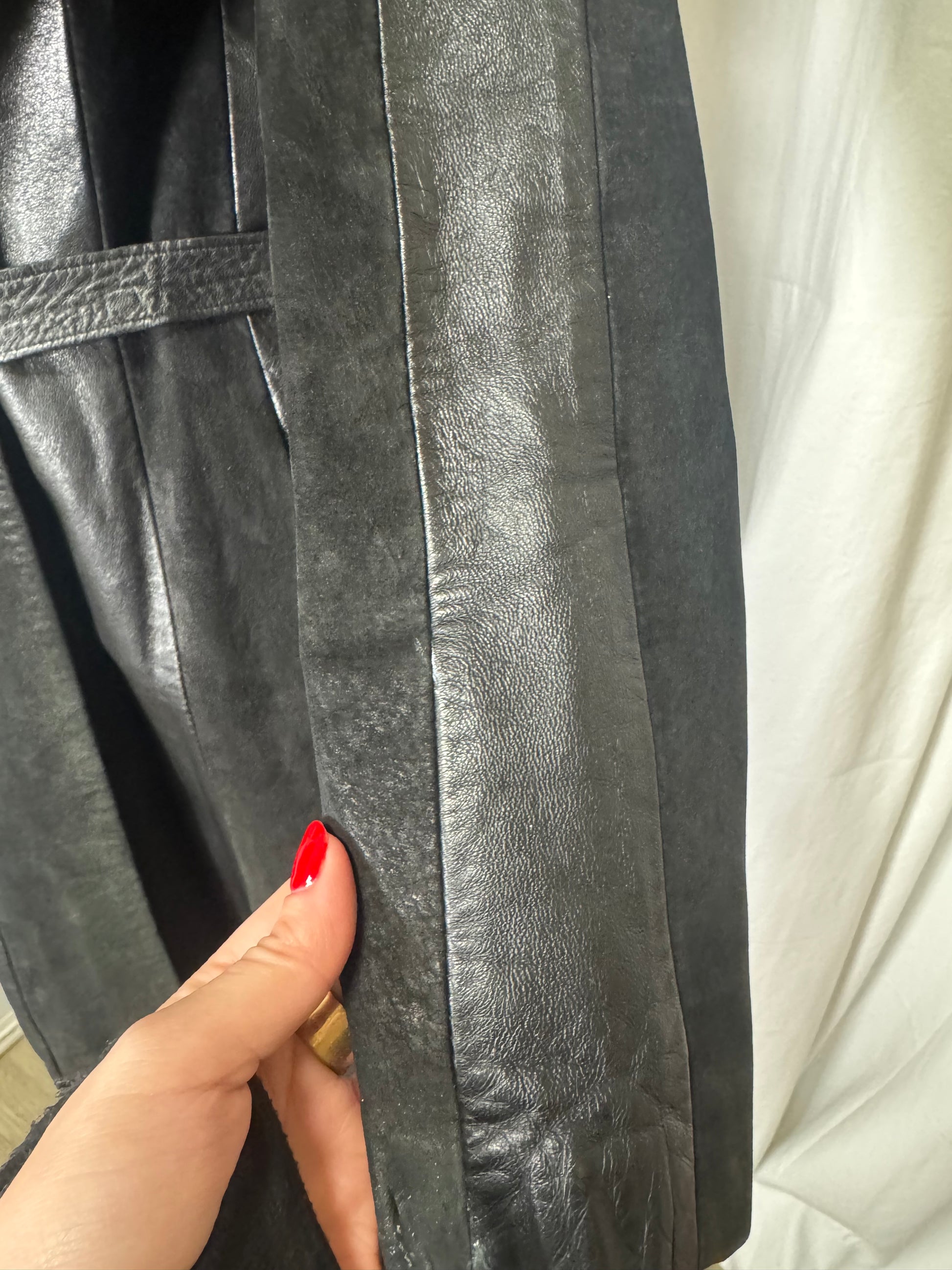 Manteau long en cuir et daim noir, col en fausse fourrure, ceinturée, fermeture par un bouton, deux poches.
