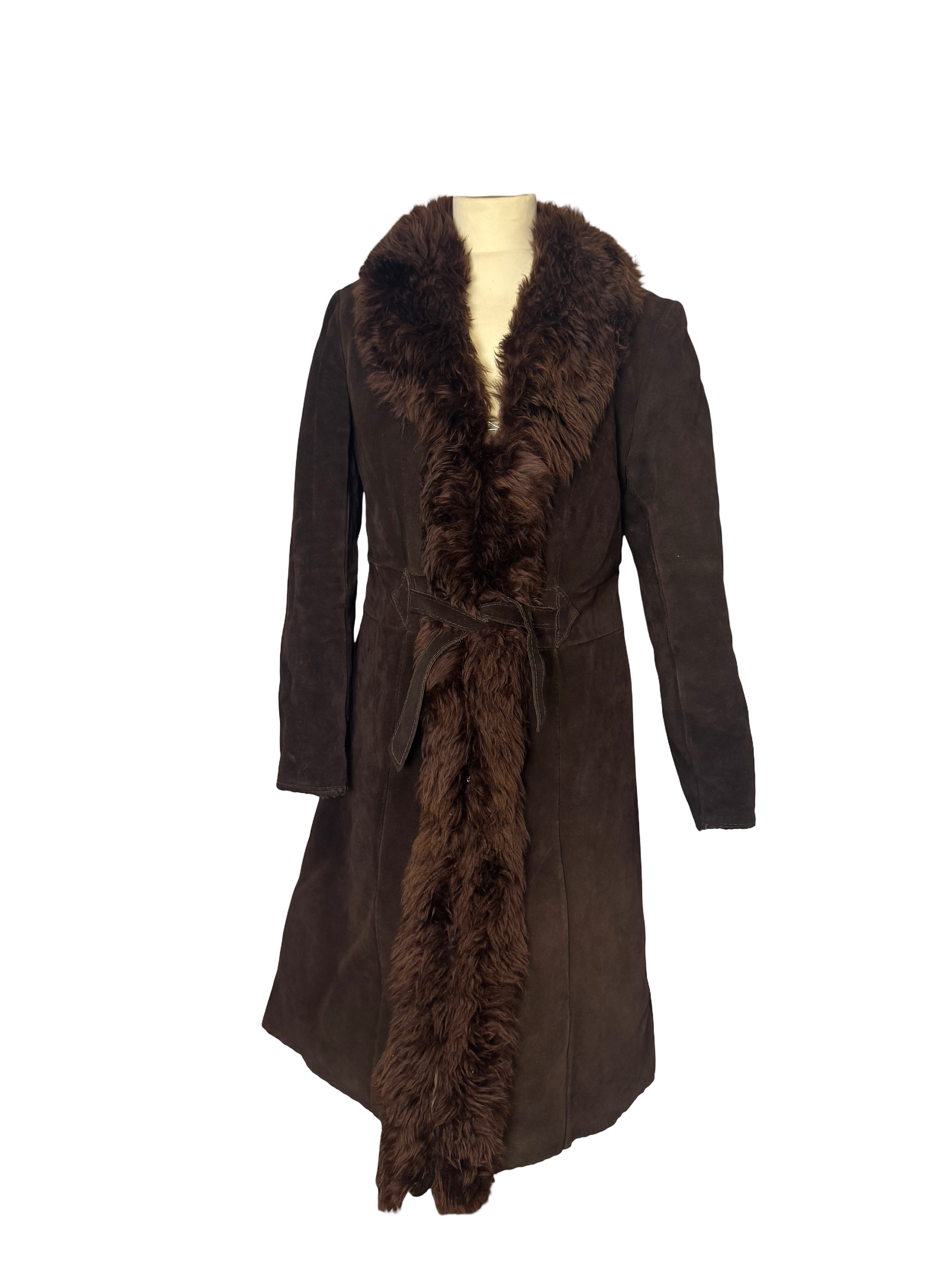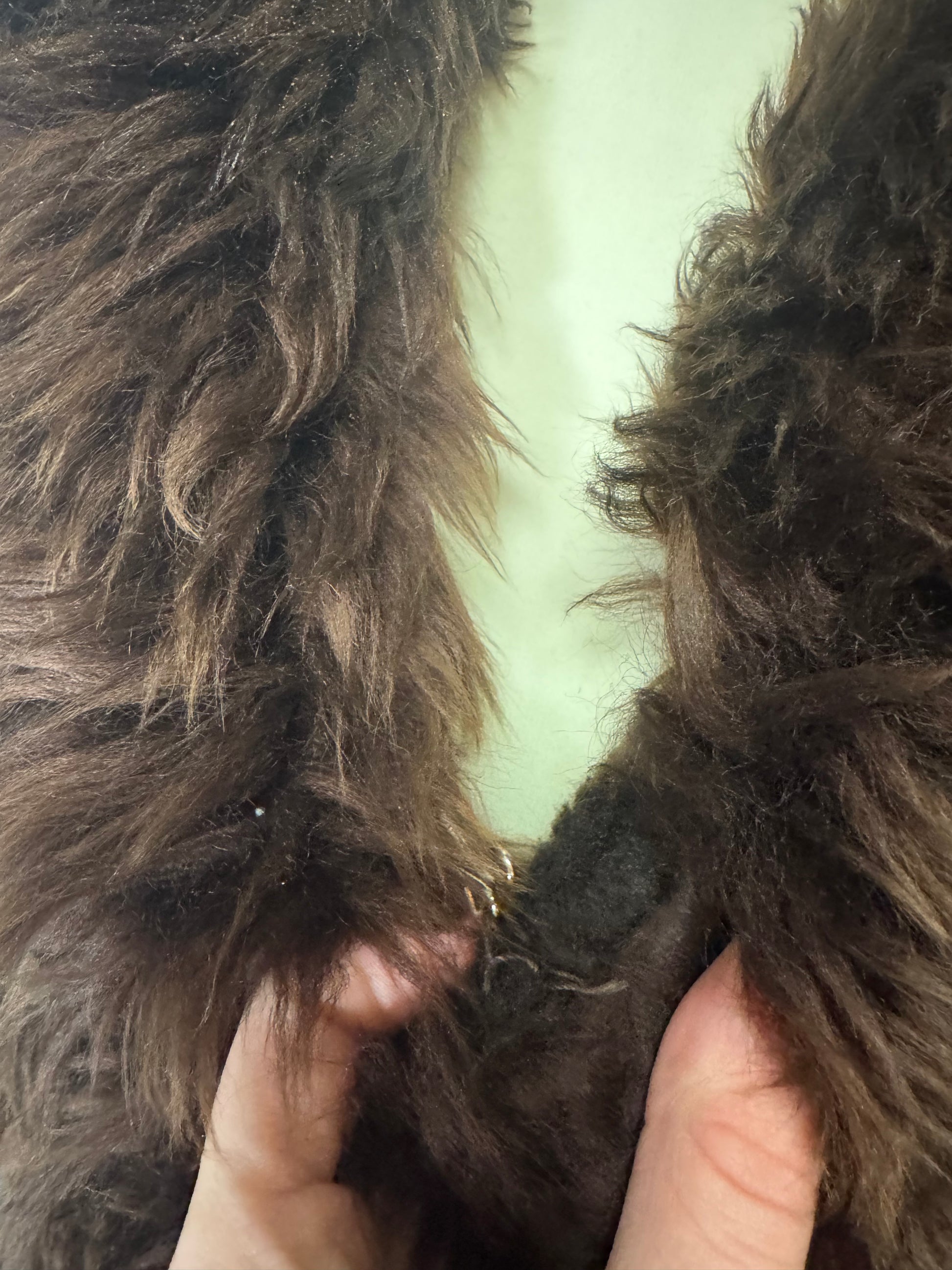Veste longue en peau marron foncé et fausse fourrure marron, doublure en fausse fourrure, fermeture par deux attaches (attention elles sont un peu décousue par endroit).