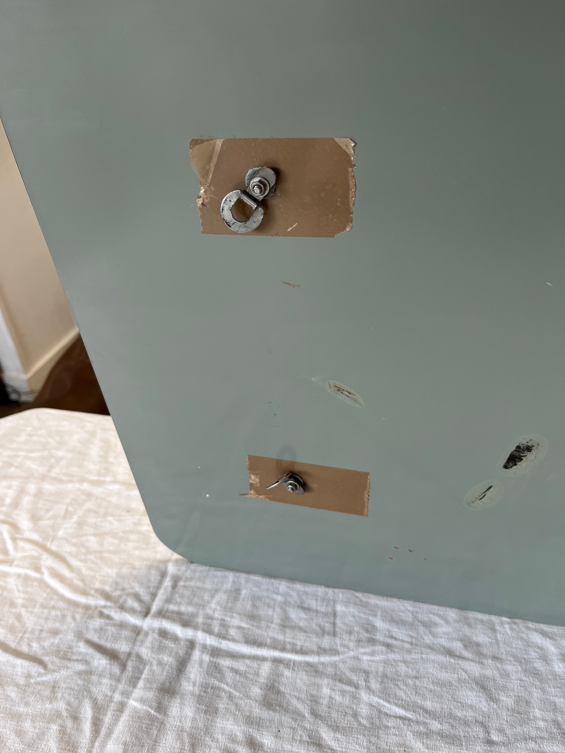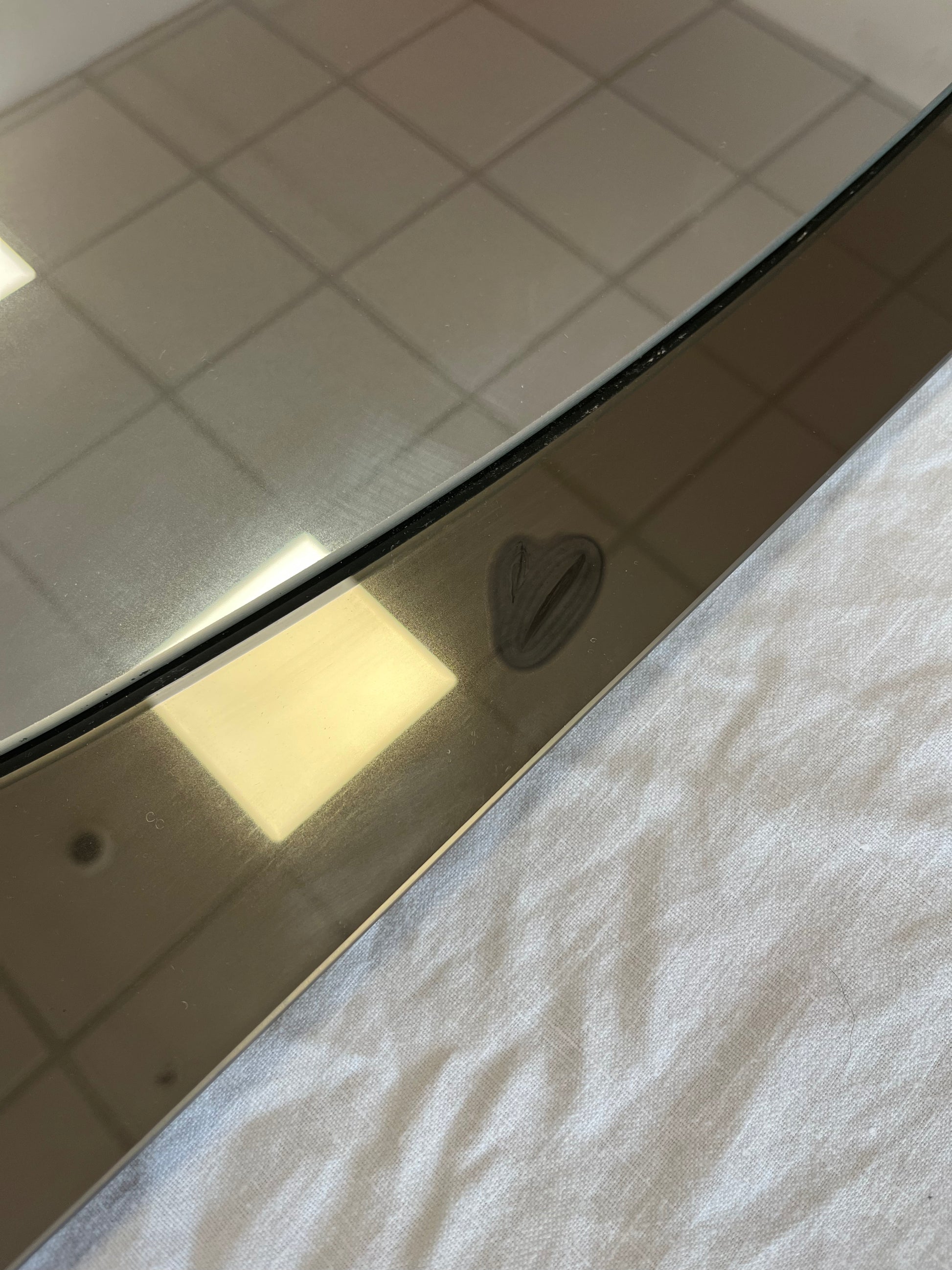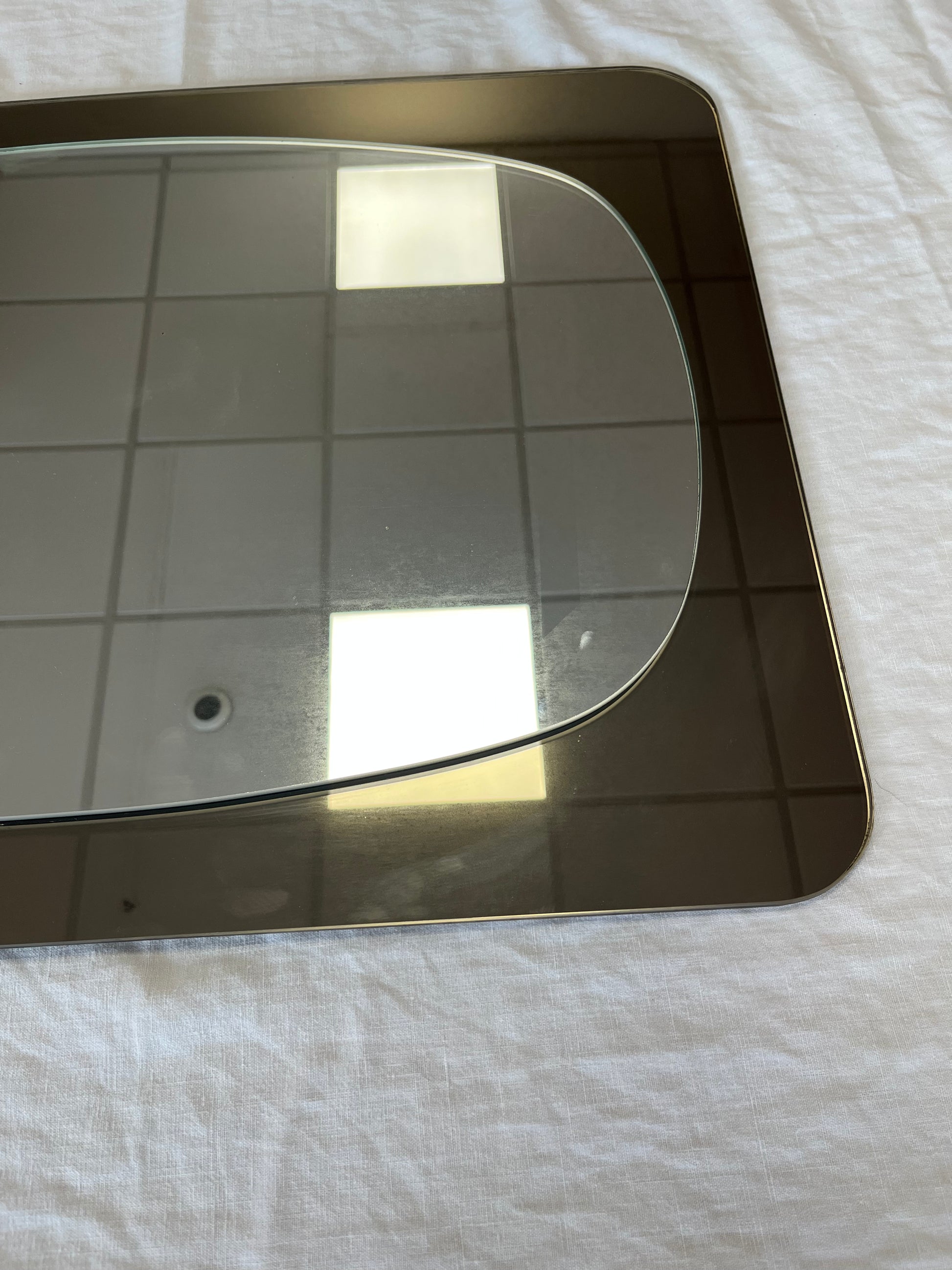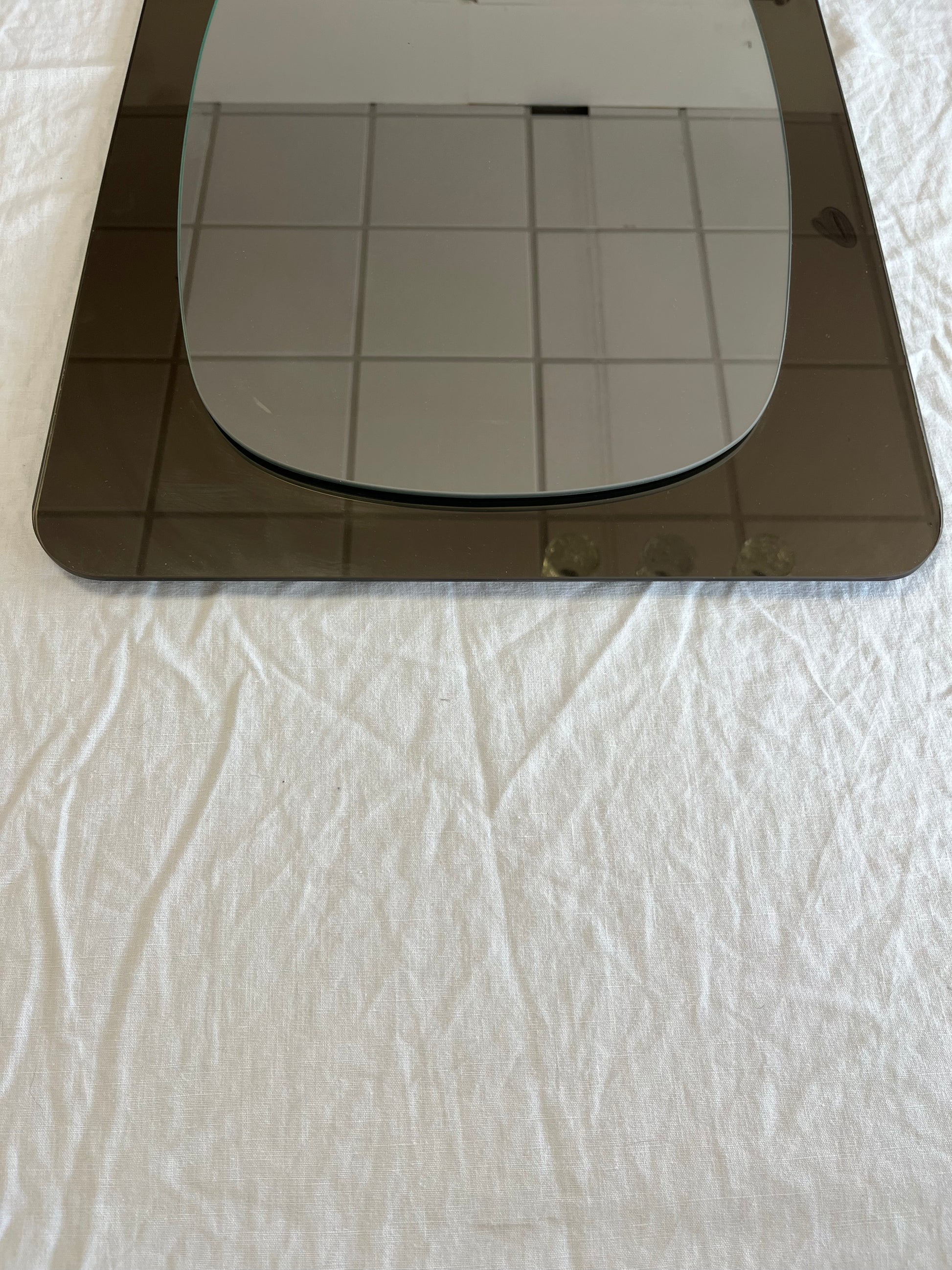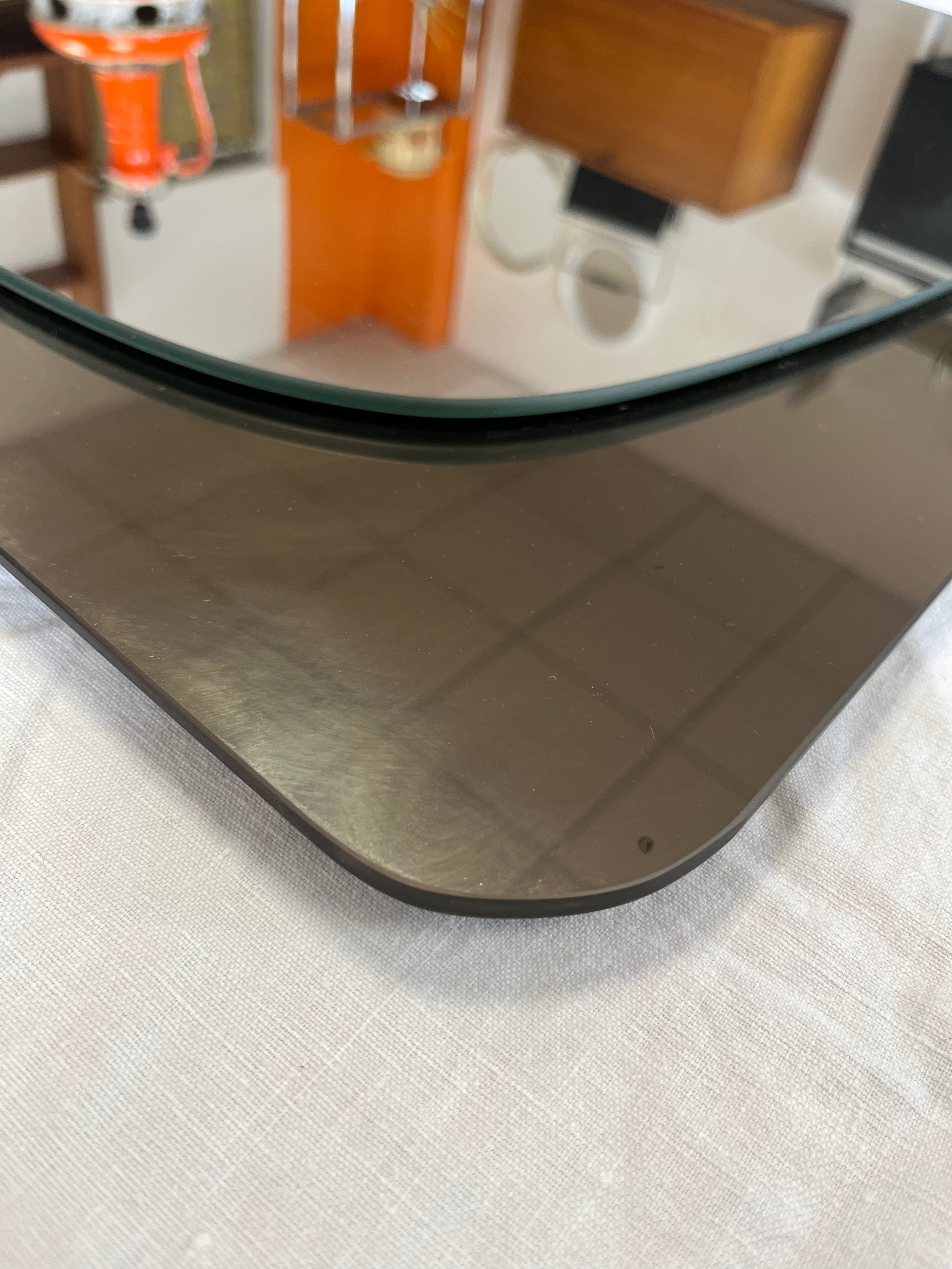 Miroir années 60’s de style Space age. Composé de deux plateaux miroirs collés, le plateau de fond est légèrement fumé. Deux attaches à l’arrière permettent de le mettre au mur. Très bon état général malgré une petite tâche visible sur photos.