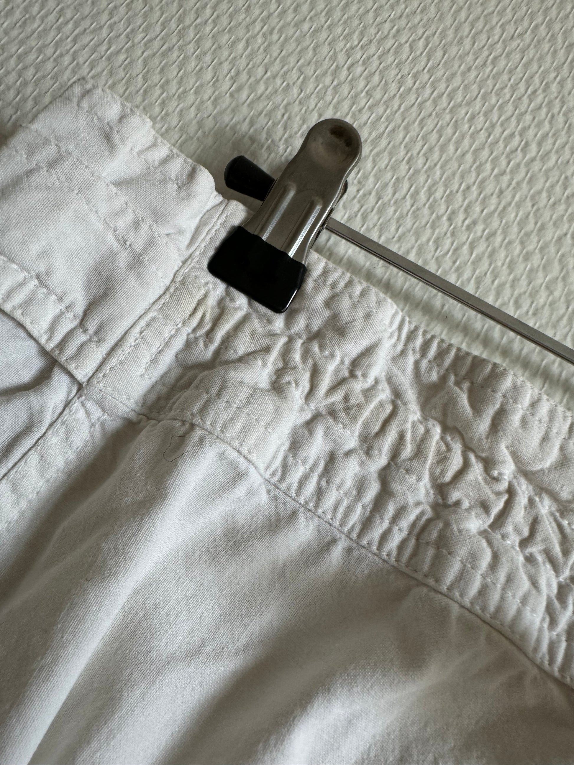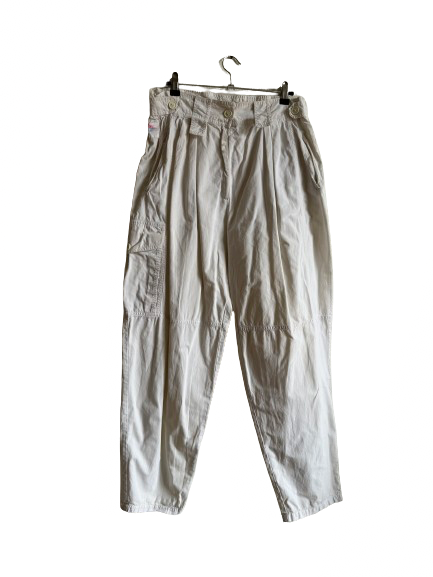 Pantalon blanc des années 80, coupe large, trois poches, légèrement transparent, taille haute.