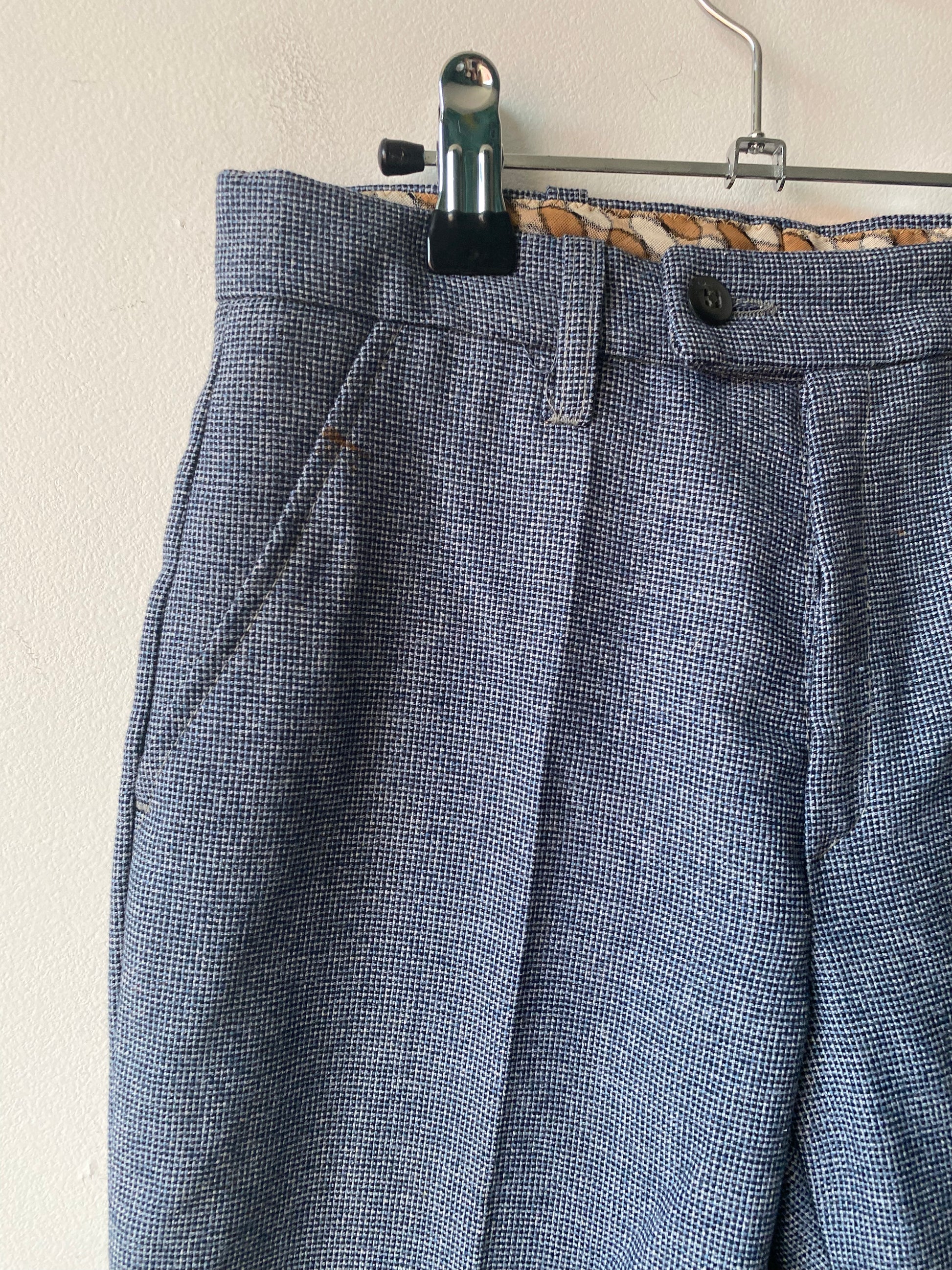 Pantalon bleu, petit carreaux légèrement plus foncé des années 70, taille haute, passant pour une ceinture, deux poches, patte d'eph, pas d'ourlet simplement un surjet.