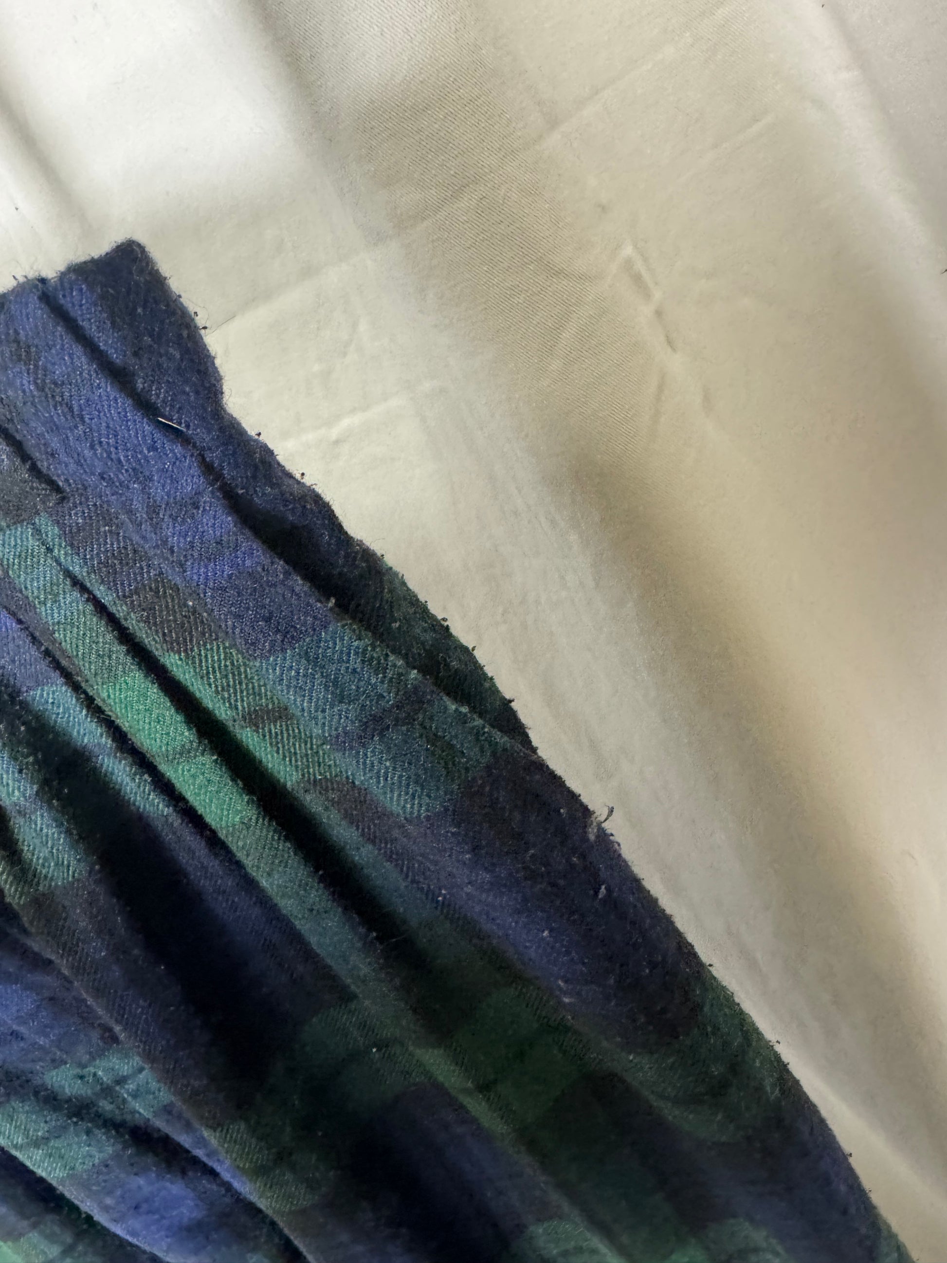 Pantalon écossais, vert et bleu, taille haute, passant pour une ceinture, trois poches,