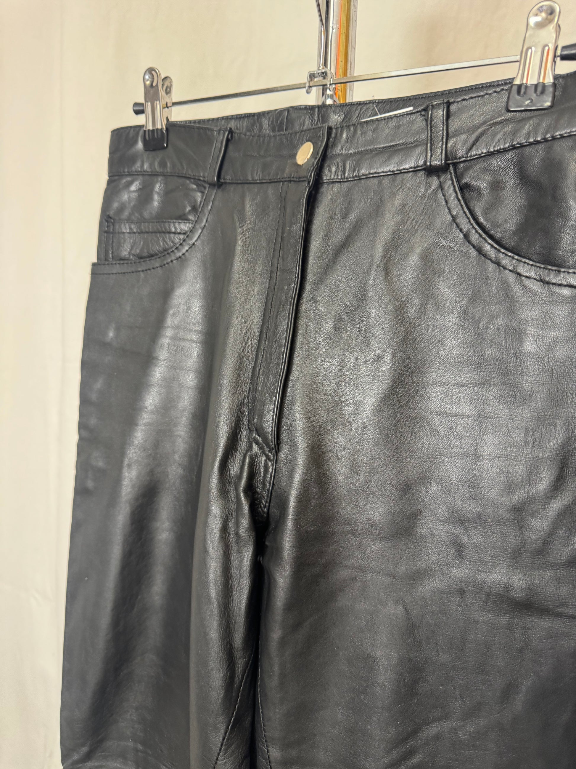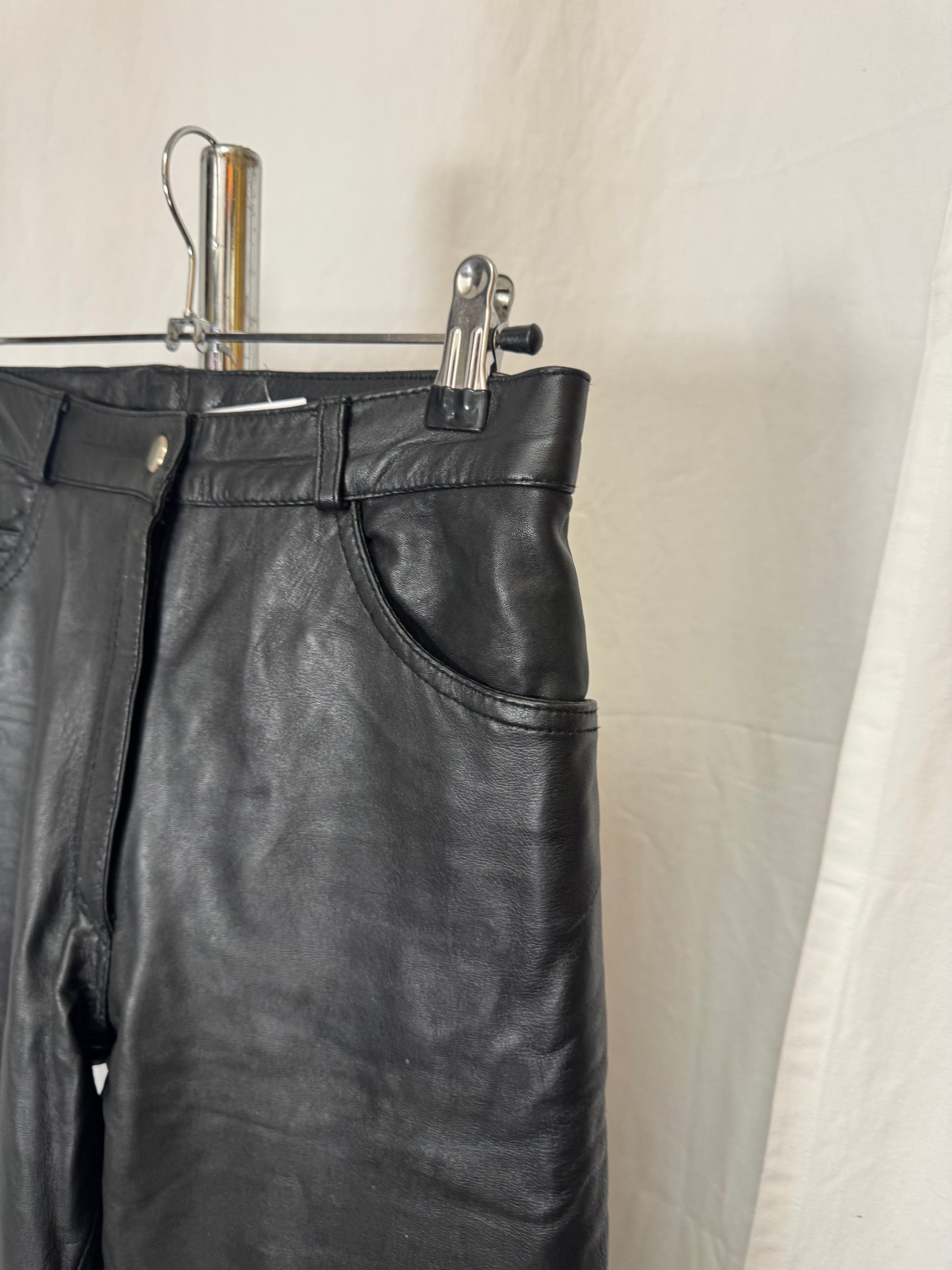 Pantalon en cuir noir, coupe ajustée, quatre poches, passant pour une ceinture, taille haute.