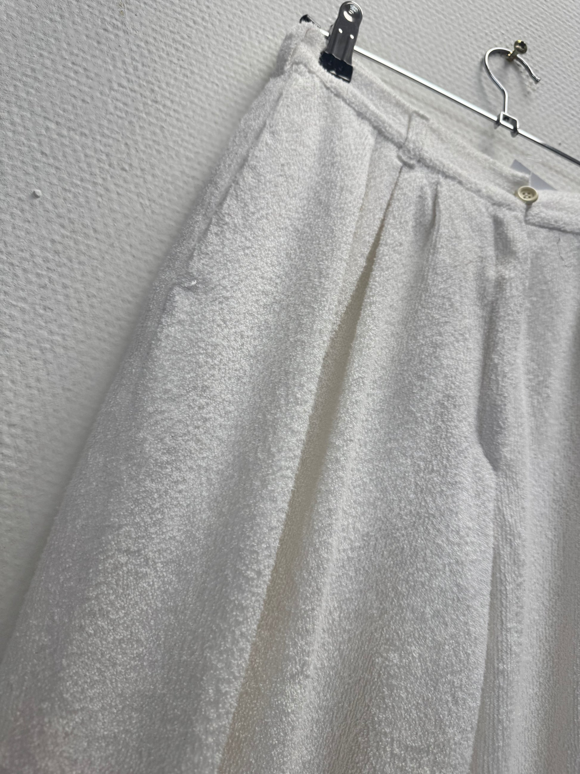 Pantalon des années 80, taille haute, matières éponges, trois poches, passant pour une ceinture.