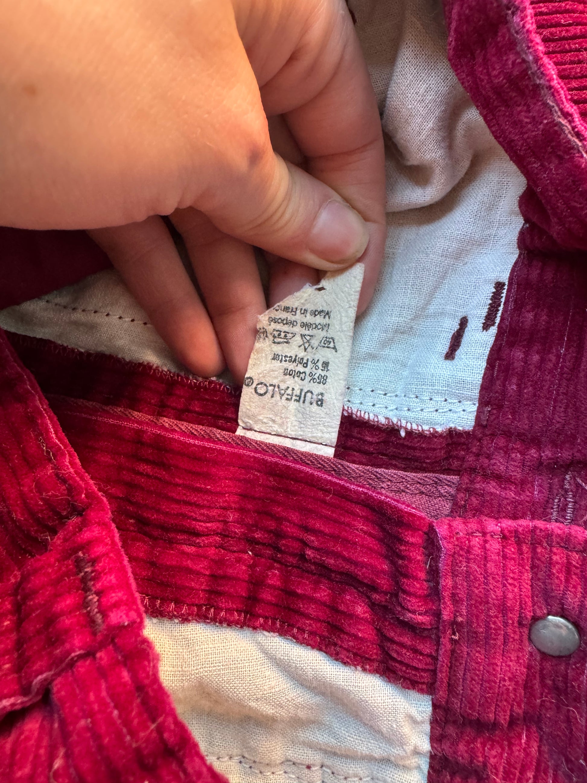 Pantalon en velours côtelés bordeaux, quatre poches, passant pour une ceinture, coupe droite.