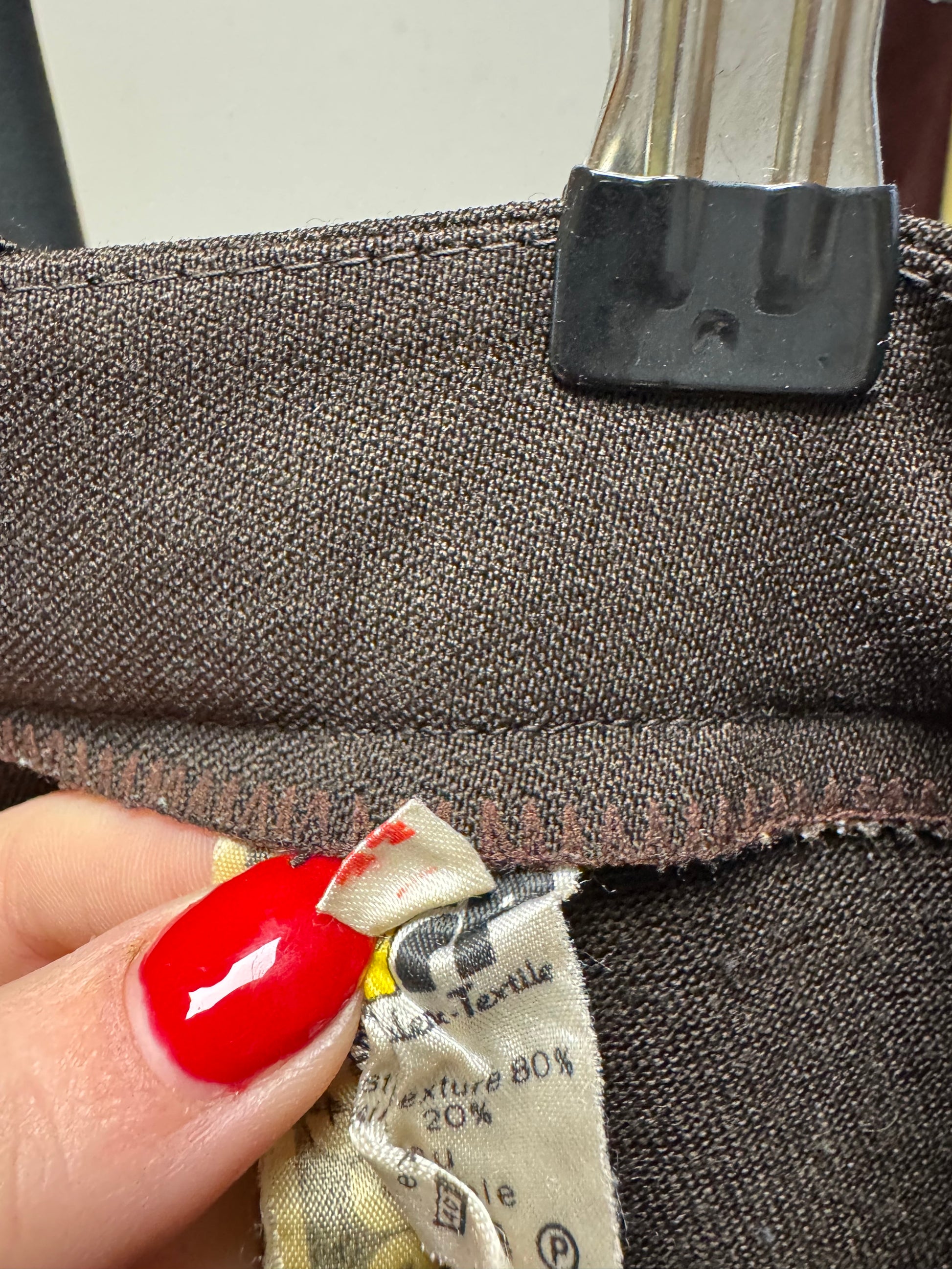 Pantalon marron des années 70, large, passant pour une ceinture.