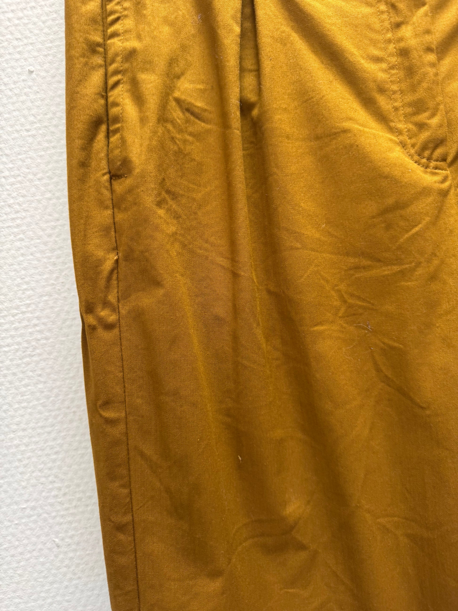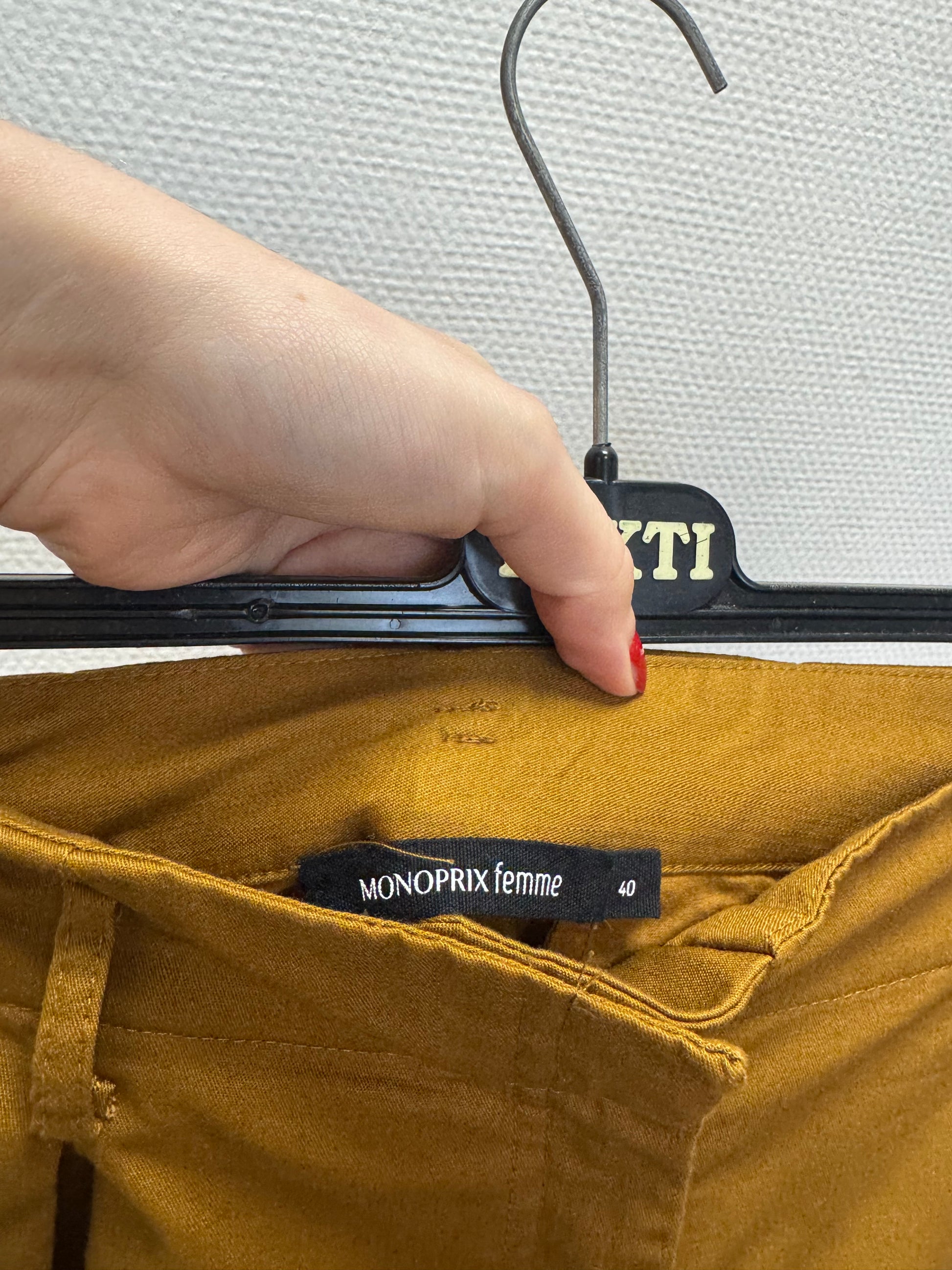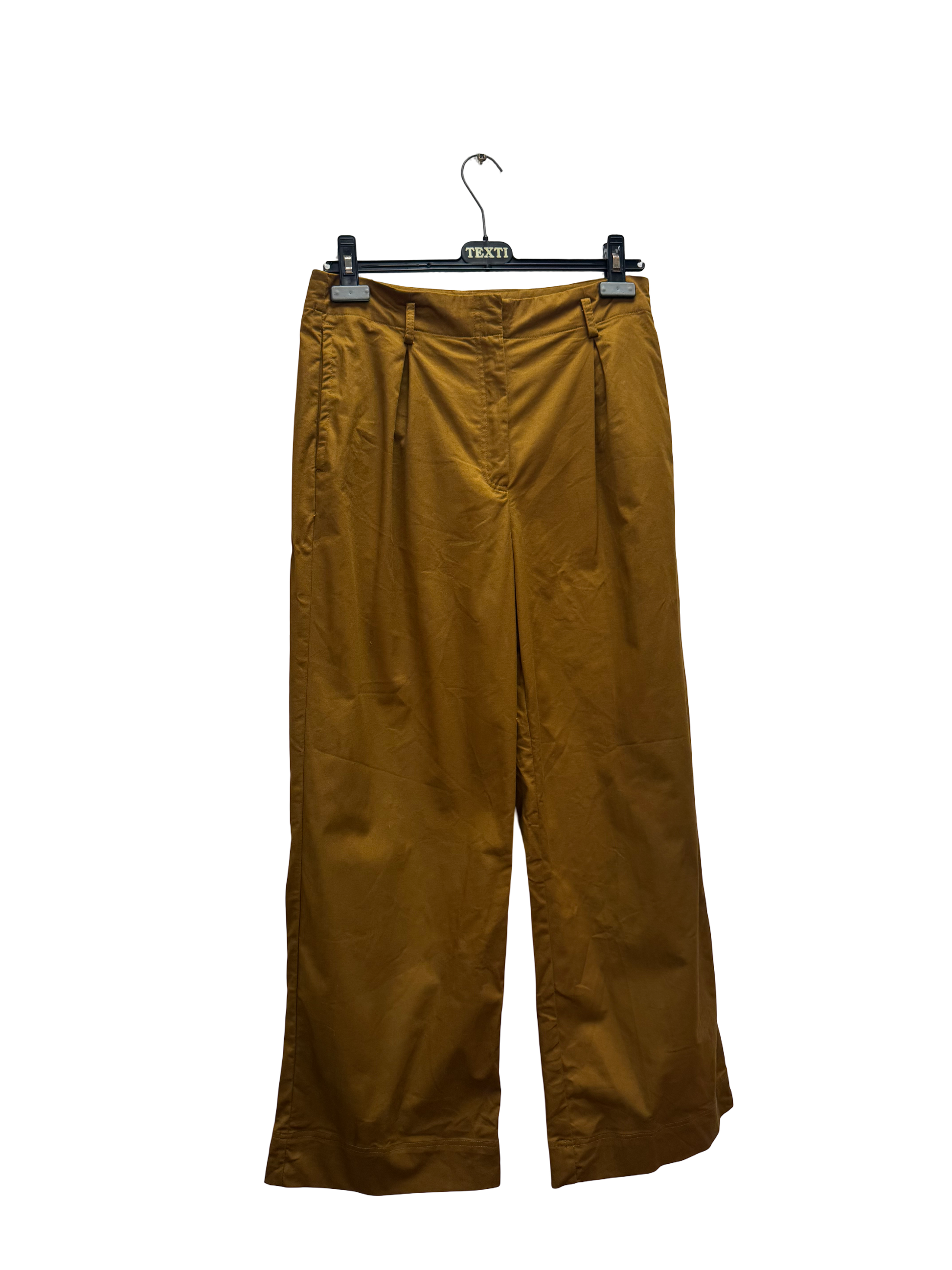 Pantalon marron, jambe large, deux poches, passant, pour une ceinture.