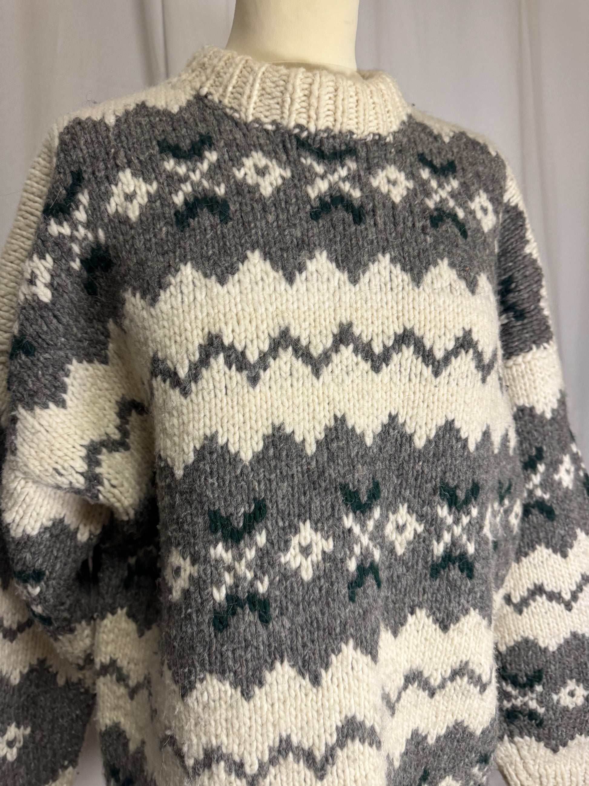 Pull épais écrue, motifs géométrique, vert foncé et gris,