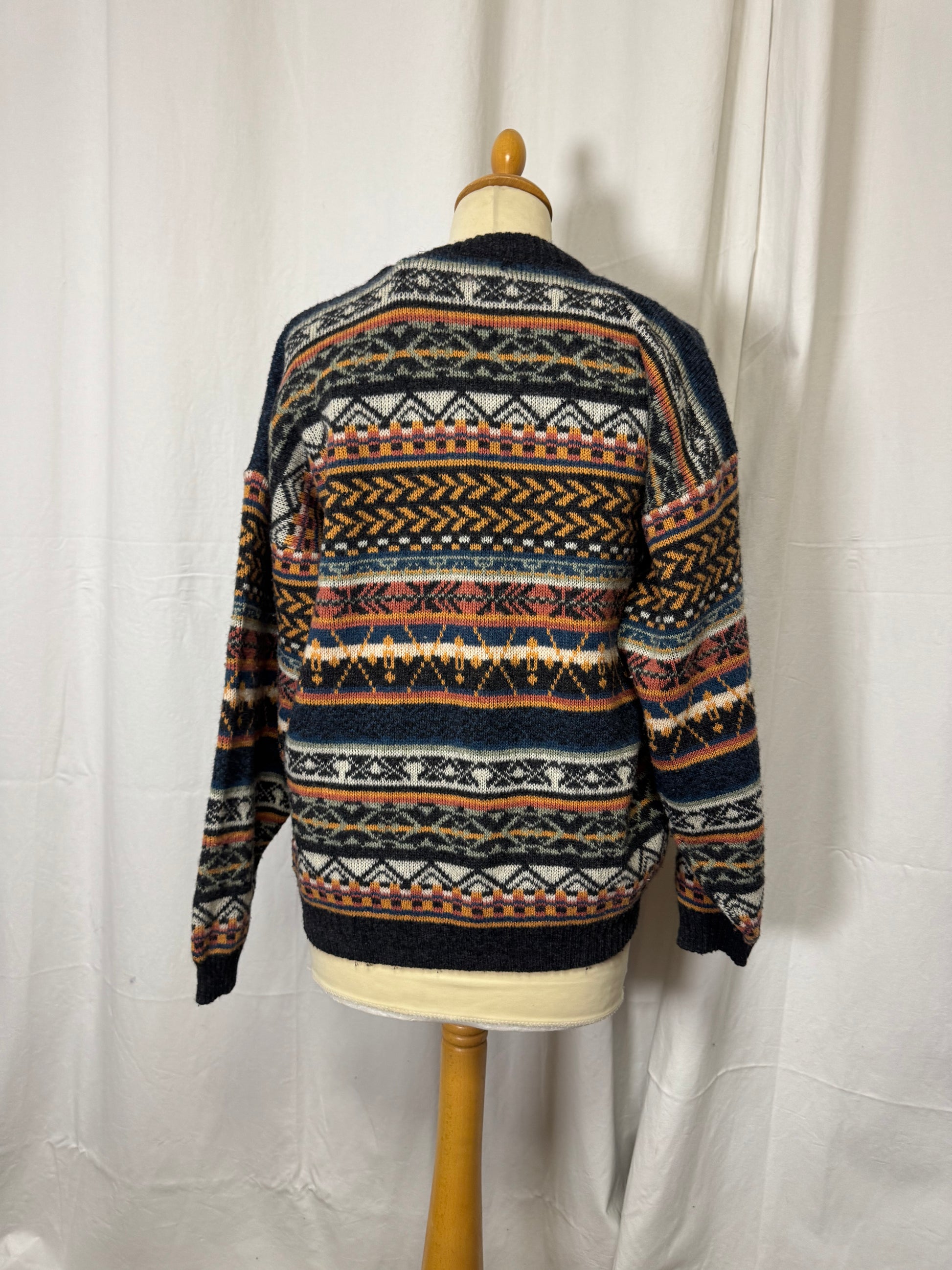 Pull à motifs des années 90, motifs géométrique, fond gris, col rond.