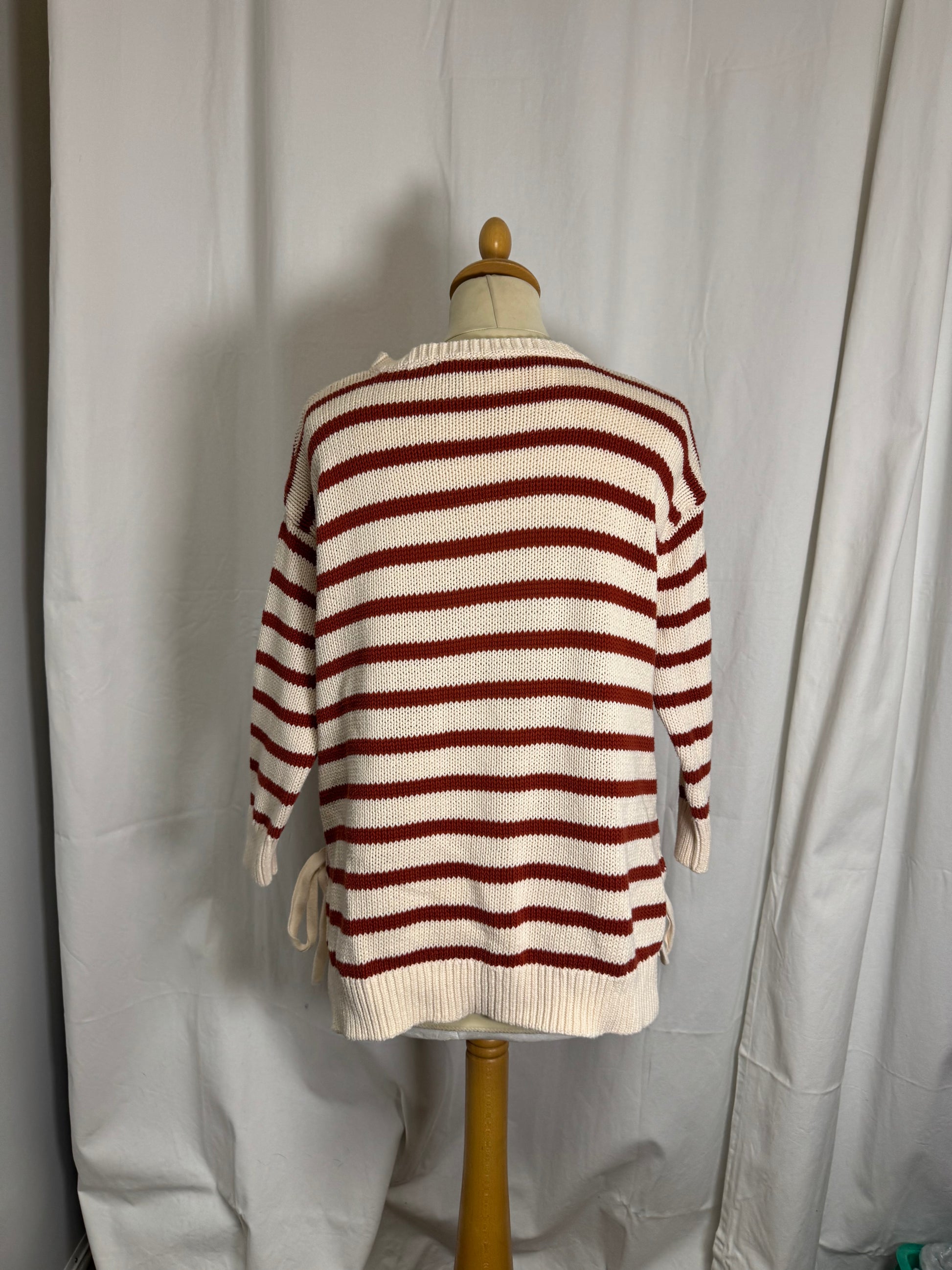 Pull à rayures crème et marron/terra cota, col rond, fentes fermé par des liens sur le bas.
