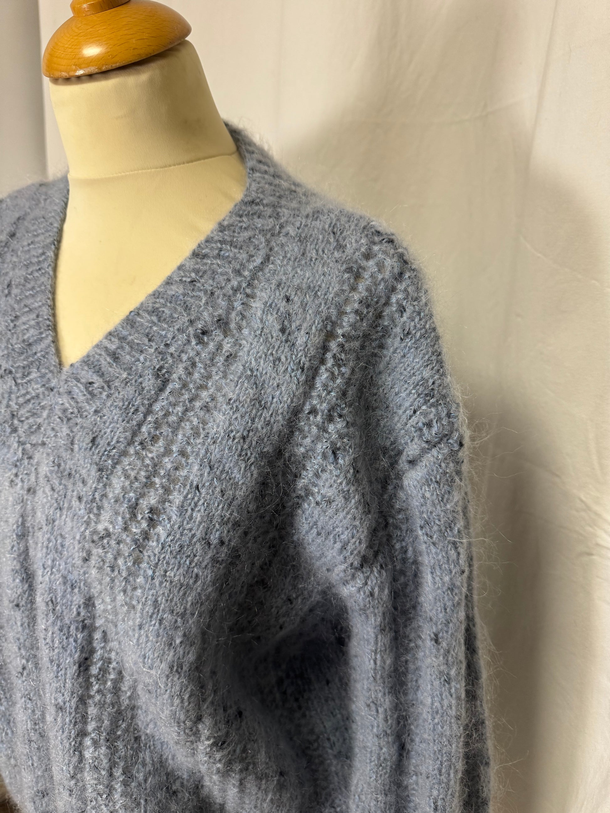 Pull en maille bleu clair, chiné noir, col v, légèrement ajourée.