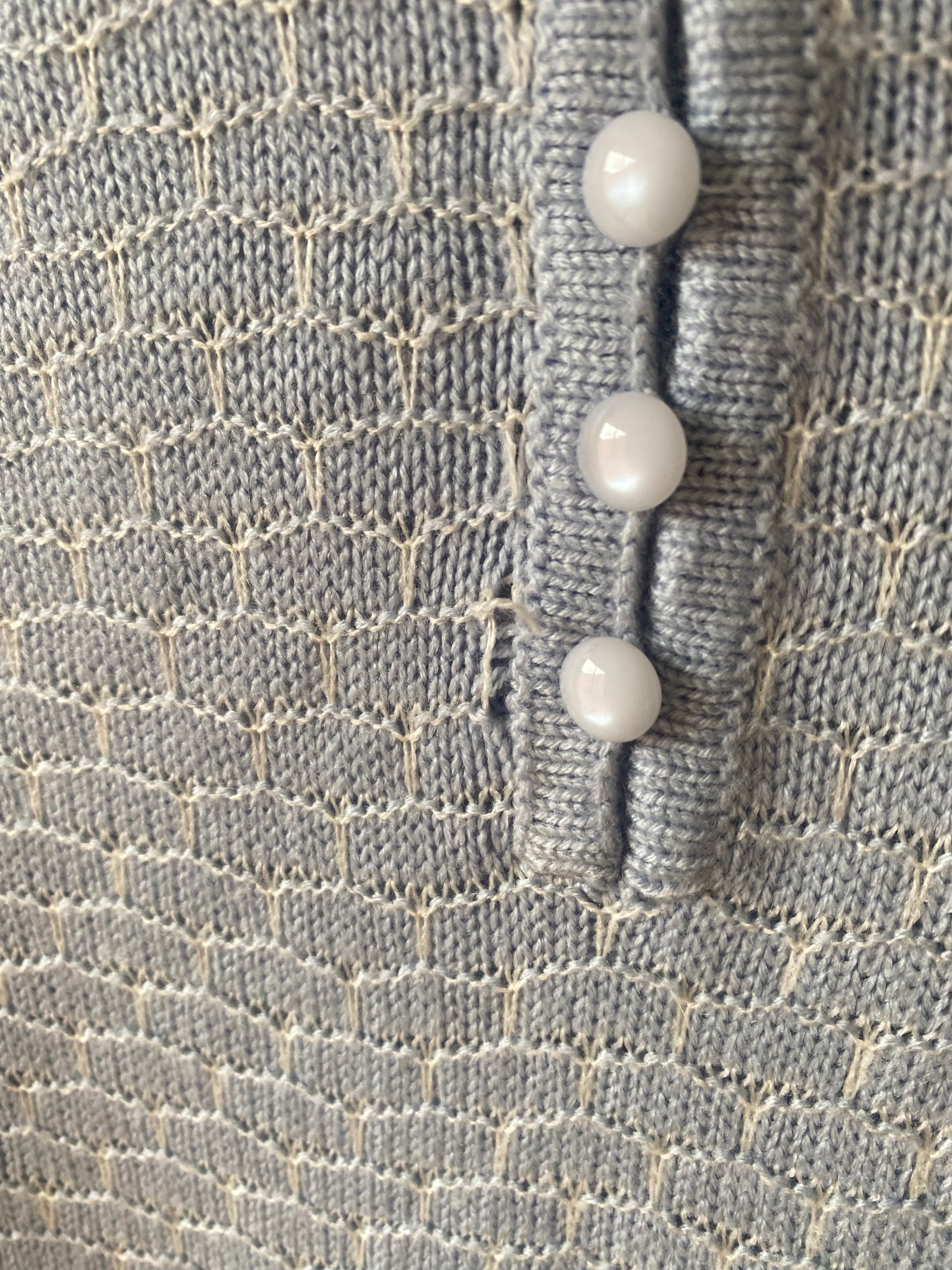 Pull fin en maille bleu et blanche, effet motif géométrique, six boutons sur le col.