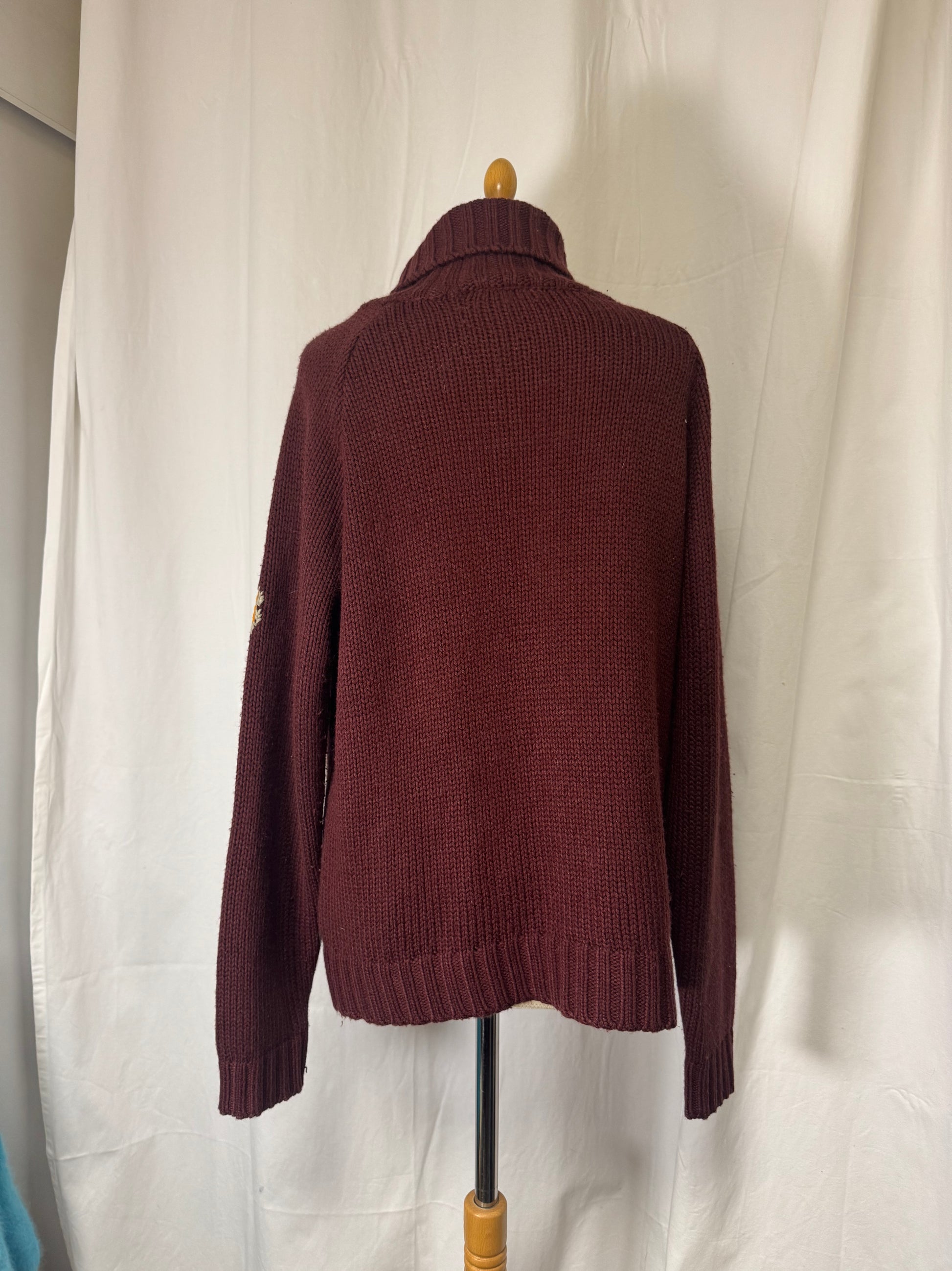 Pull col roulé, bordeaux, fleurs multicolores, grosse maille.
