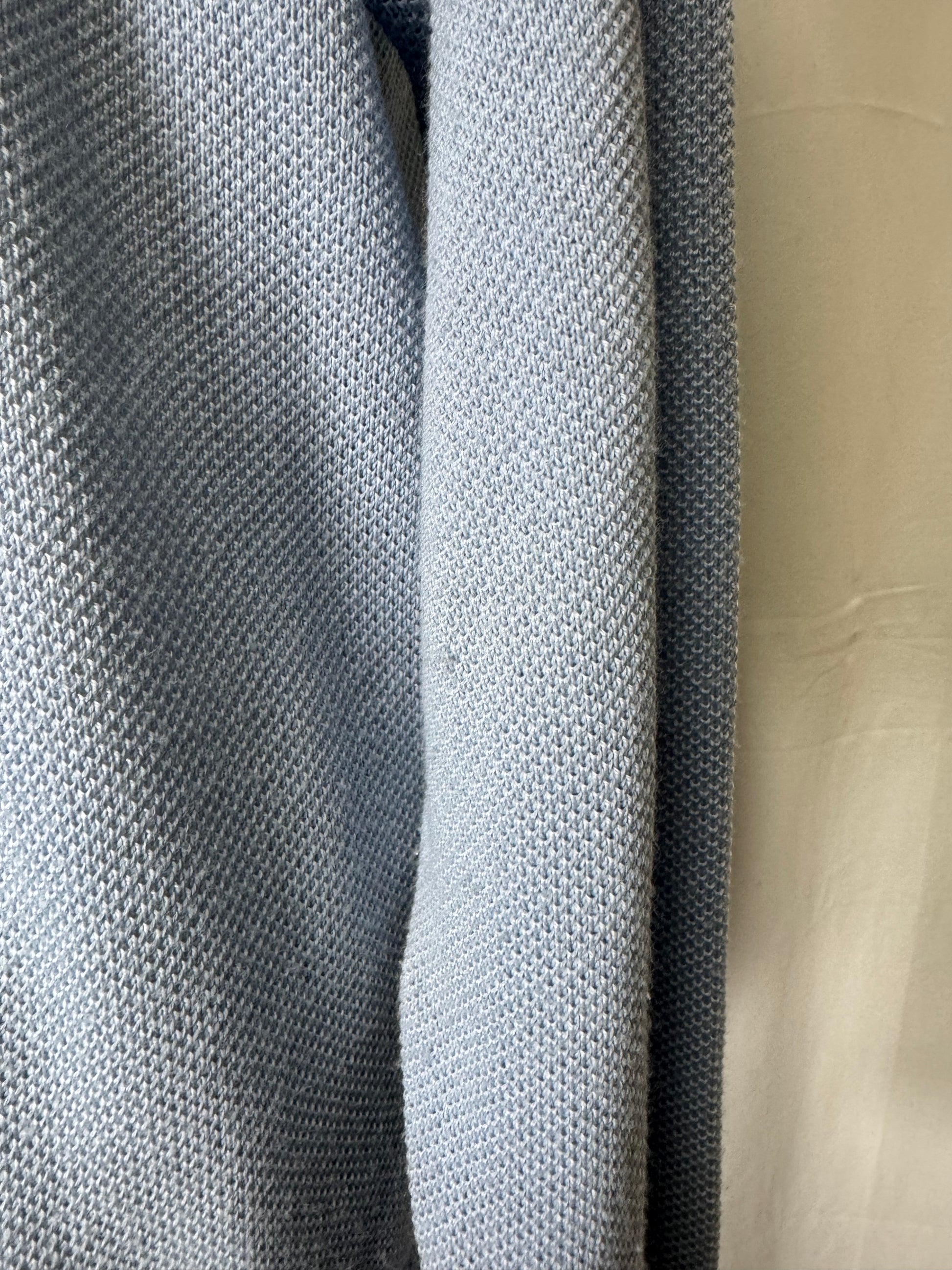 Pull en maille bleu clair, col v, écusson sur l'avant.
