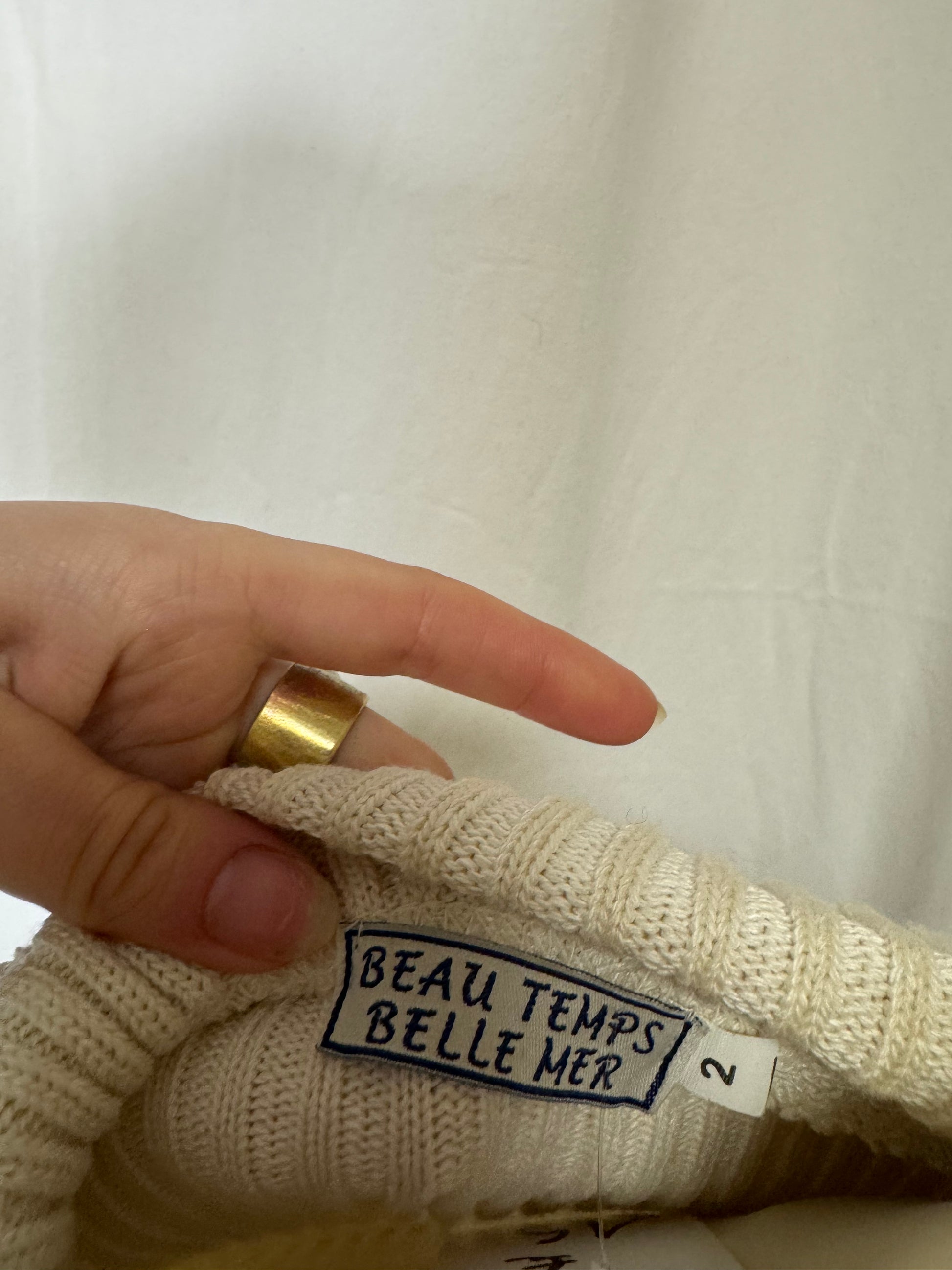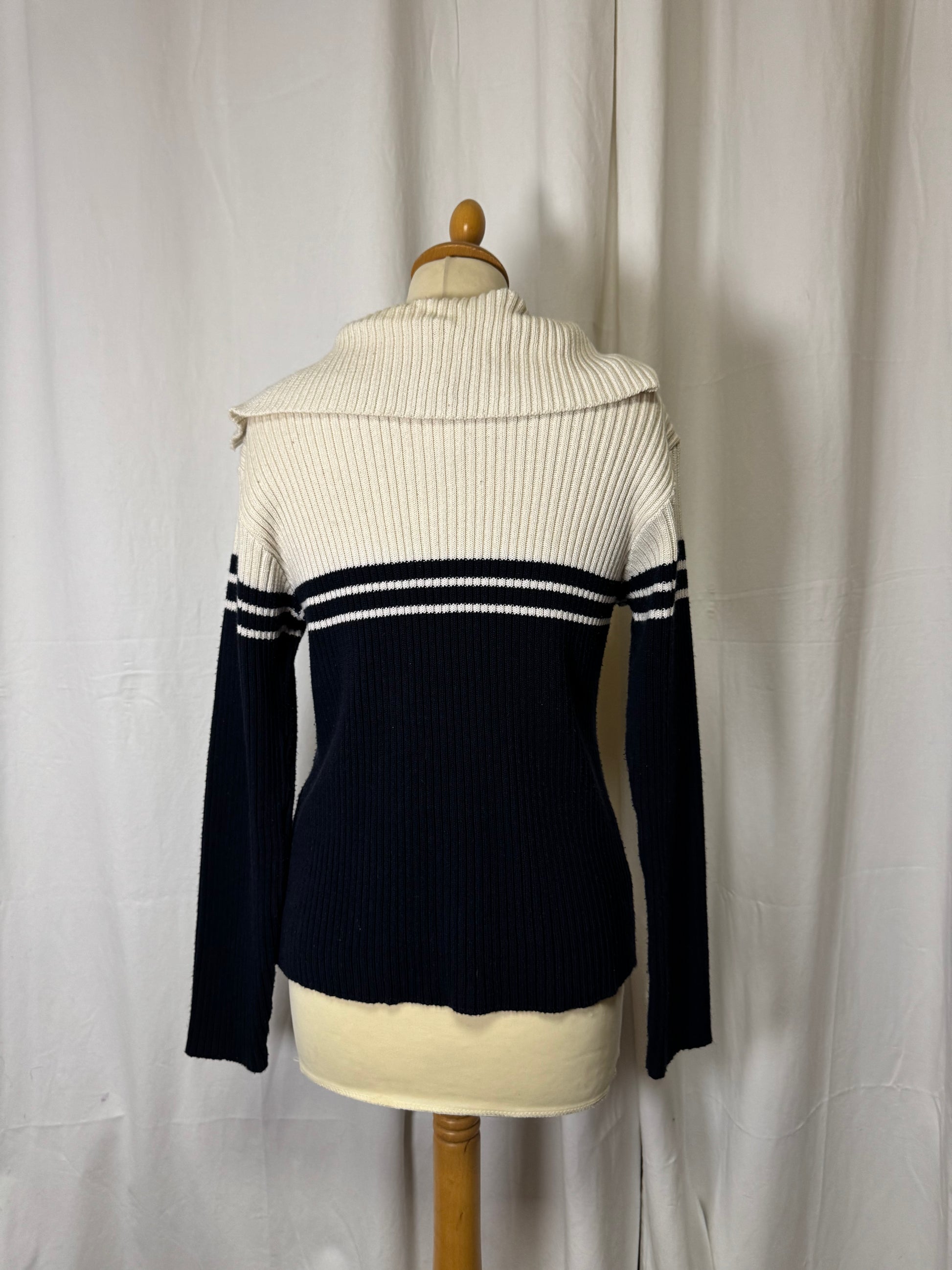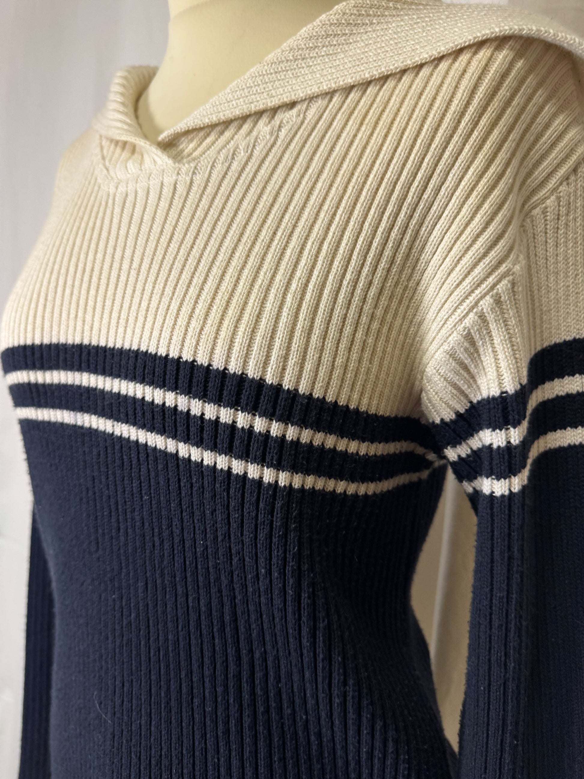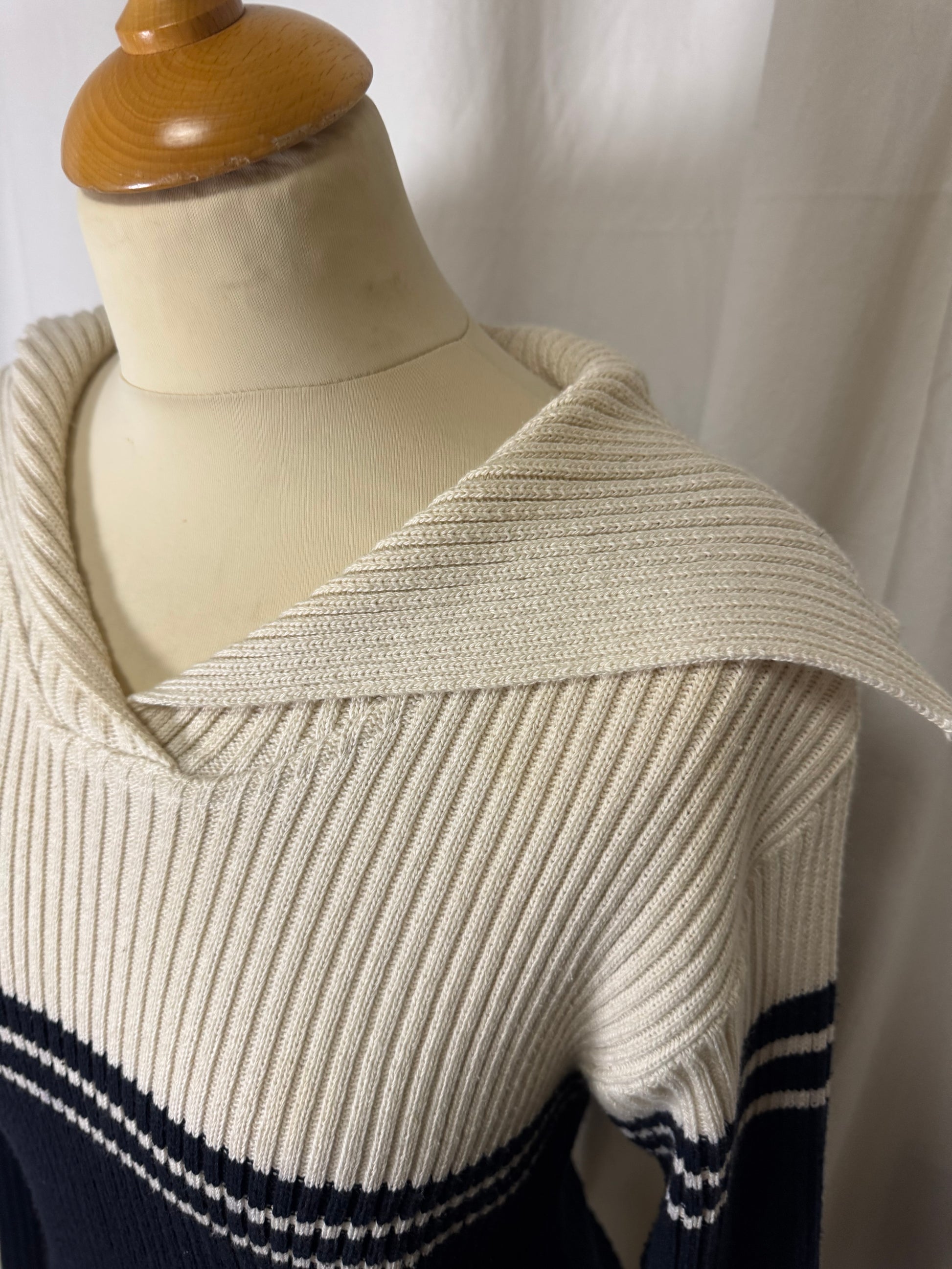 Pull bicolore crème et bleu marine, grand col marin, moulant.