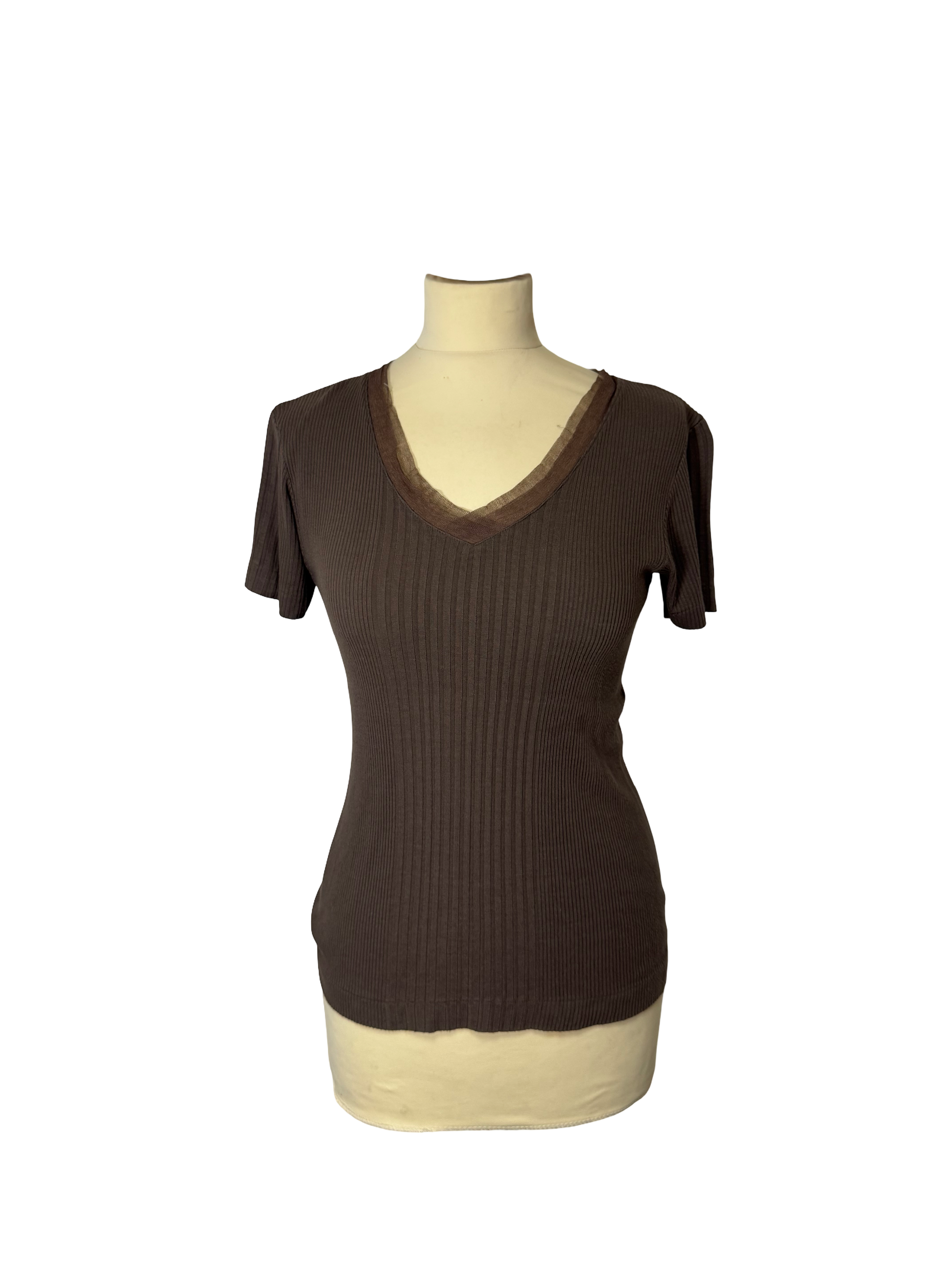 Pull moulant à manches courtes, tissu transparent sur le col v, côtelé, marron.