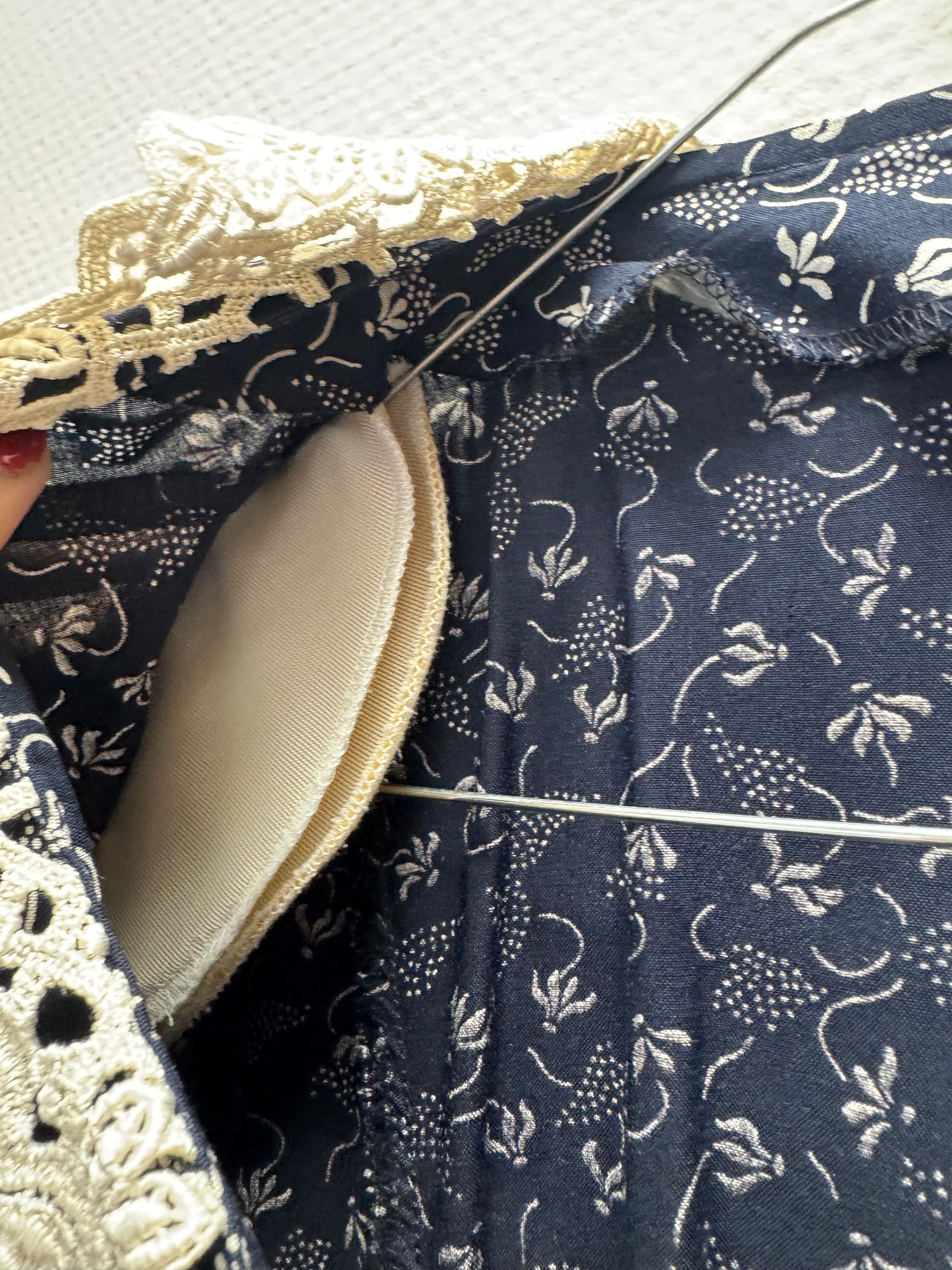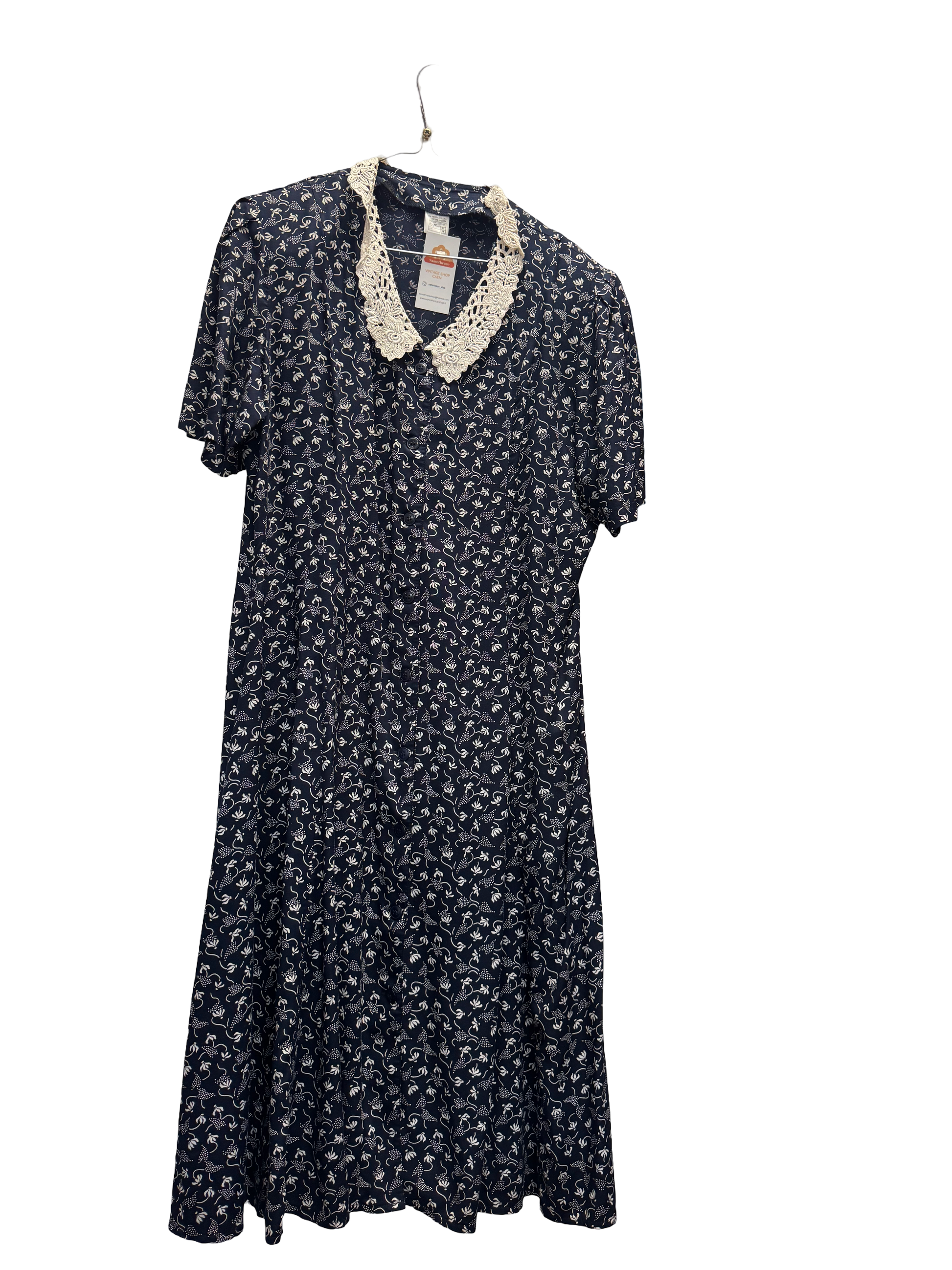 Robe longue, manches courtes, dentelle sur le col, entièrement boutonnée, bleu marine et motifs floraux blanc, fluide, épaulette (peuvent s'enlever facilement).