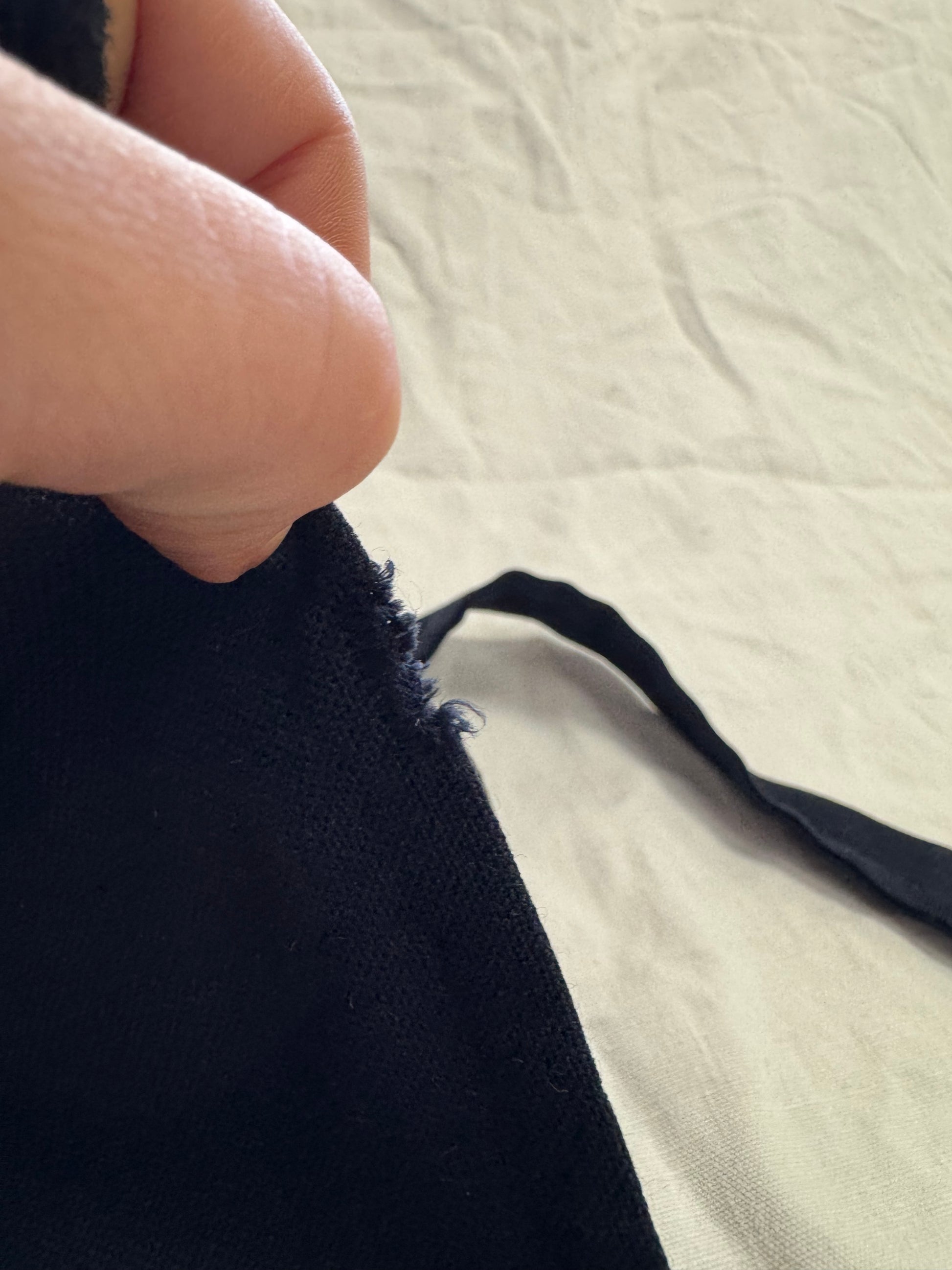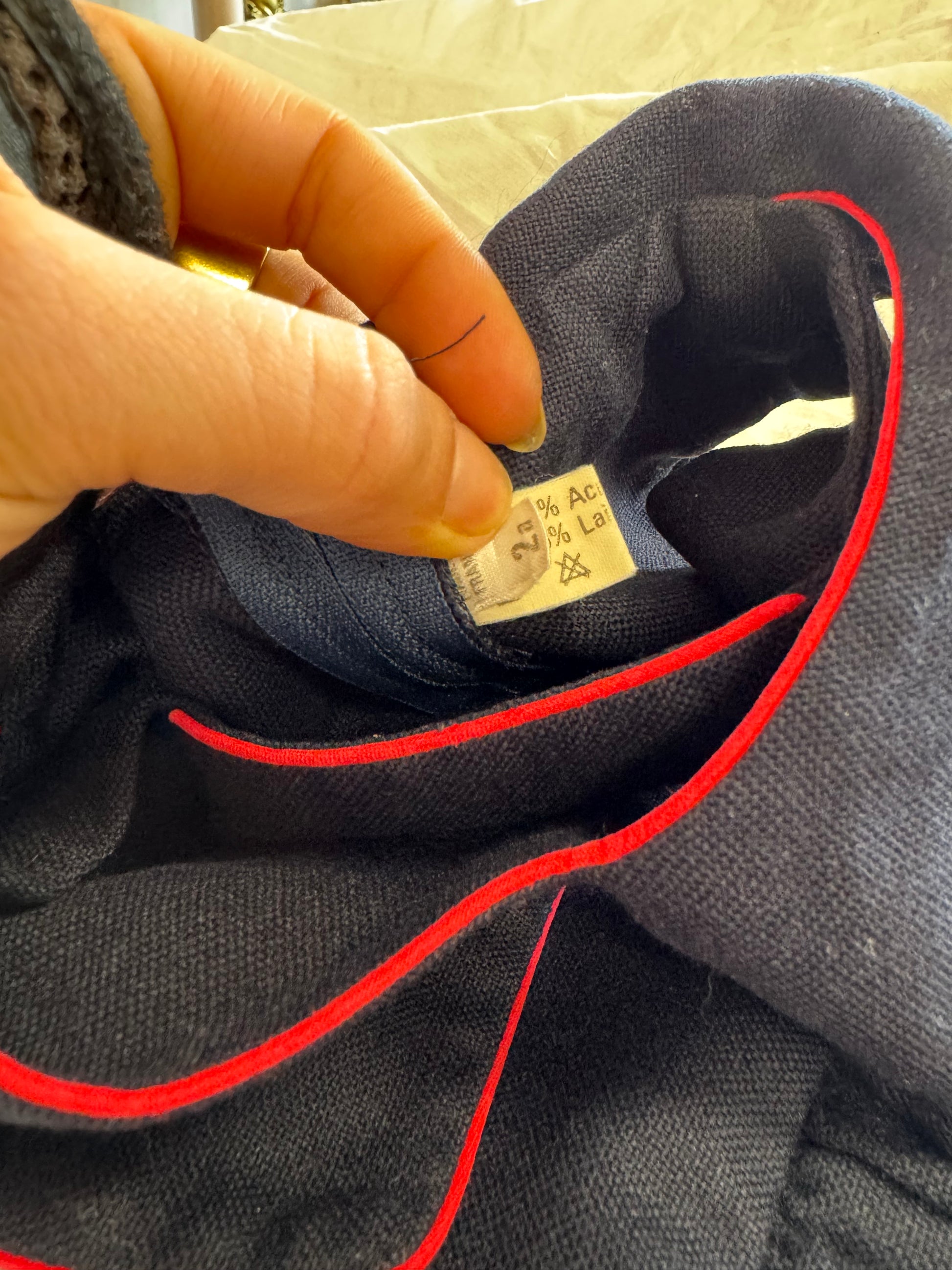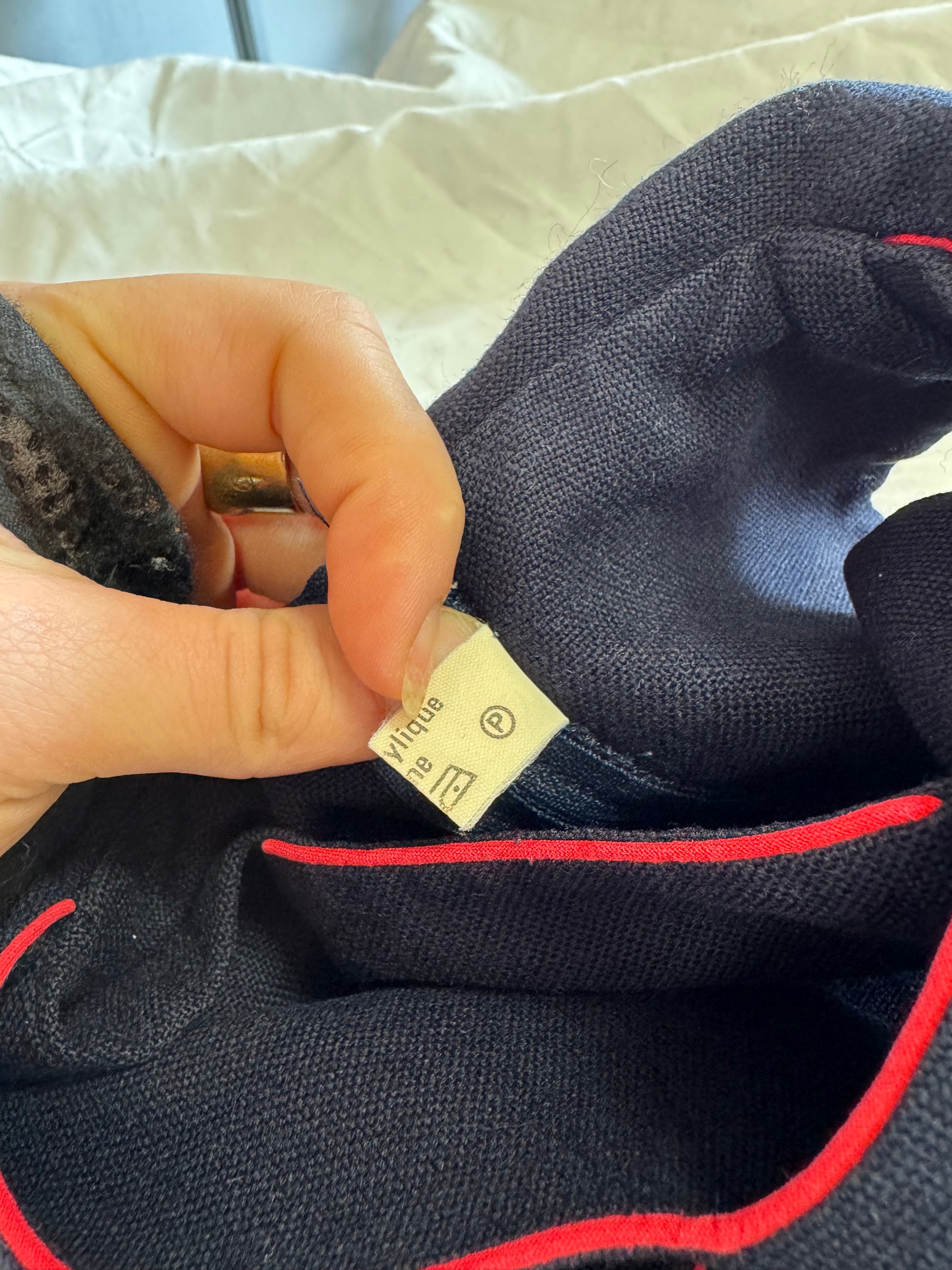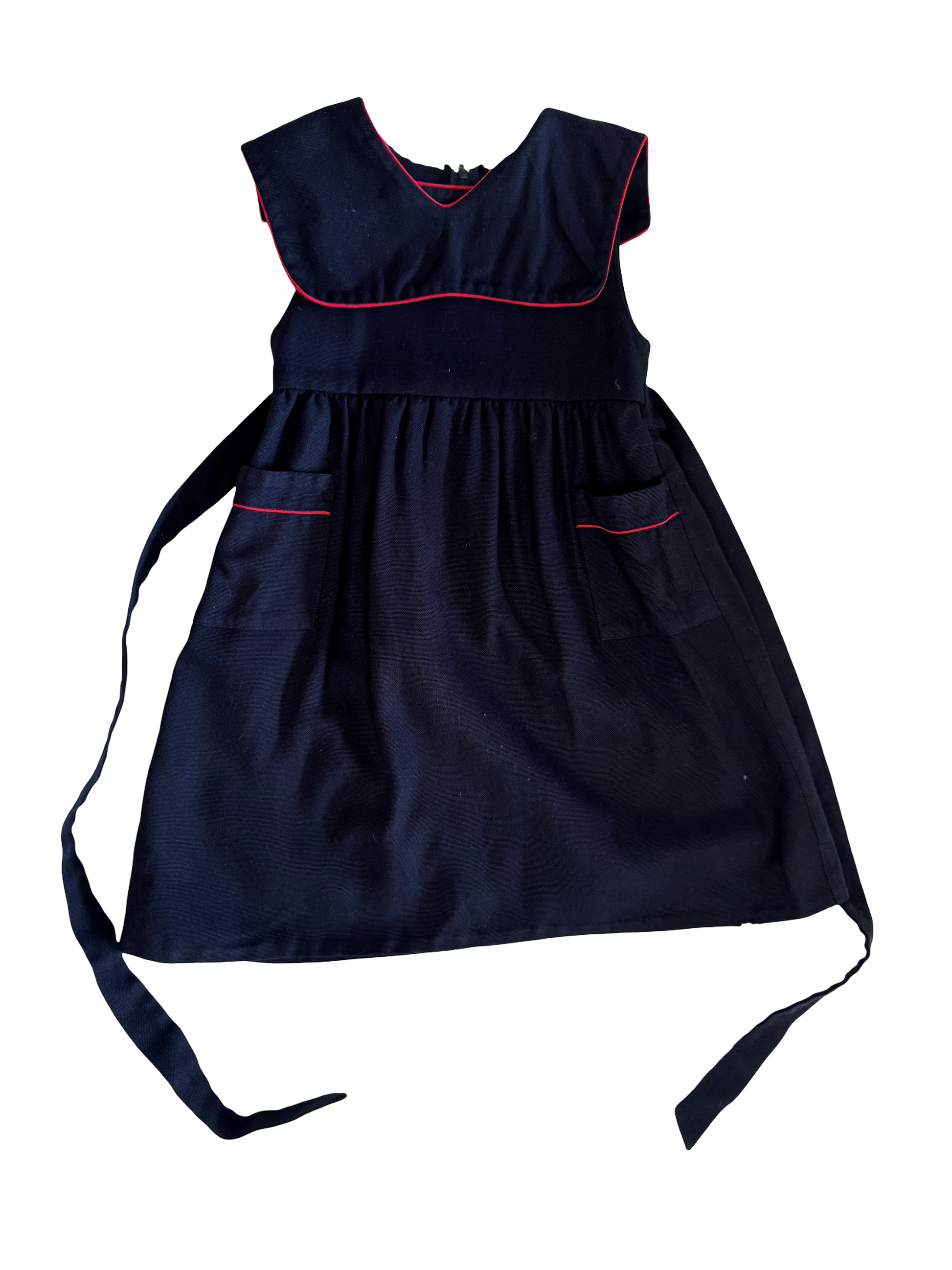 Robe courte sans manche, bleu marine avec liseré rouge, grand col, ceinture intégré, deux poches, fermeture éclair dans le dos.