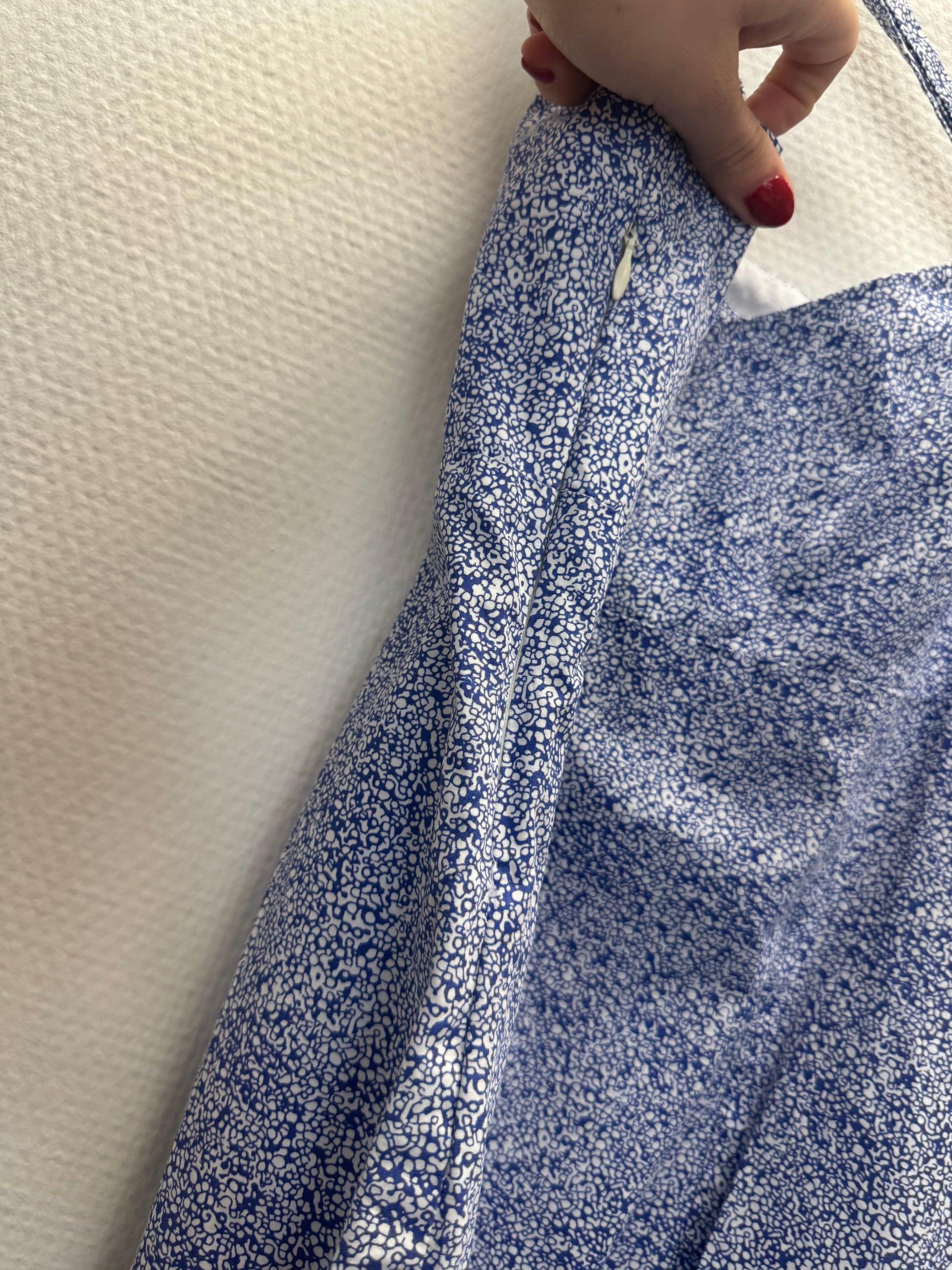 Robe courte à motifs à fleurs, bretelles asymétriques, fermeture éclair sur le côté blanc et bleu.